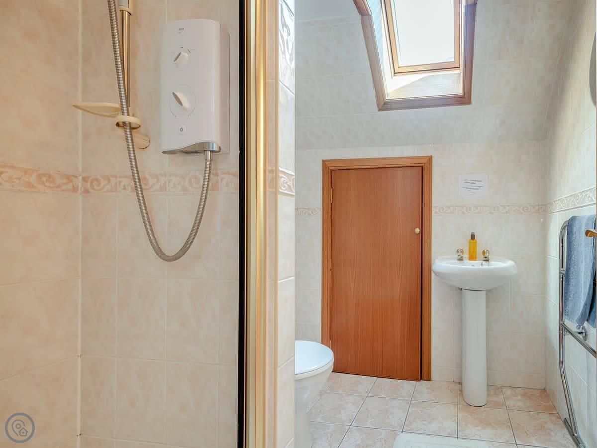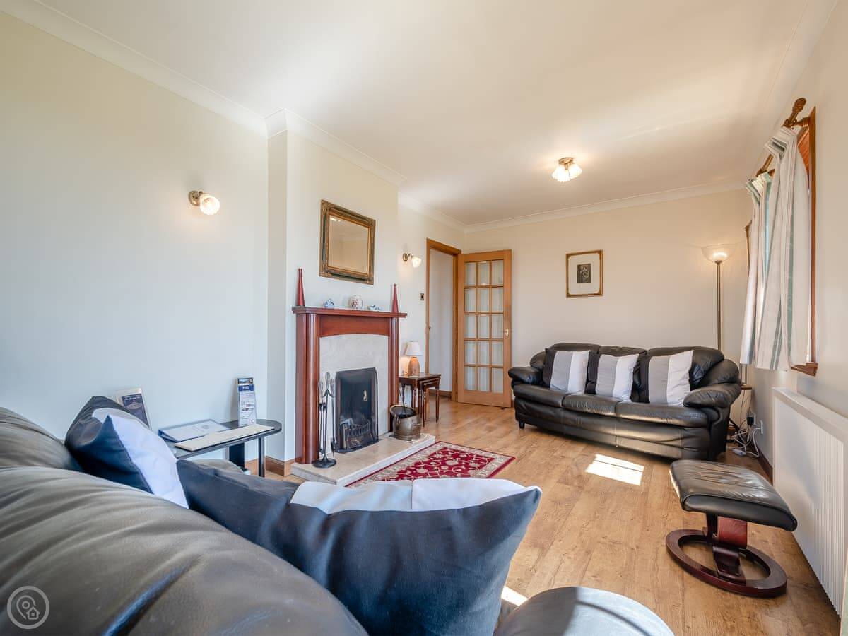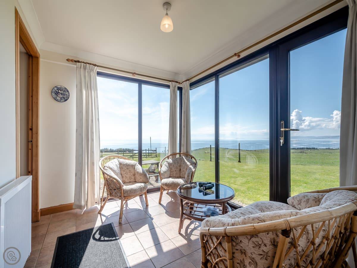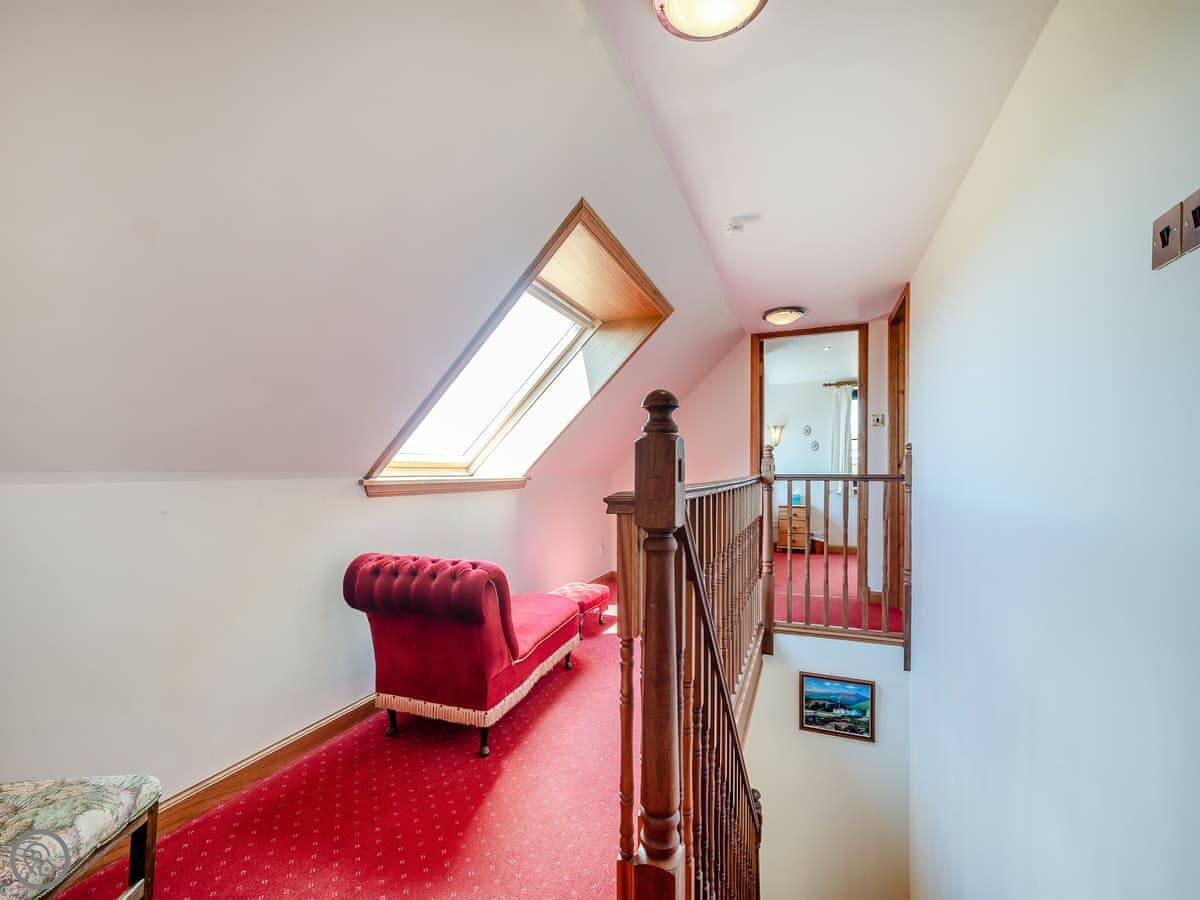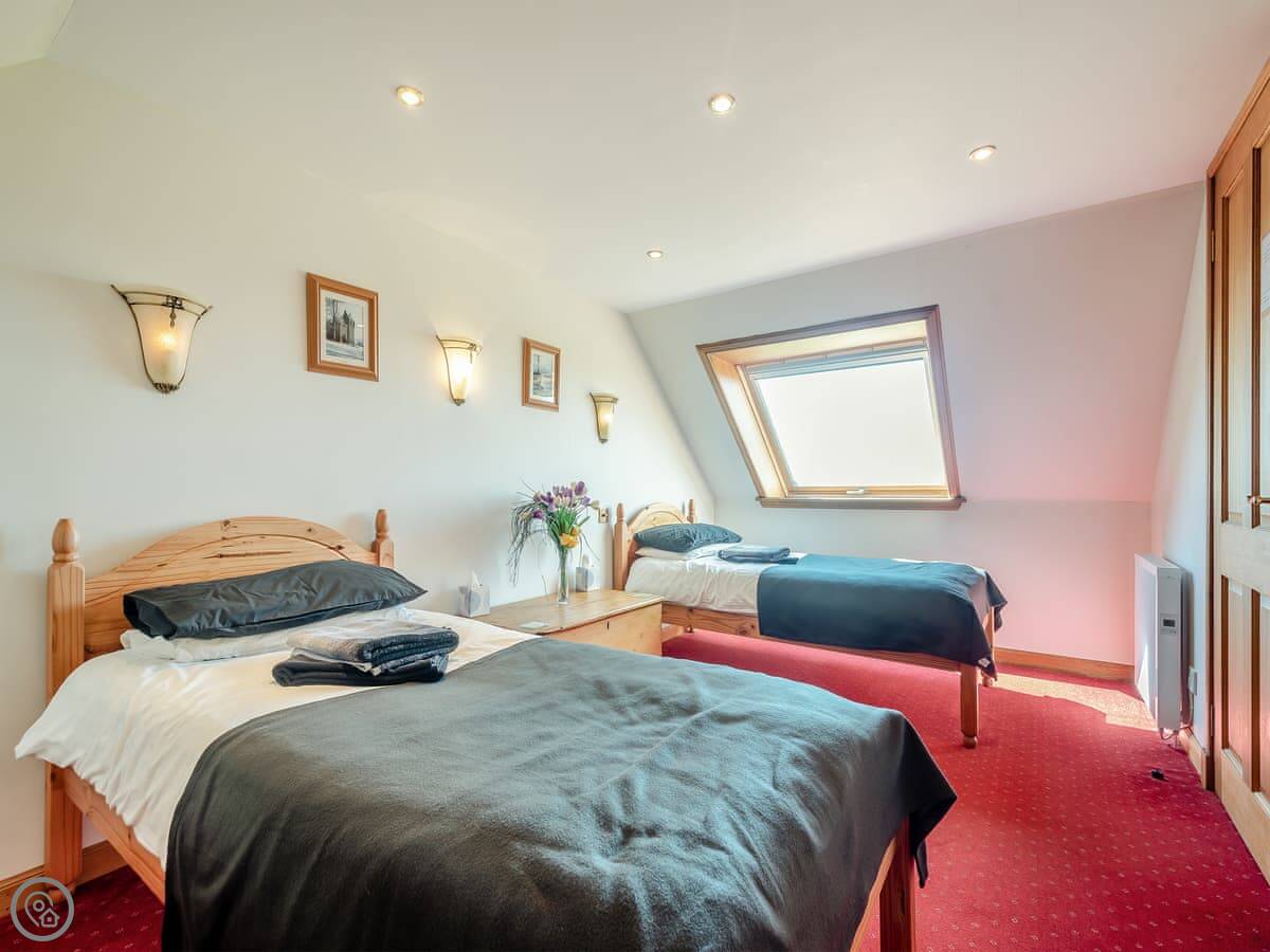 It sleeps six. Three bedrooms, two bathrooms. One double bedroom is on the ground floor. Upstairs there are two twin rooms. The stairs are standard cottage stairs, so they turn a corner and are a bit steep. There's a sunroom at the front which is the best spot for the view.