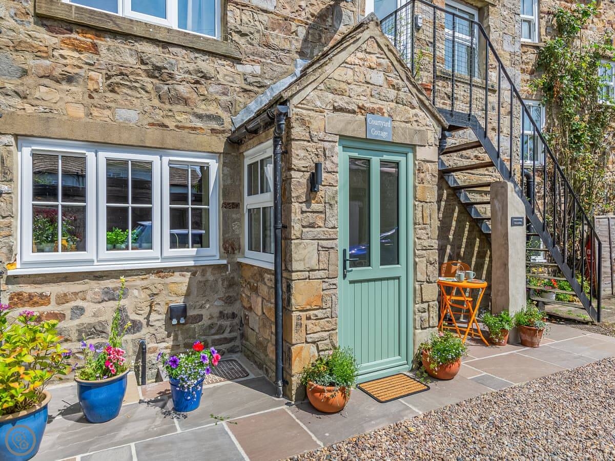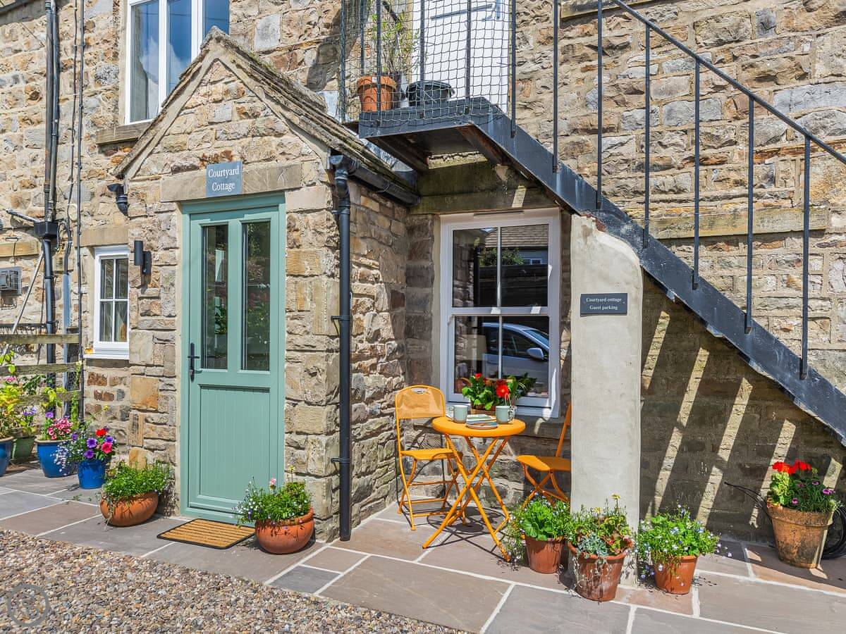Courtyard Cottage is in Reeth, in Swaledale. It's a stone cottage, one of a row. It's ground floor, which is useful. Sleeps two, one bedroom, one bathroom. It's got a 5 Star rating, which means it's well-equipped and finished to a good standard. The bedroom is up two steps from the living area.