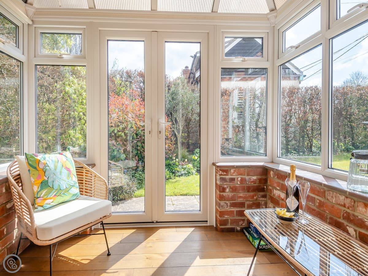 Inside, it's open plan downstairs: kitchen, dining area, and sitting room with a TV. There's a conservatory off the back that leads to the garden. The garden gets the sun in the evening and has a barbecue.