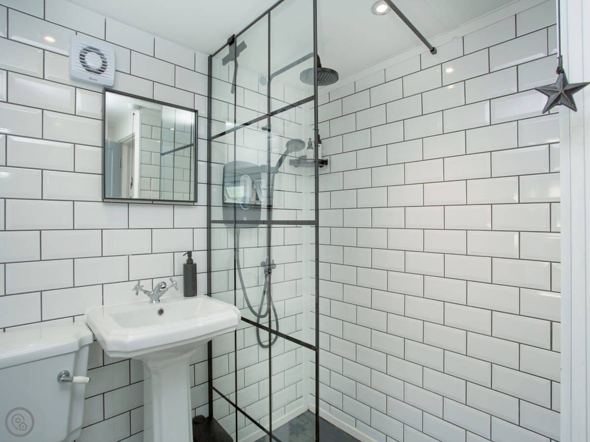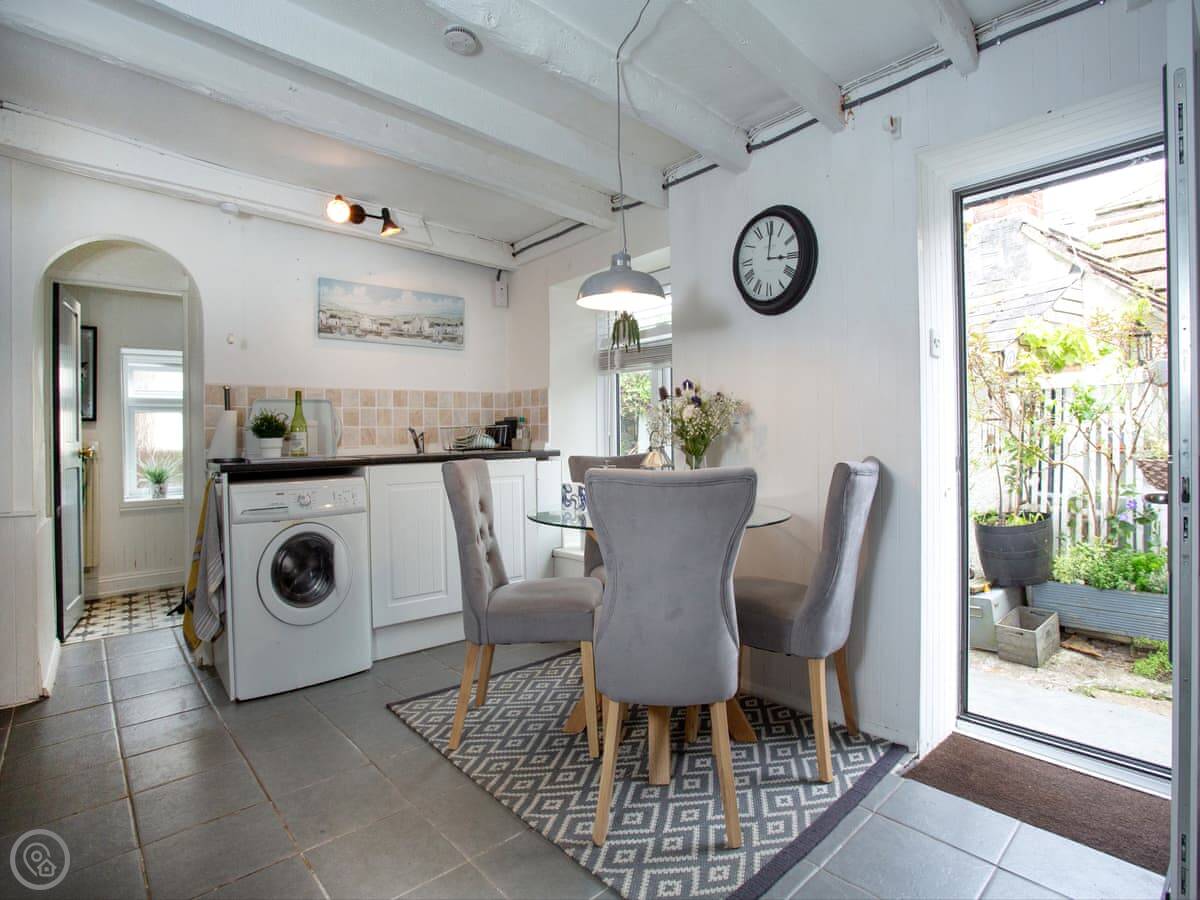Down on the ground floor is the kitchen diner and a modern bathroom with a walk-in shower. Outside is a small courtyard with a table and chairs. You don't get parking with the cottage. You can pull up to unload, but then you'll need to use one of the pay car parks in the village.