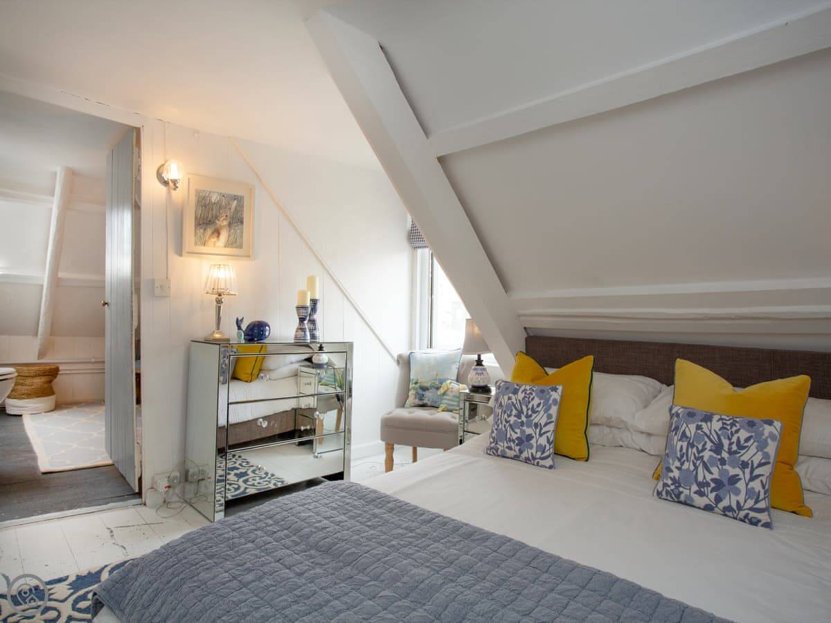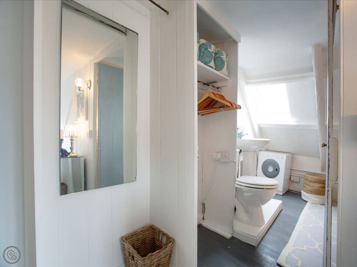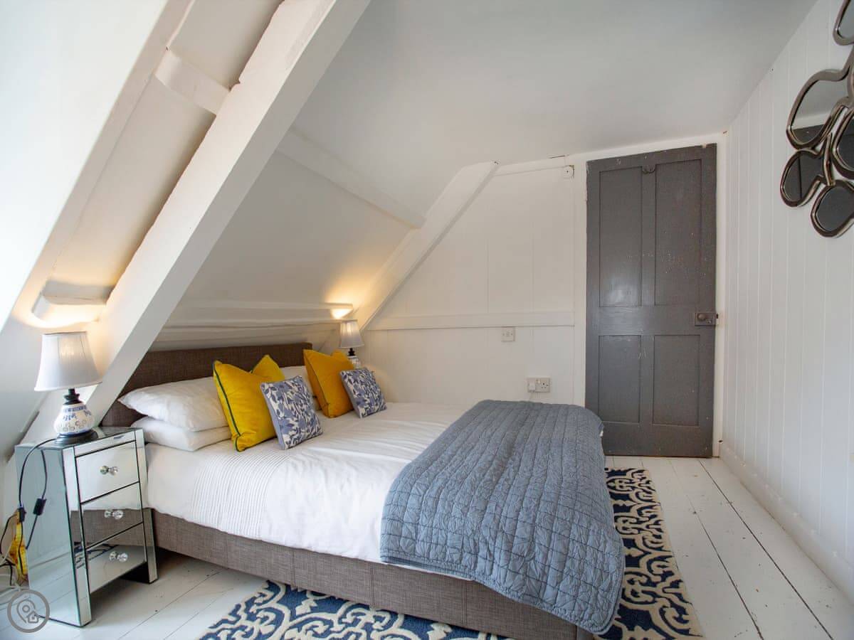 It sleeps four, but there's only one proper bedroom. That's on the top floor. It's a double bed under sloping ceilings. Mind your head on the doorway. There's a small dressing room next to it with a toilet and a tumble dryer.