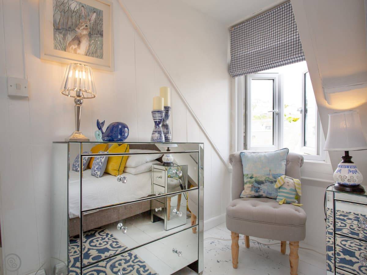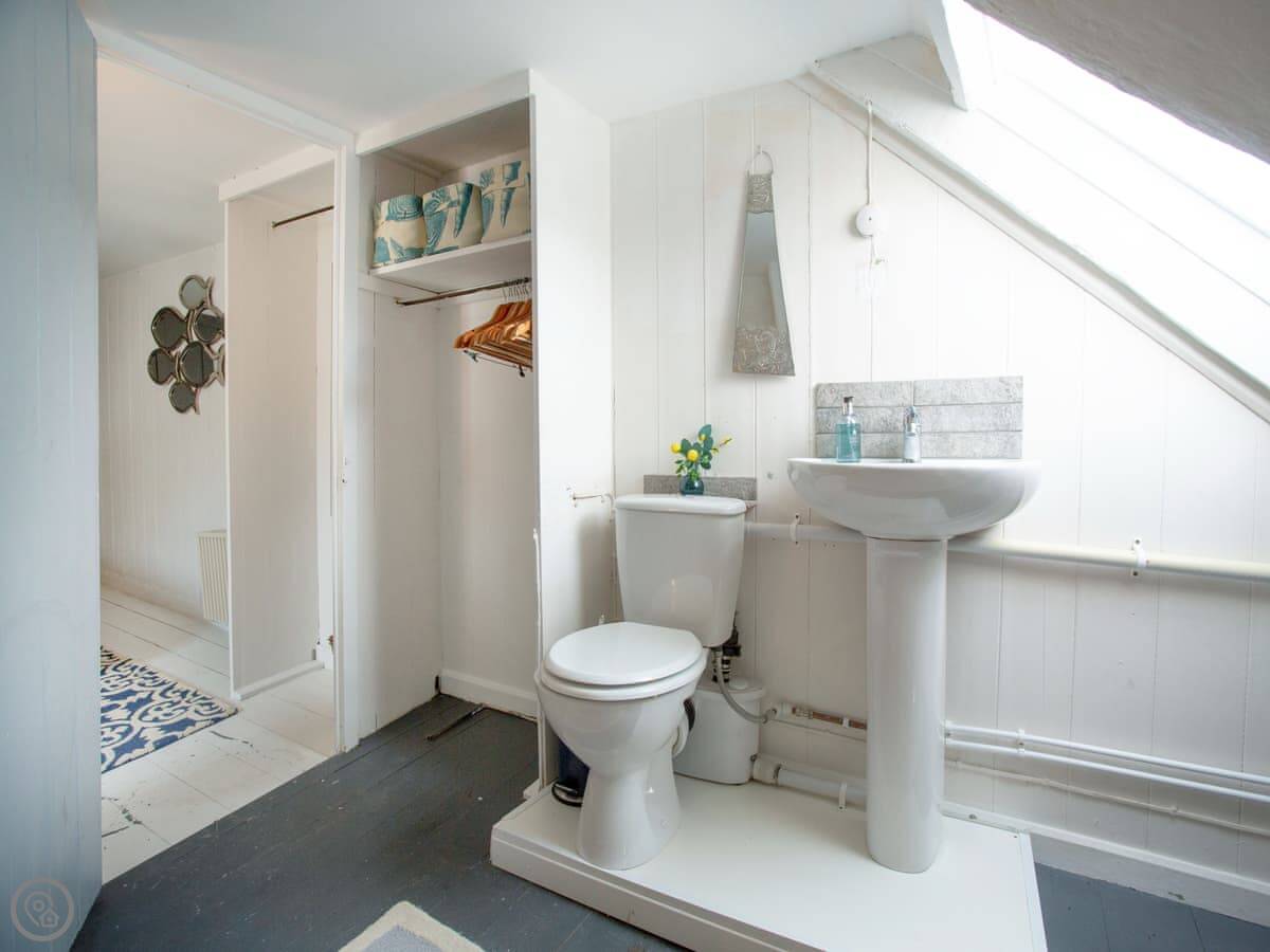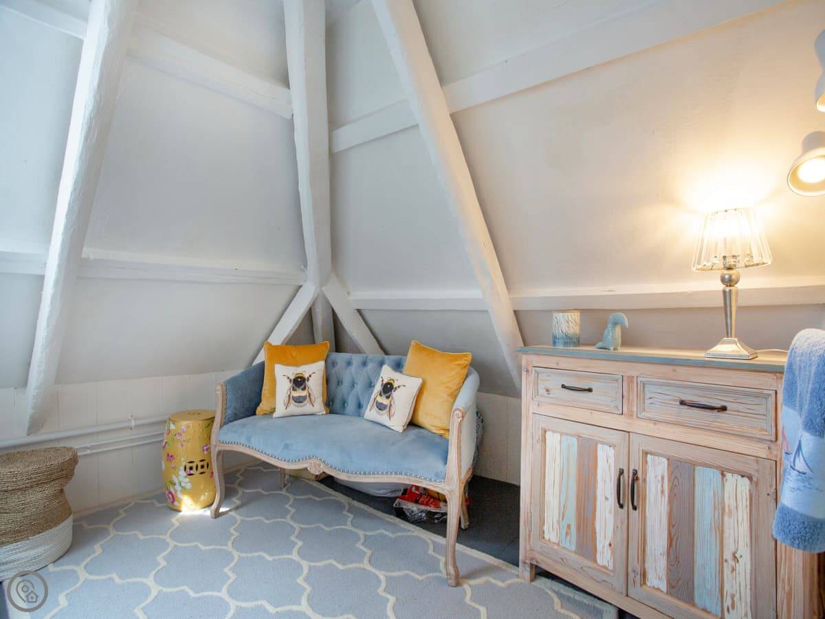 It sleeps four, but there's only one proper bedroom. That's on the top floor. It's a double bed under sloping ceilings. Mind your head on the doorway. There's a small dressing room next to it with a toilet and a tumble dryer.