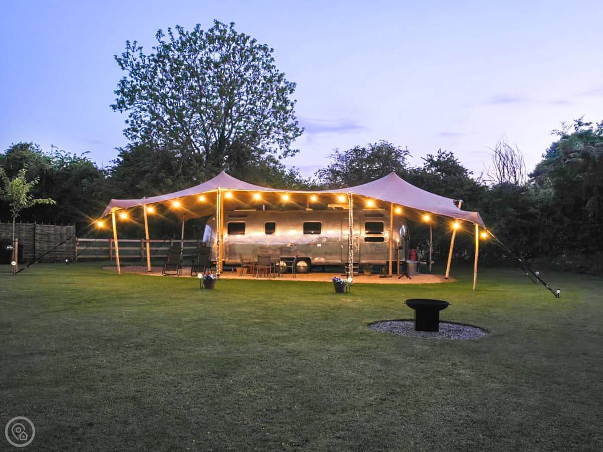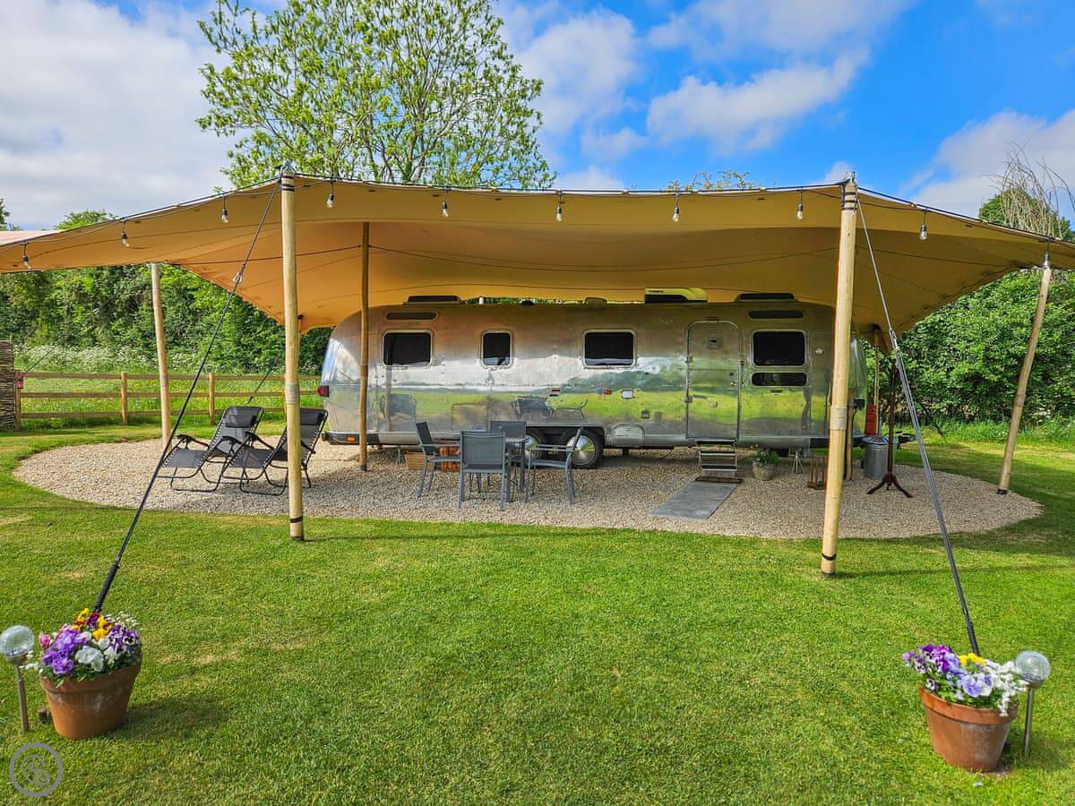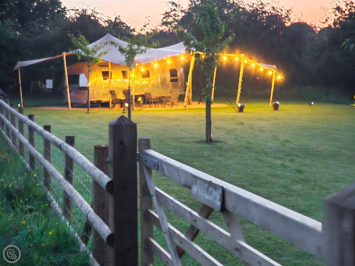 Lanes End Farm Airstream is on our farm in Gastard, near Corsham. It's a single silver airstream trailer parked in a paddock. You look out over fields.