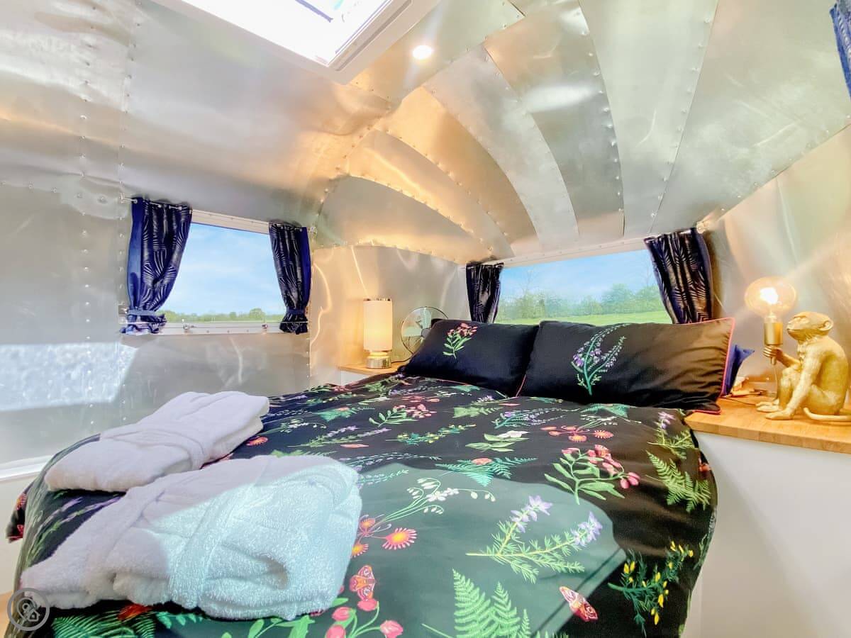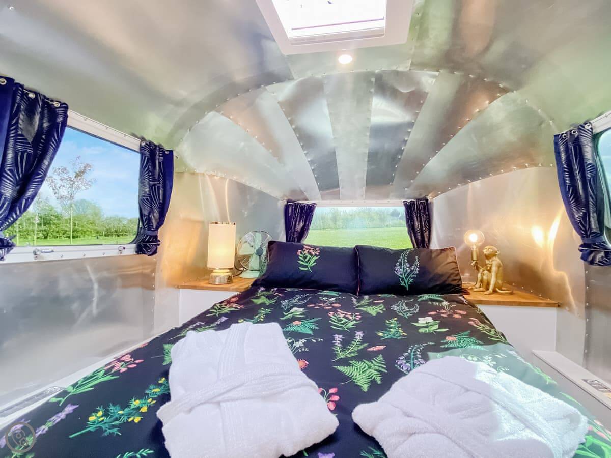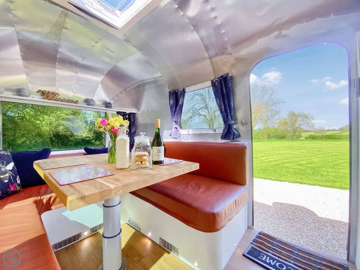 Lanes End Farm Airstream is on our farm in Gastard, near Corsham. It's a single silver airstream trailer parked in a paddock. You look out over fields.
