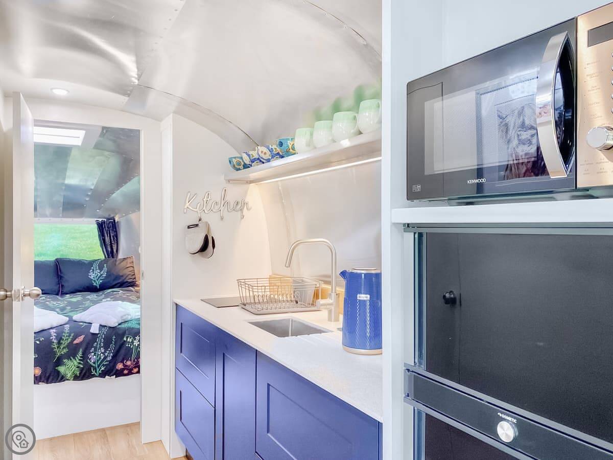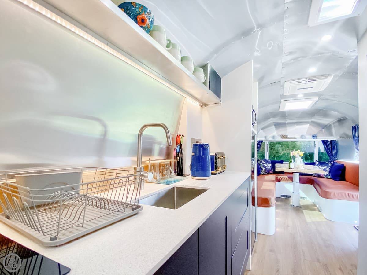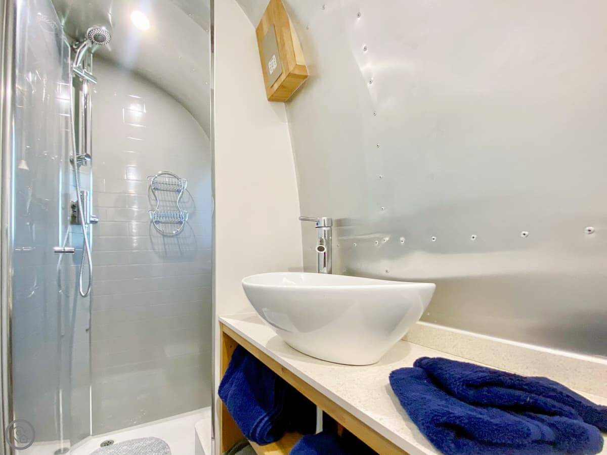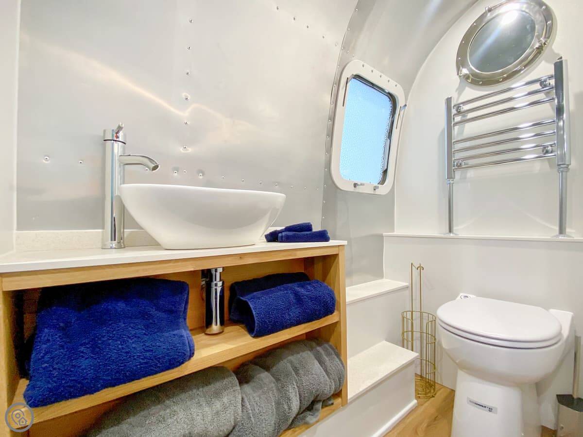 The facilities are what you see. There's a TV, WiFi, your own patio with a table, and parking right next to the airstream. Bedding and towels are included. No pets, sorry, because of the farm animals.