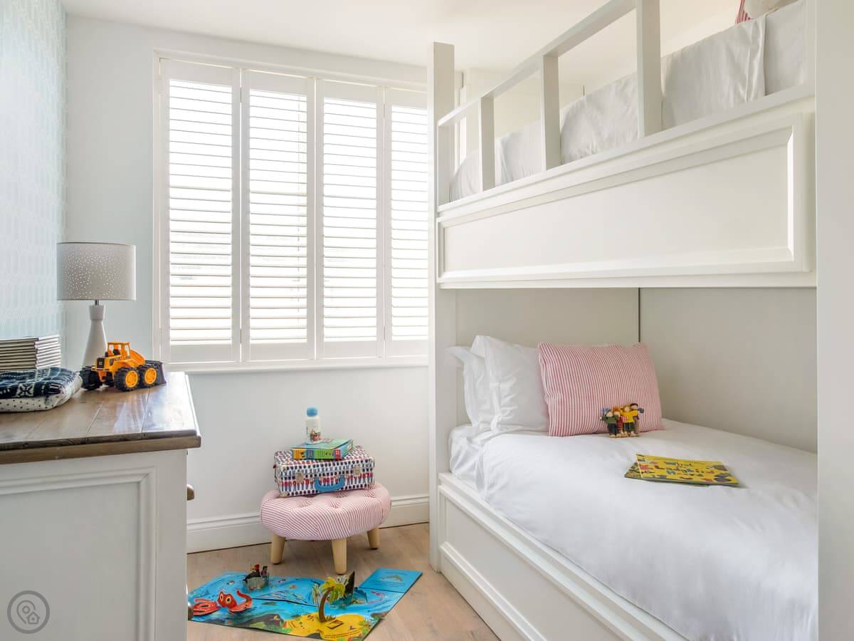 It sleeps six. Four bedrooms, three bathrooms. Two of the bedrooms are en-suite with a king-size bed. There's another king-size and a bunk room for kids. It's got a 5 Star rating, which means it's finished to a high standard and has good facilities.