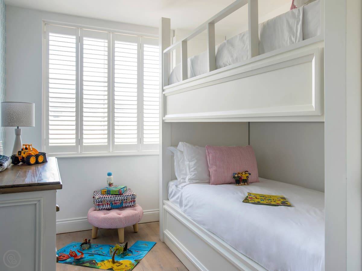 It sleeps six. Four bedrooms, two bathrooms. It's got a 5 Star rating, so it's well-finished. There are two bedrooms with kingsize beds and their own bathrooms, one more kingsize bedroom, and a kids' bunk room with a TV and a PS4.