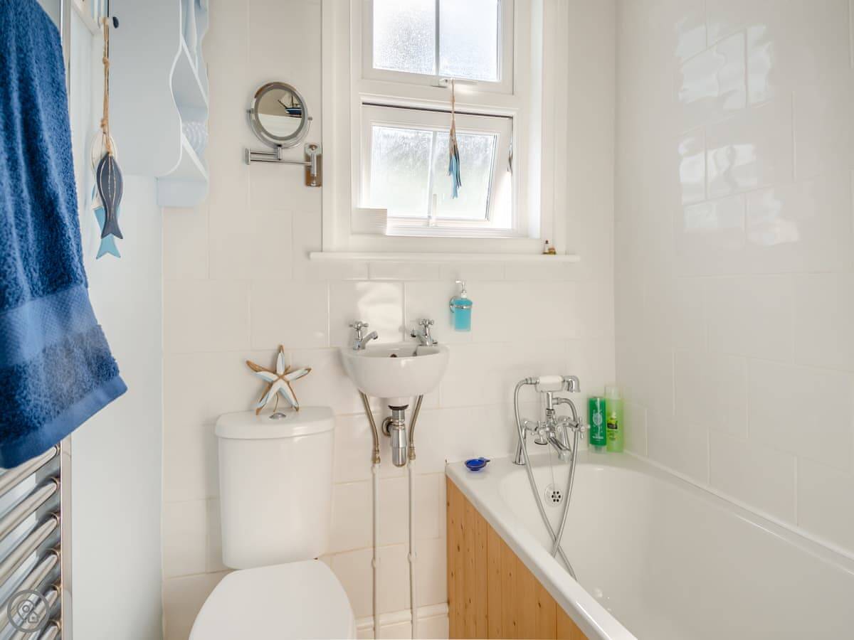 The house sleeps six. Three bedrooms, two bathrooms. One bathroom is on the ground floor. It's a 4 Star rating, which means it's comfortable and well-equipped. The master bedroom has a small balcony with a view of the sea between the houses.