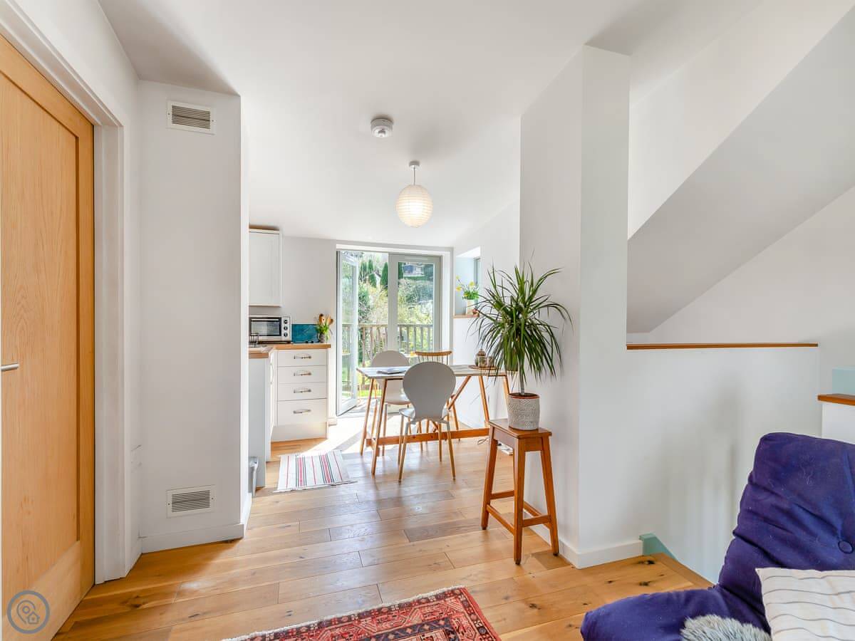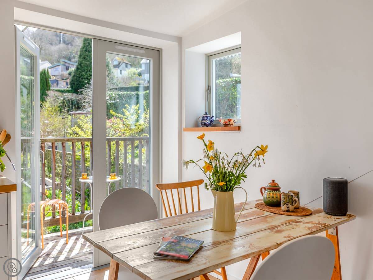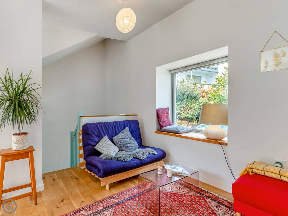 The main thing is the balcony. It's private and looks out over a big forest garden and fields towards Dartmoor. You get the morning sun out there. Inside, the windows are large, so it's light. You can see Totnes Castle from the living area.