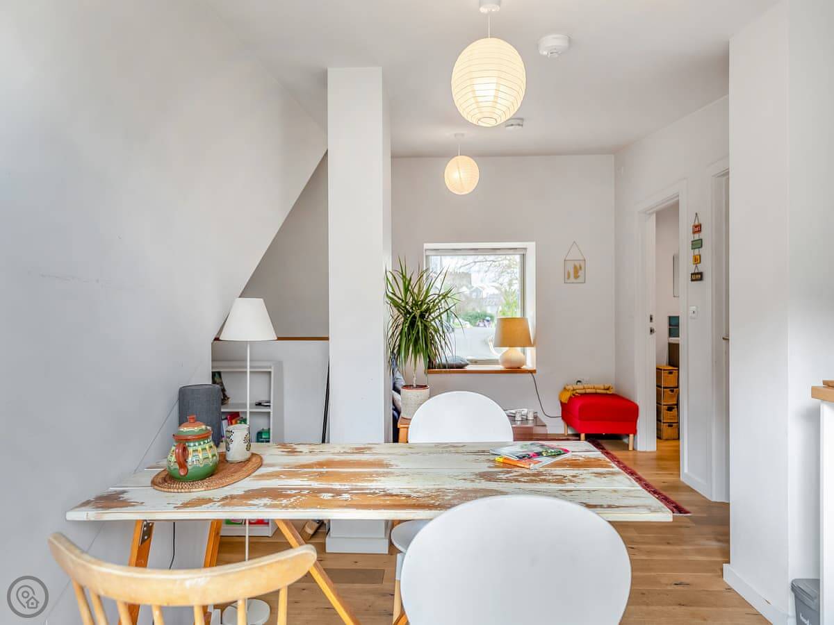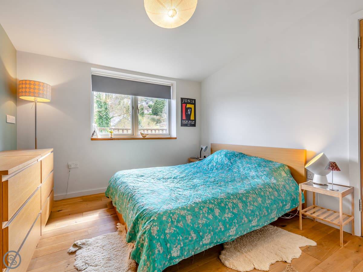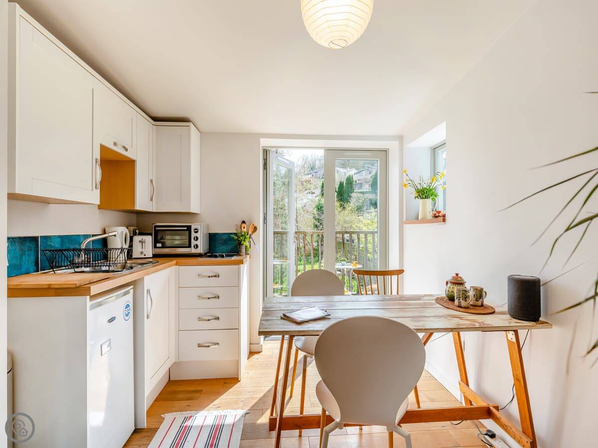 The main thing is the balcony. It's private and looks out over a big forest garden and fields towards Dartmoor. You get the morning sun out there. Inside, the windows are large, so it's light. You can see Totnes Castle from the living area.