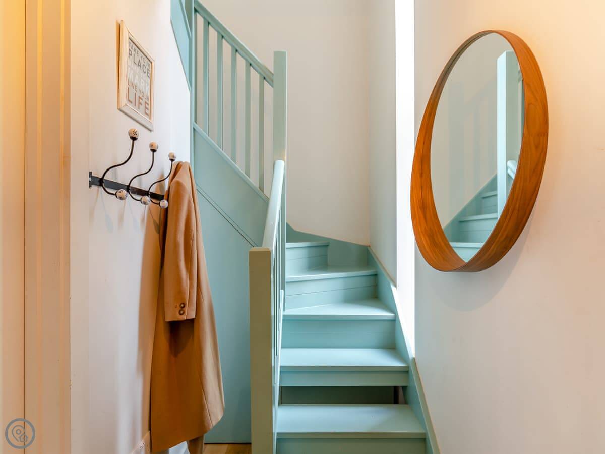 It has a 4 Star rating. That means it's comfortable and well-equipped. The space is open-plan, with a kitchen area at one end and the bed at the other. There's one bathroom. The stairs up to it are external and fairly steep.