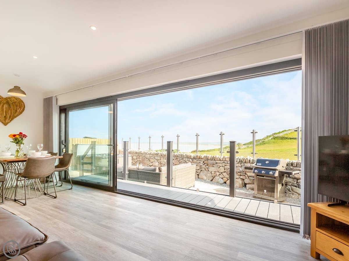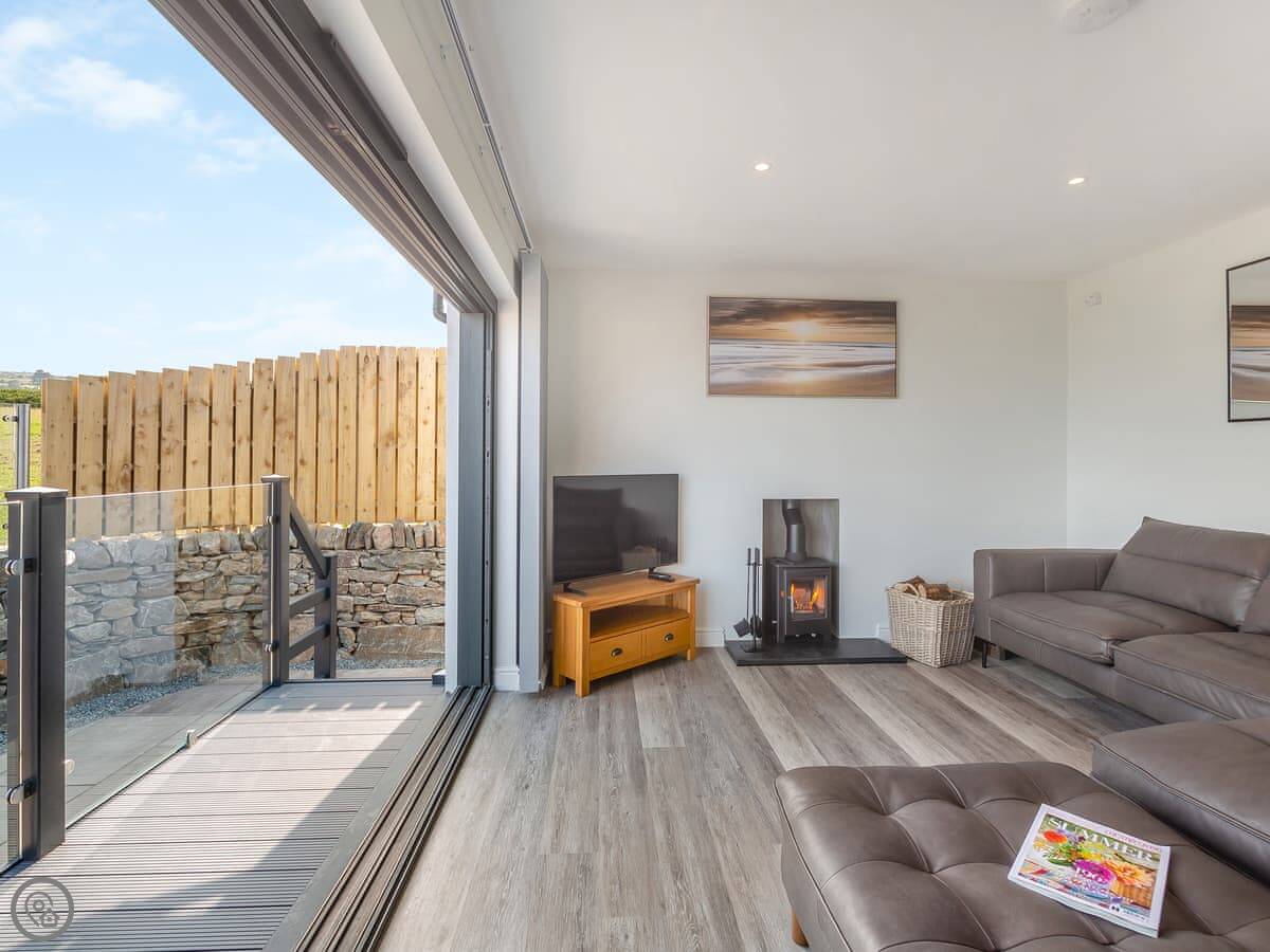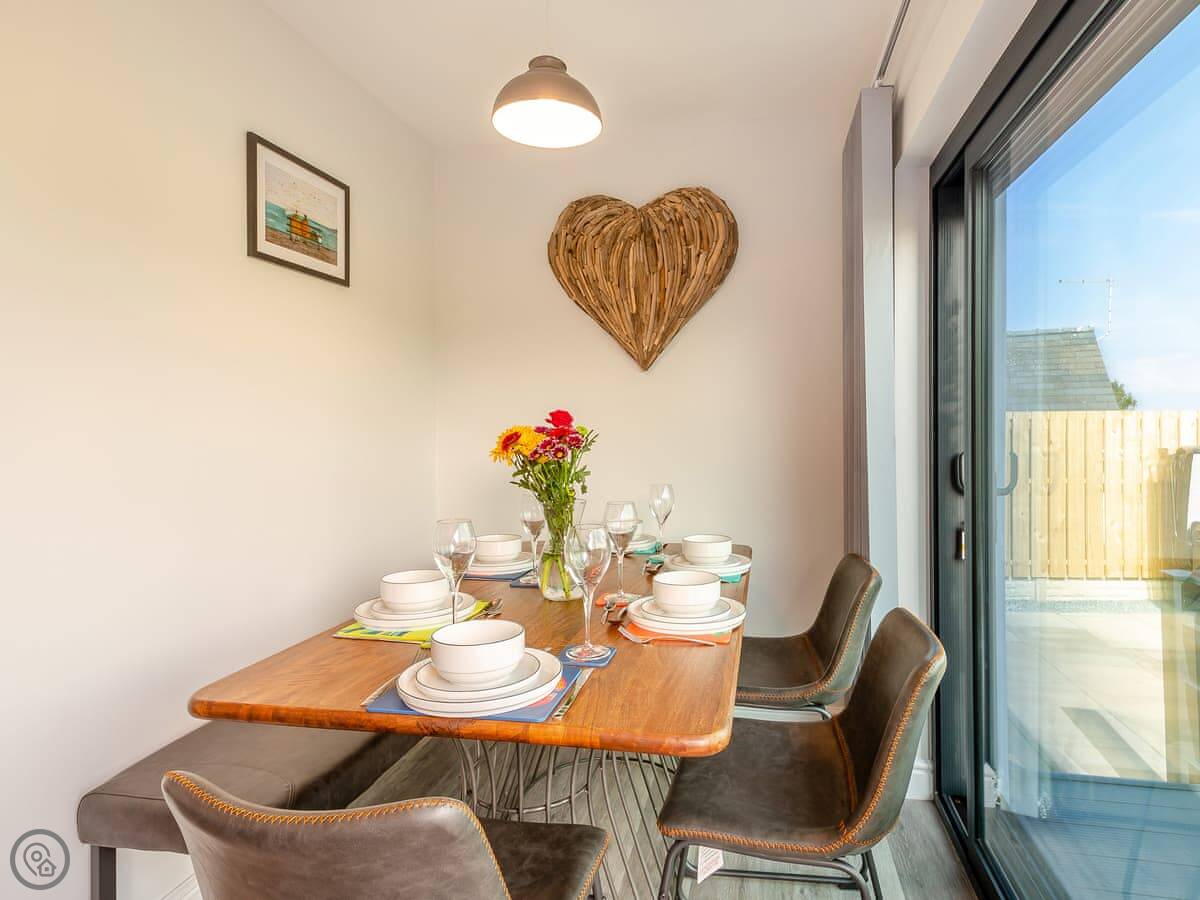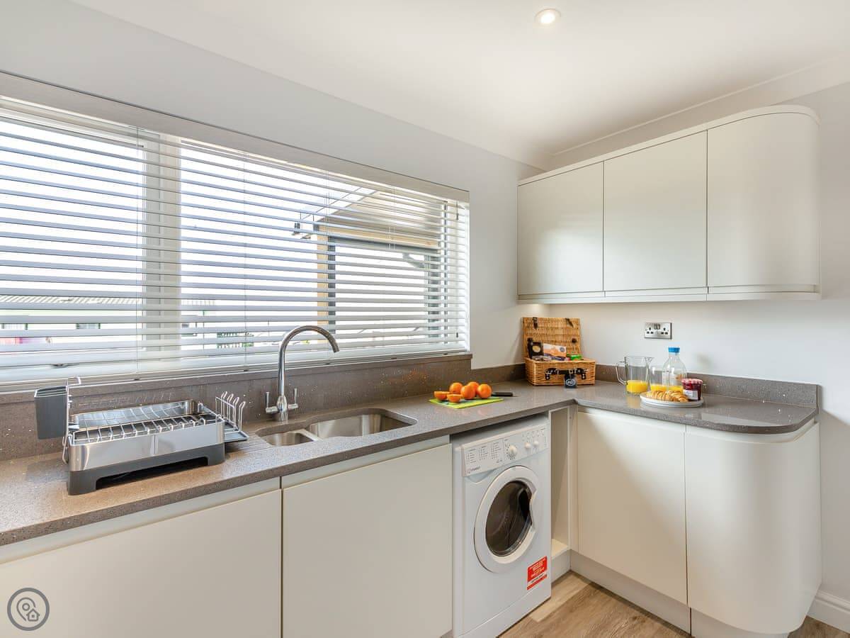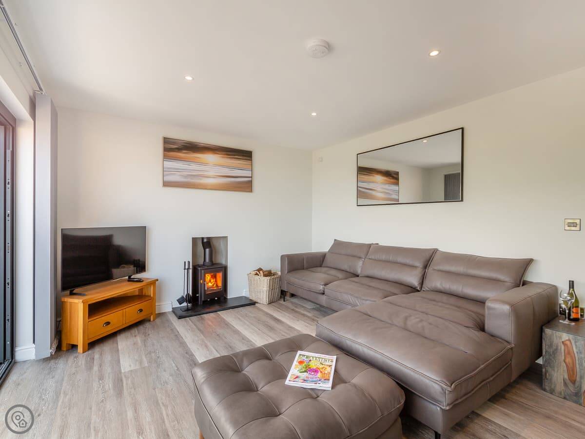 The main living space is open plan, with a kitchen, dining area, and a sitting area with a log burner. The TV and wi-fi work fine. There’s also a utility room with a washing machine.