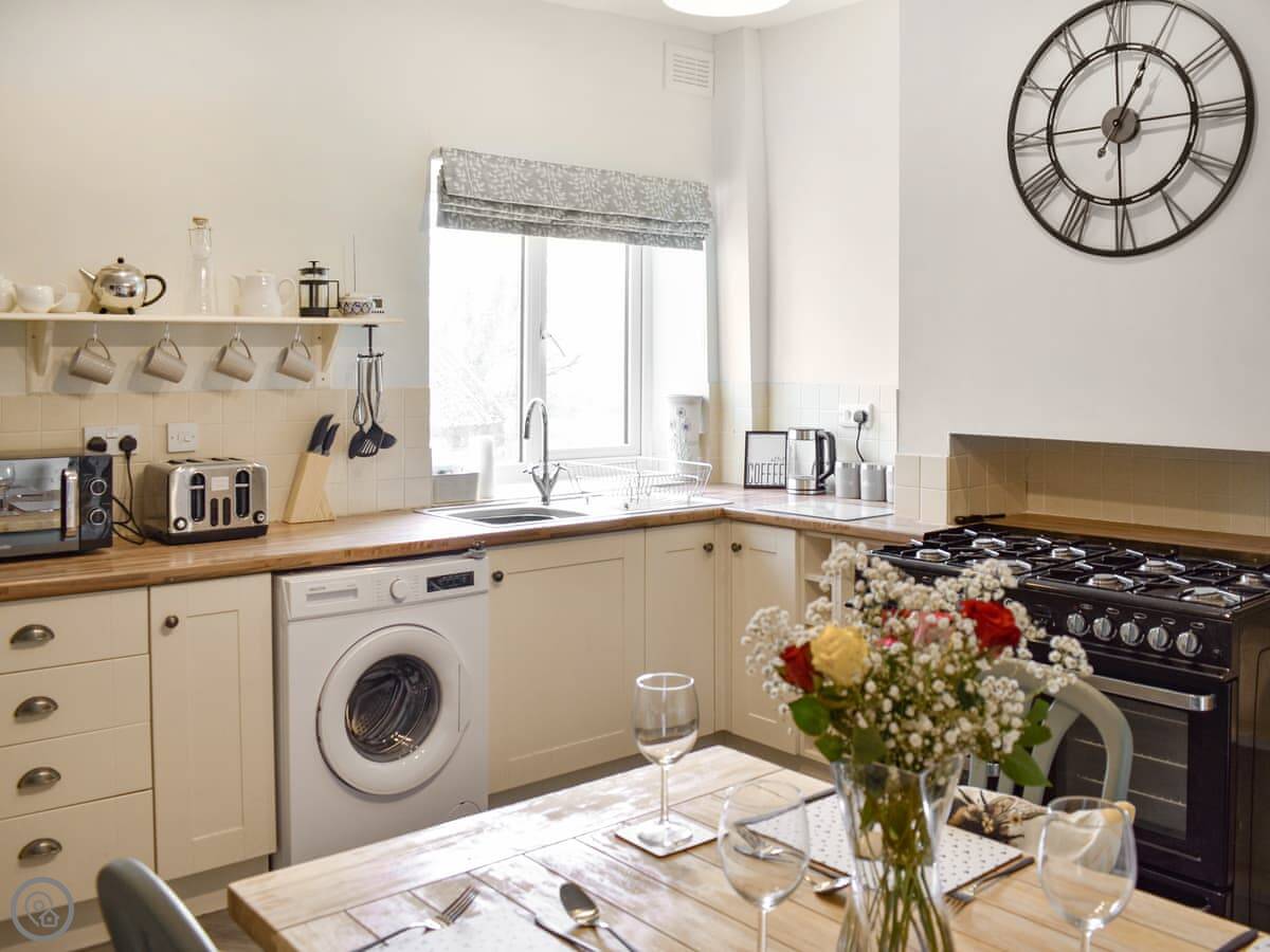There's a woodburning stove in the living room. It works well and heats the room quickly. The kitchen has a range cooker and a washing machine. The back garden is enclosed, which is good if you're bringing dogs. You can take up to two. There's parking right outside.
