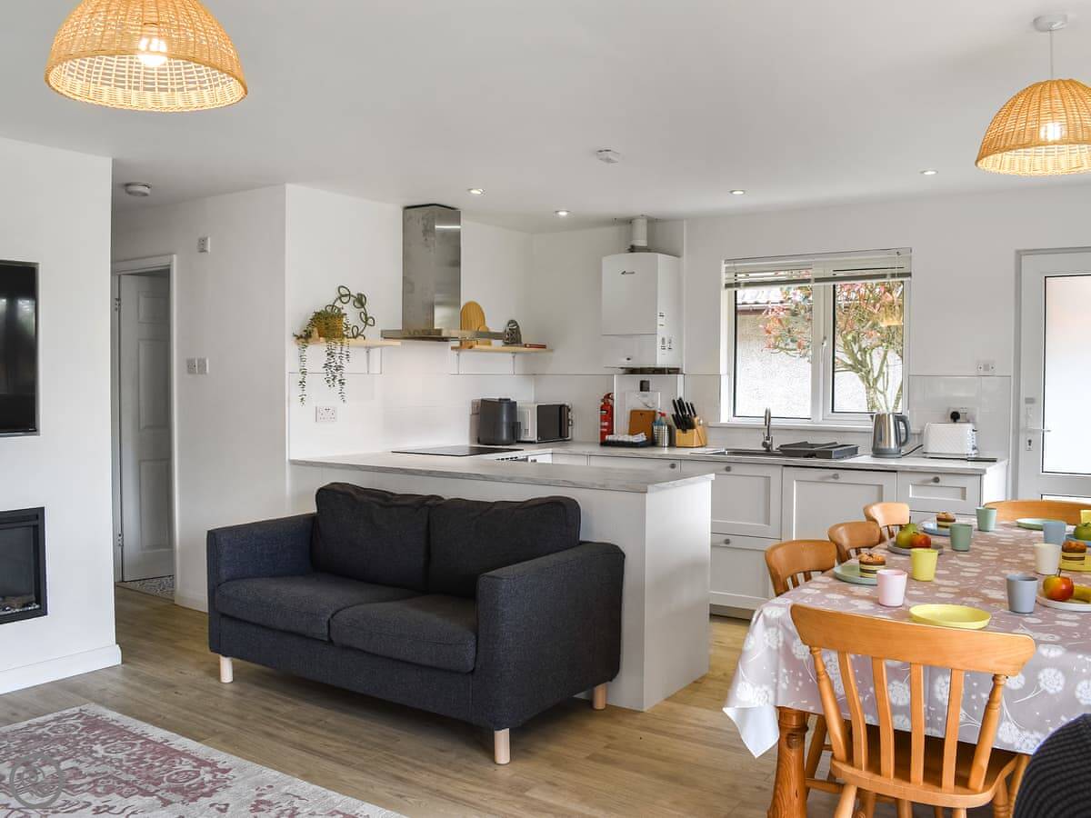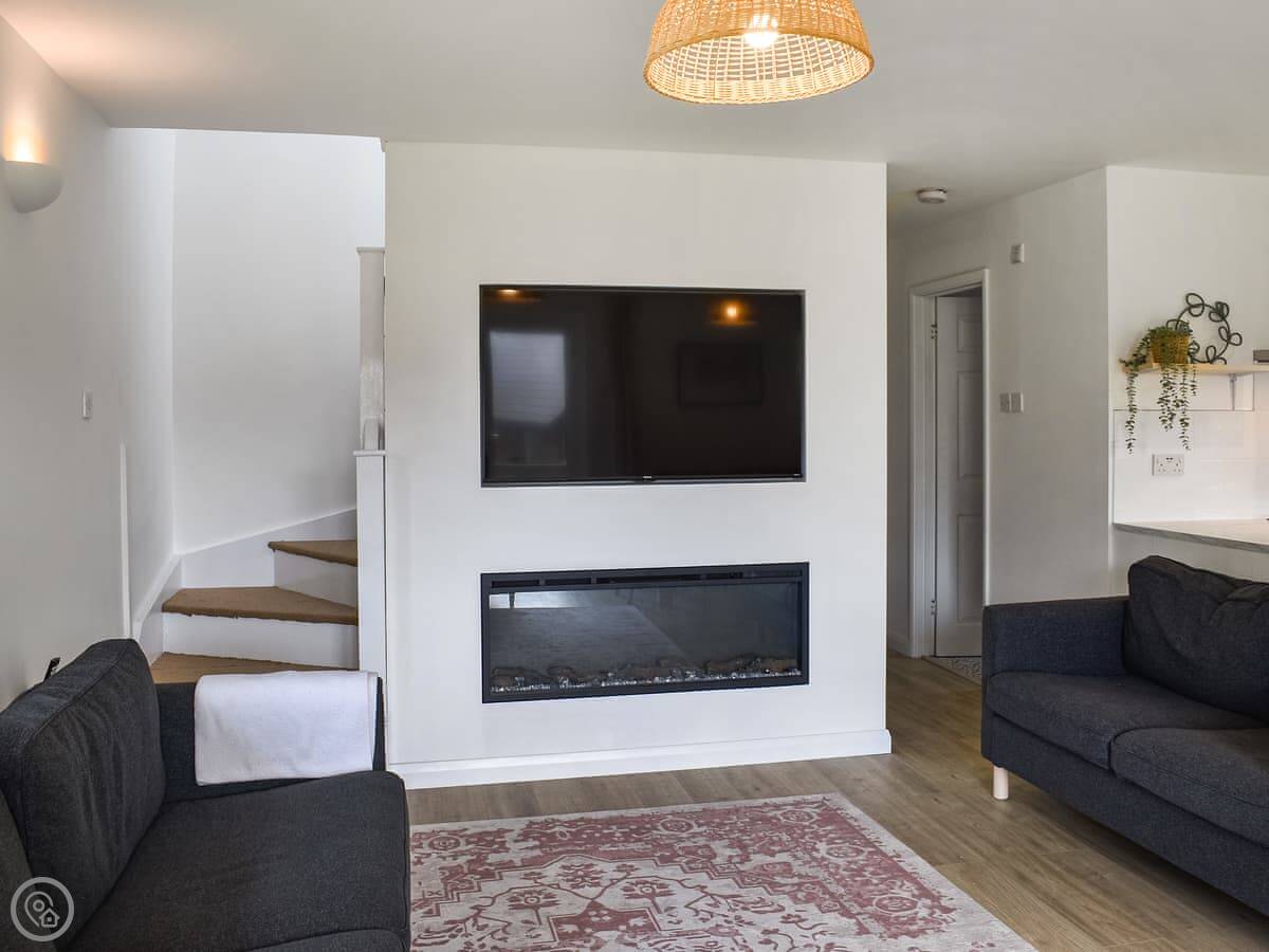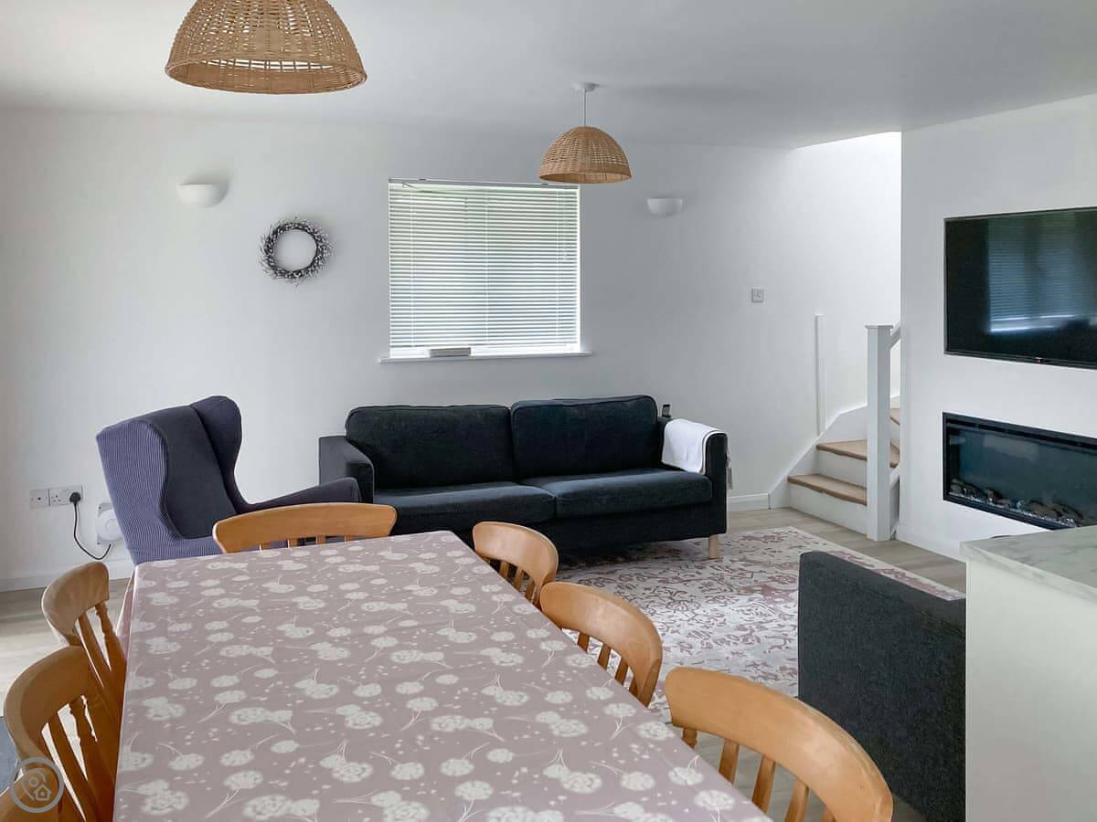 Inside, it's open plan. The kitchen is new. There's a dining table and sofas around an electric fire. Doors go out to a patio.