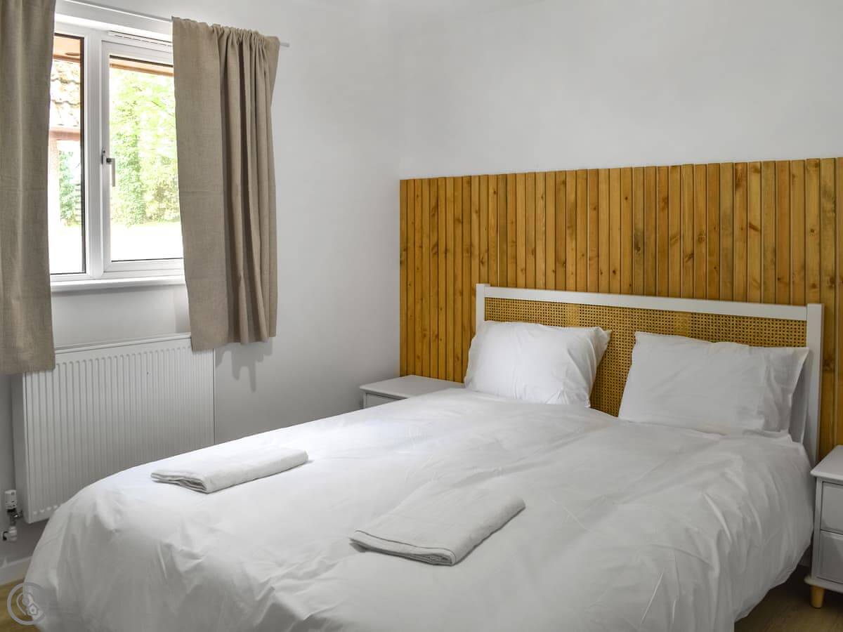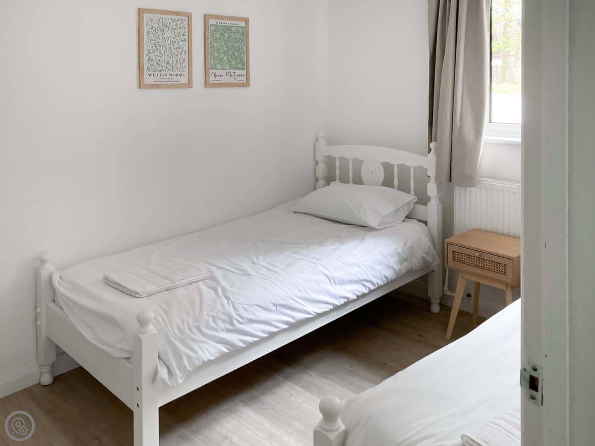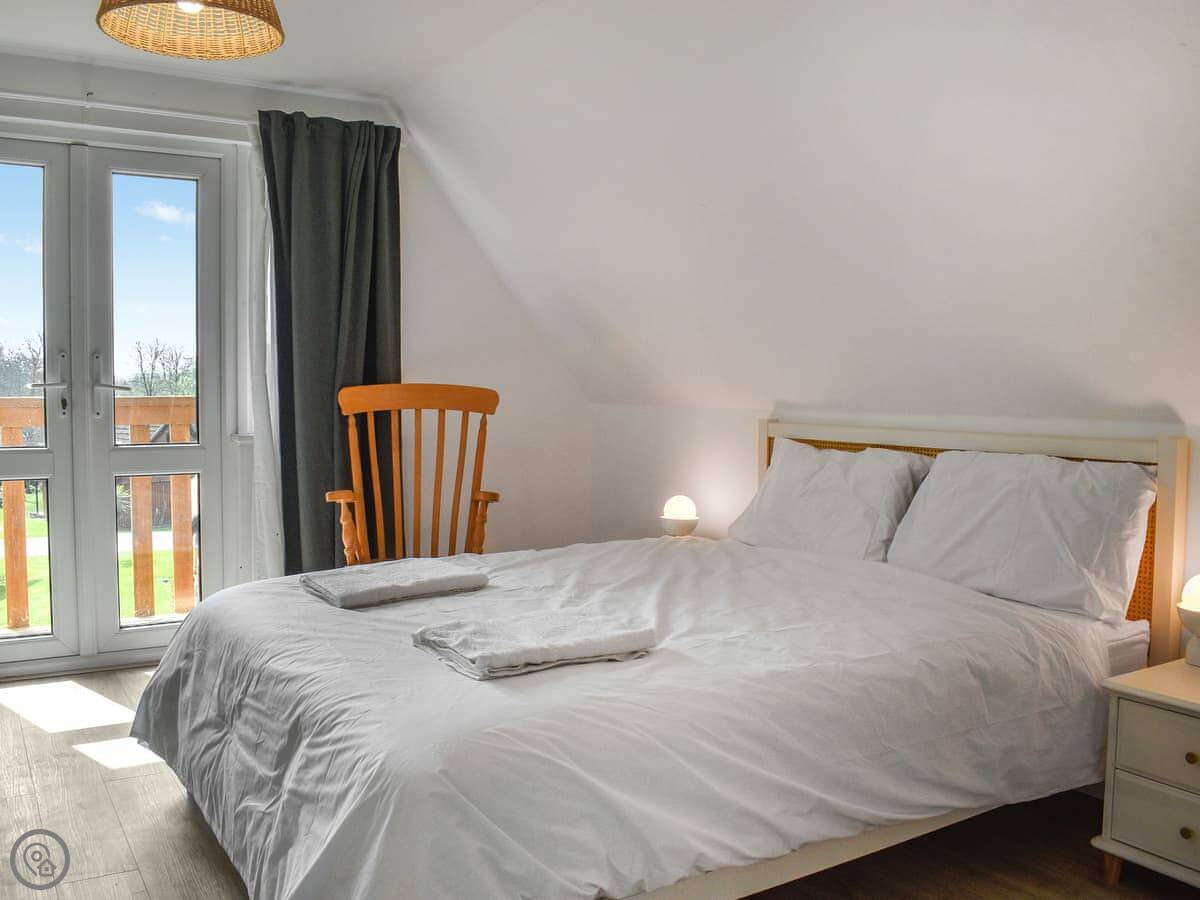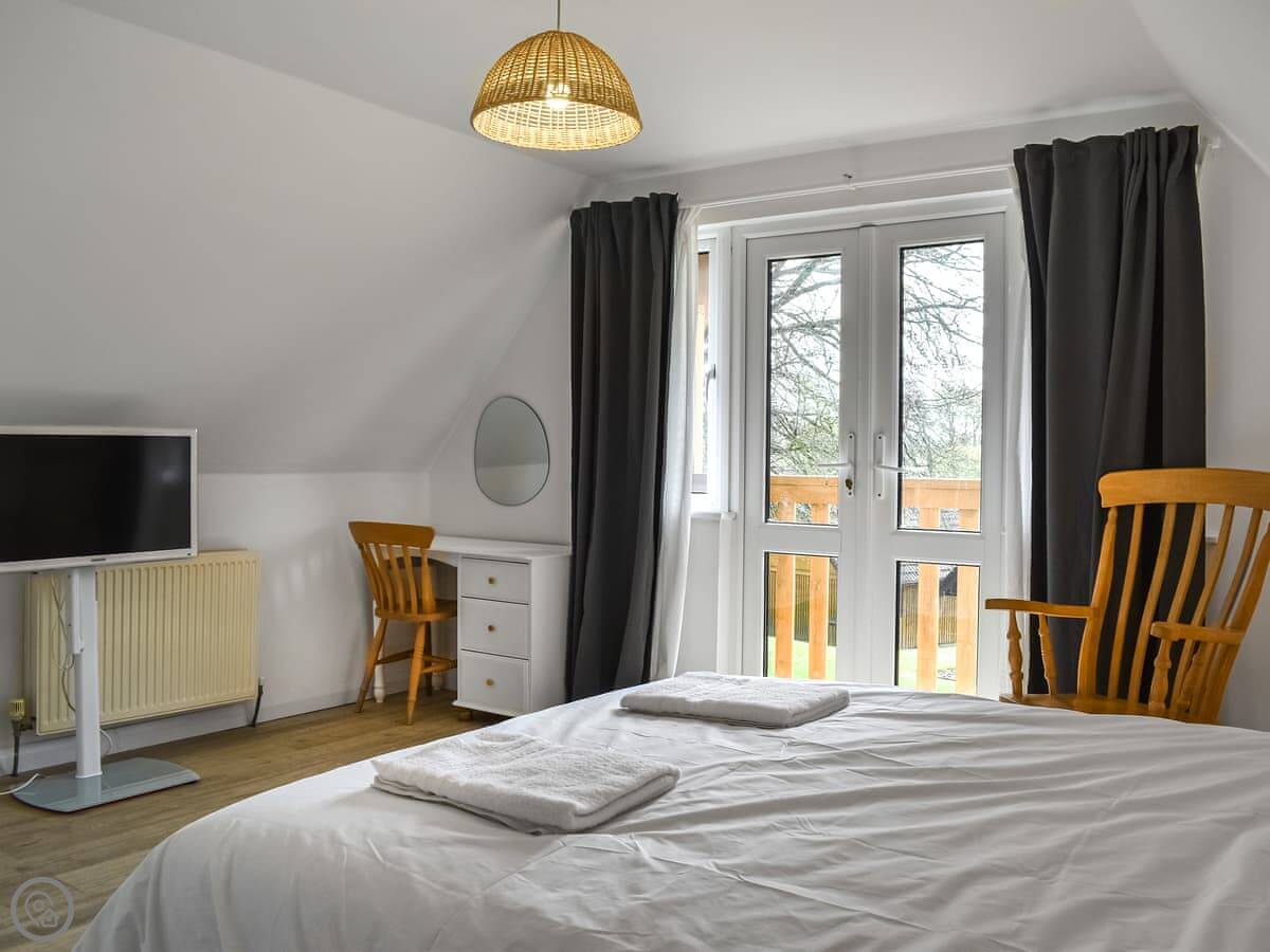 Two bedrooms are on the ground floor: one with twin beds and one with a kingsize. Upstairs, there's a bedroom with a double and a single bed. The other upstairs room is the main one, with a kingsize bed, a Smart TV, and doors out to a private balcony. The view from there is good, over the park fields.