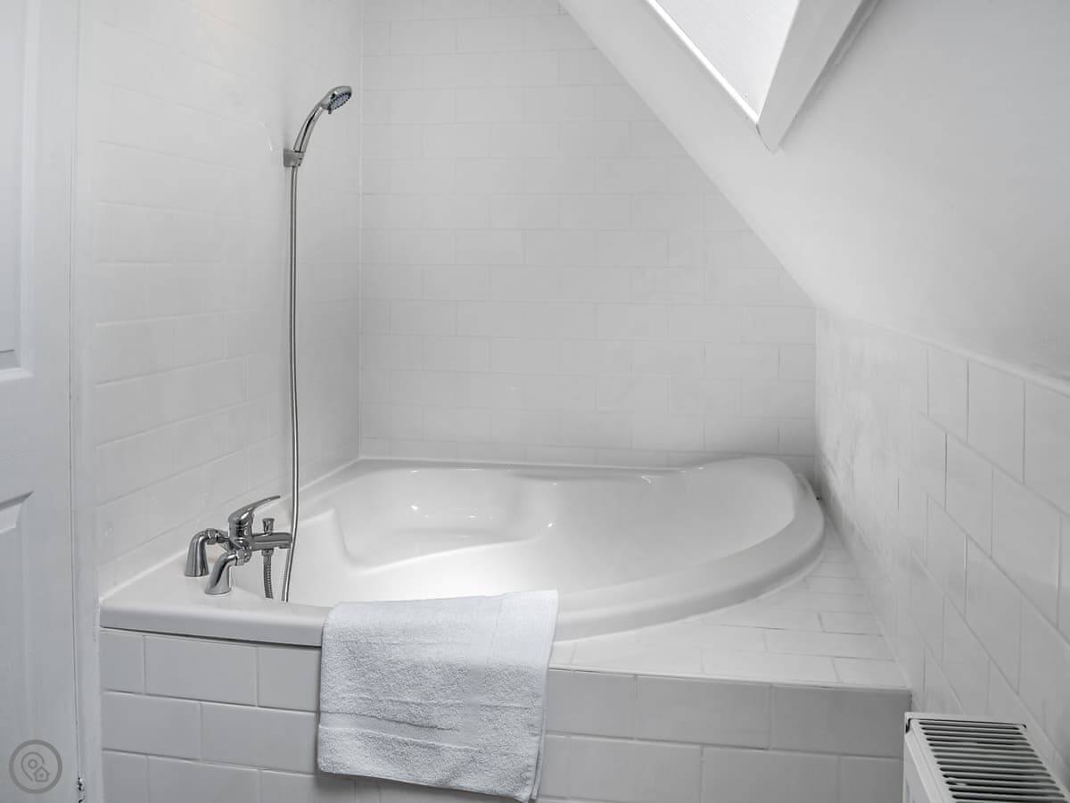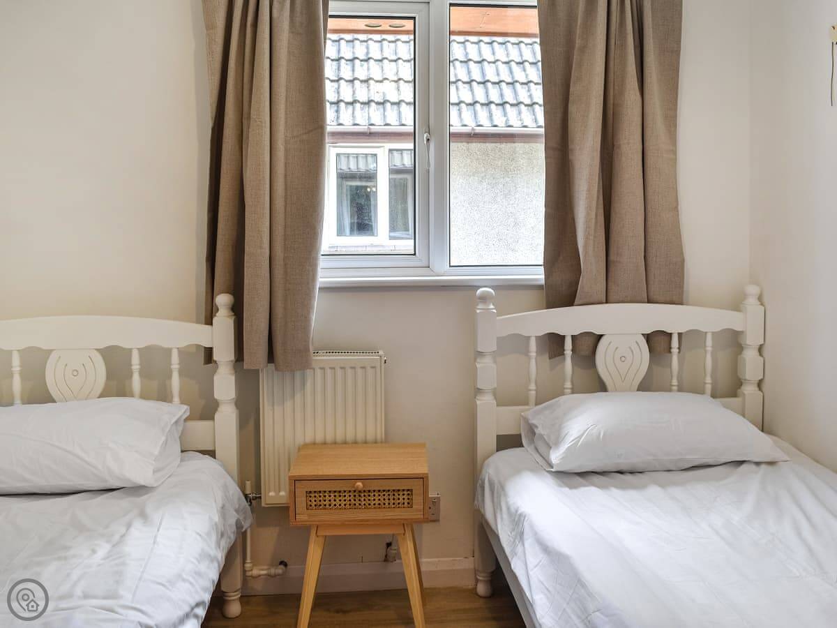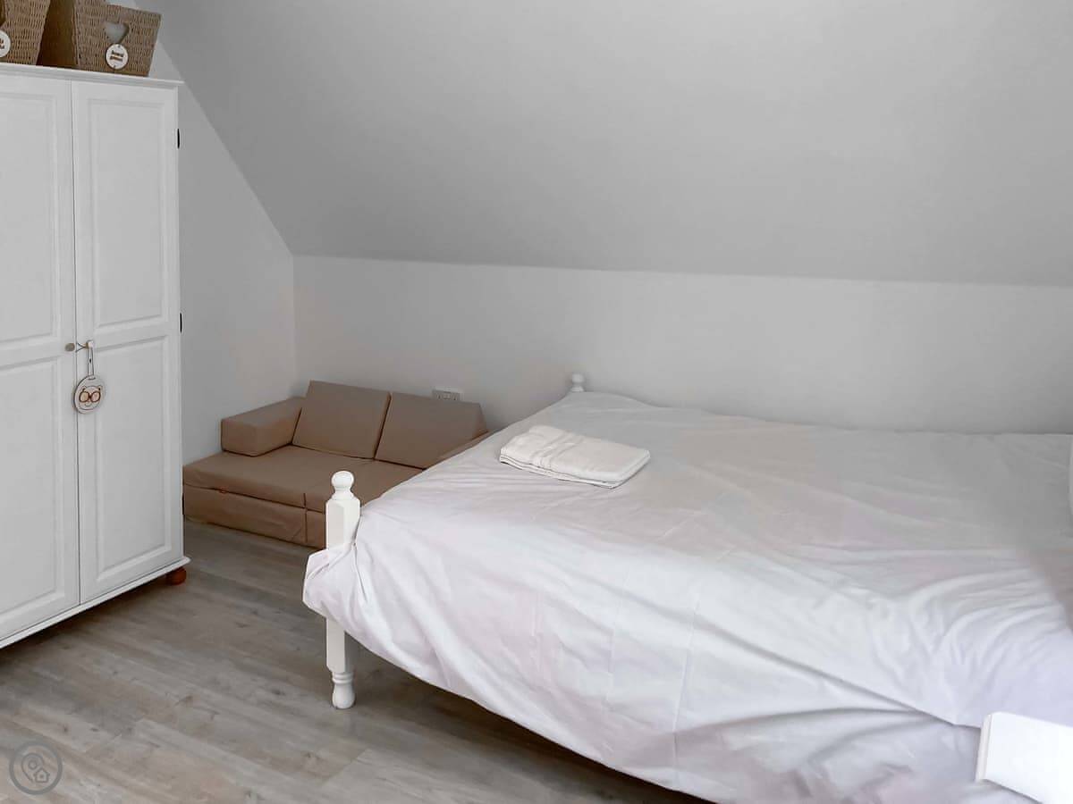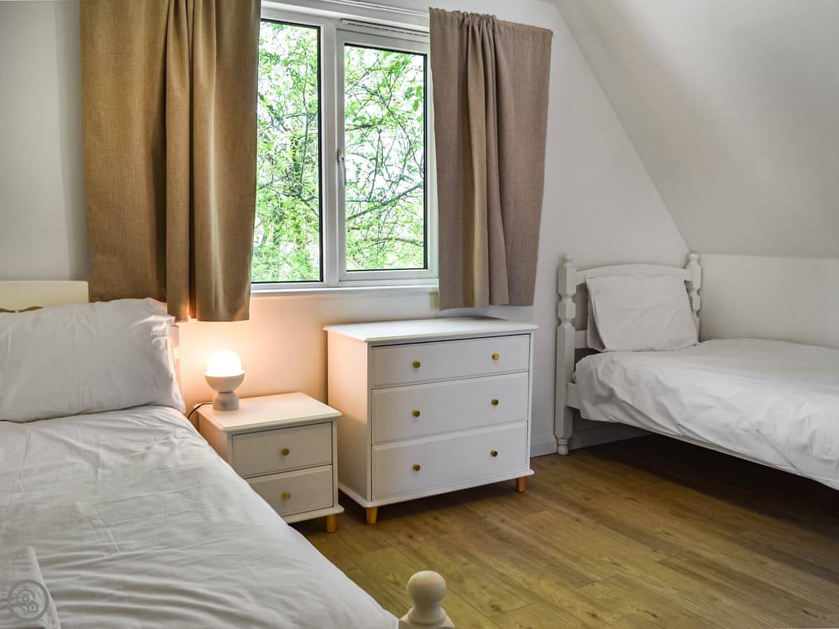 Two bedrooms are on the ground floor: one with twin beds and one with a kingsize. Upstairs, there's a bedroom with a double and a single bed. The other upstairs room is the main one, with a kingsize bed, a Smart TV, and doors out to a private balcony. The view from there is good, over the park fields.