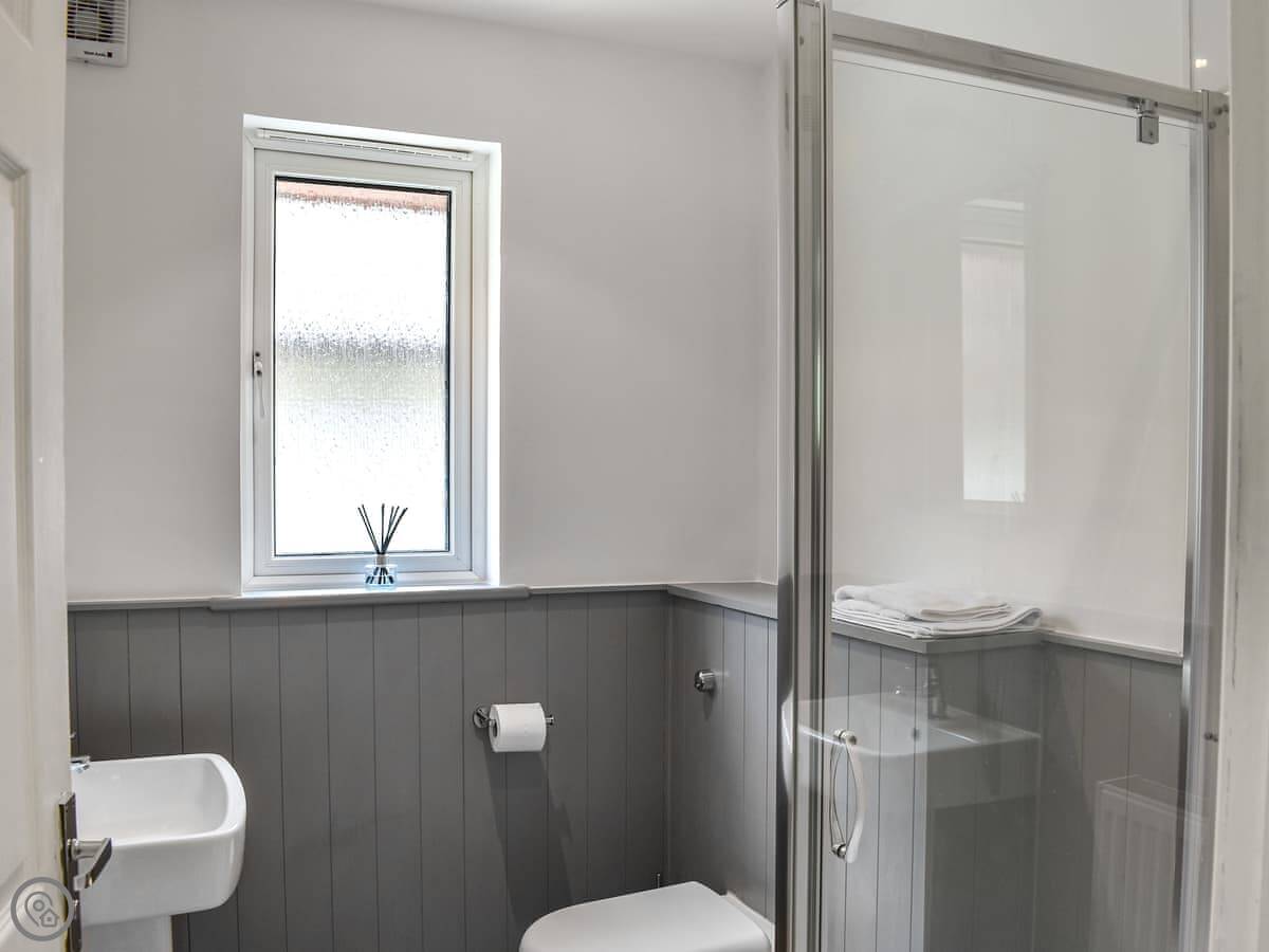 It sleeps nine in four bedrooms. There are two bathrooms. One downstairs has a shower. The one upstairs has a corner bath with a shower over it. The stairs are standard lodge stairs, not too steep.