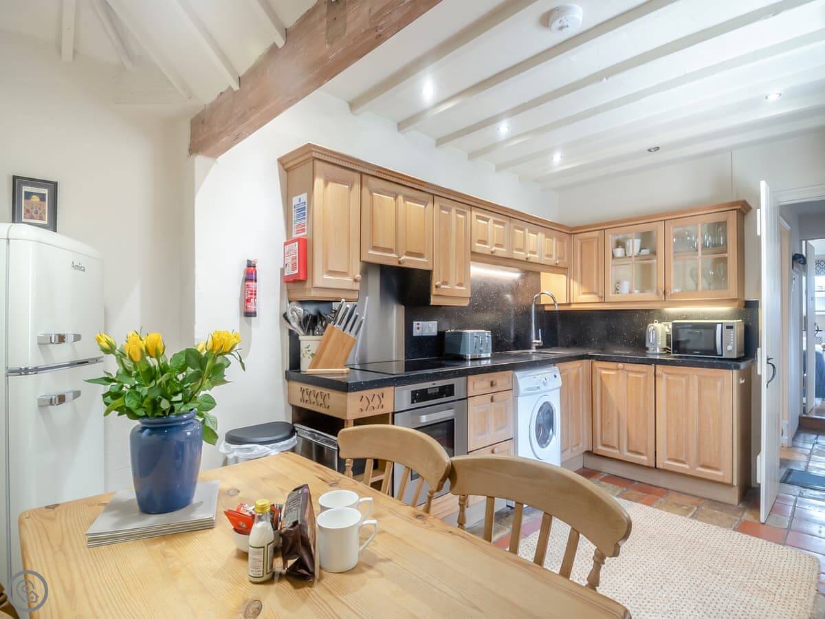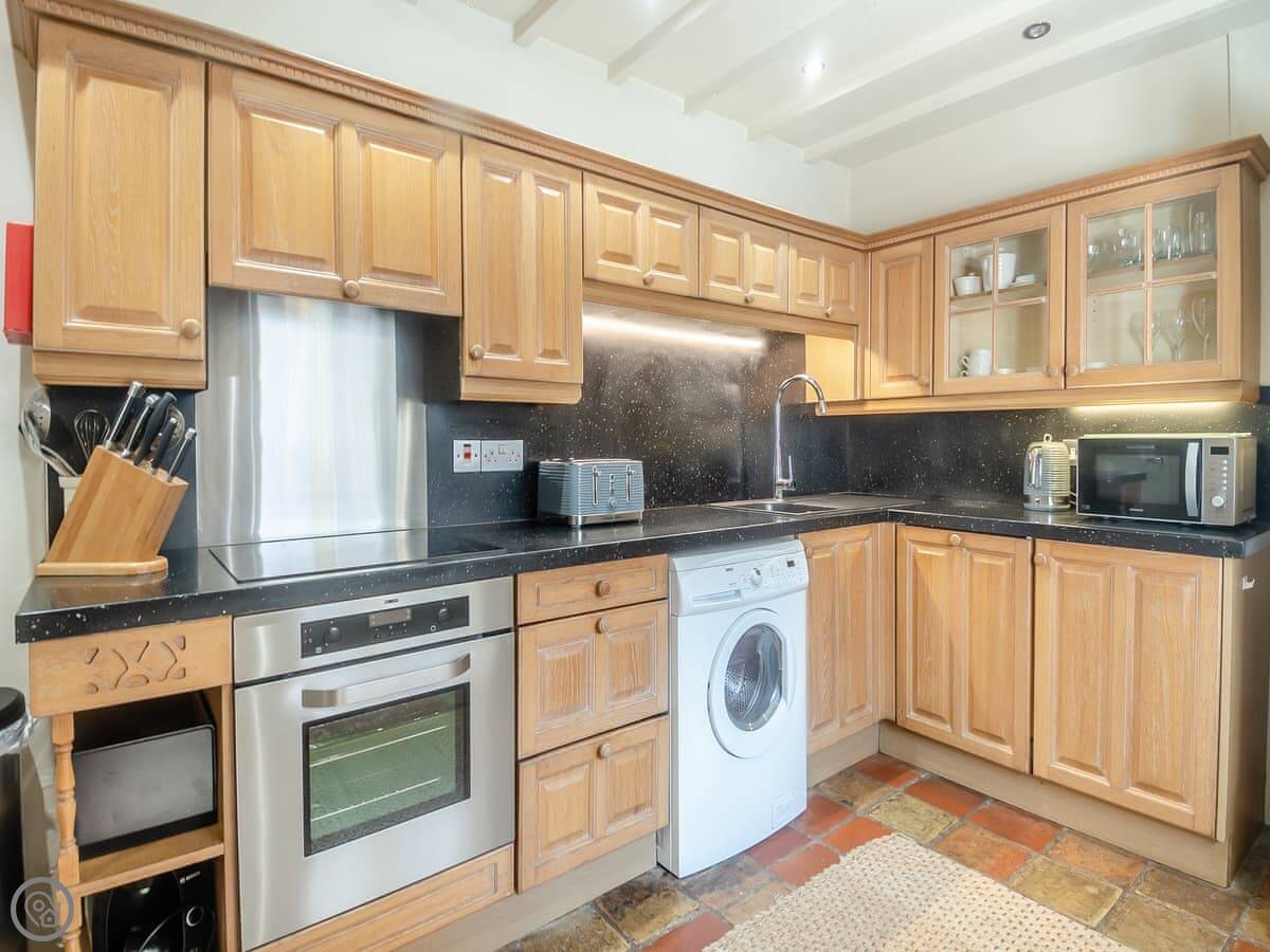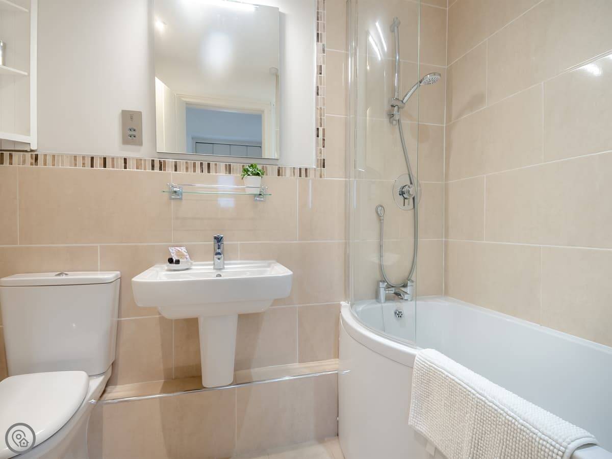 It sleeps four in two bedrooms. One king size, one twin. The bathroom has a bath with a shower over it. Everything's recently done up. The kitchen is new and has a dishwasher. There's a washing machine too.