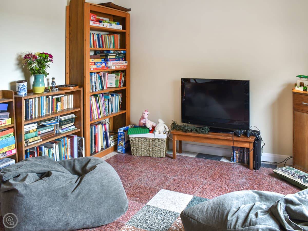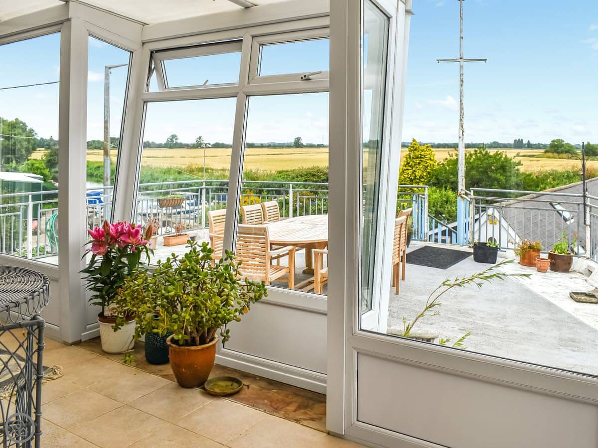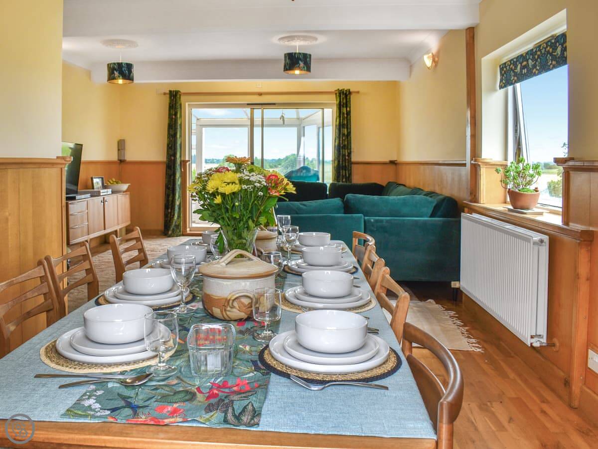 Downstairs is a utility room with a washing machine and tumble dryer, and a shower room. There's also a games room with a TV. Up the stairs, the main living area is on the first floor. There's a big sofa and a dining table. The kitchen is modern and has what you need. Off the living room is a sunroom, which is a good spot to sit and watch the river.