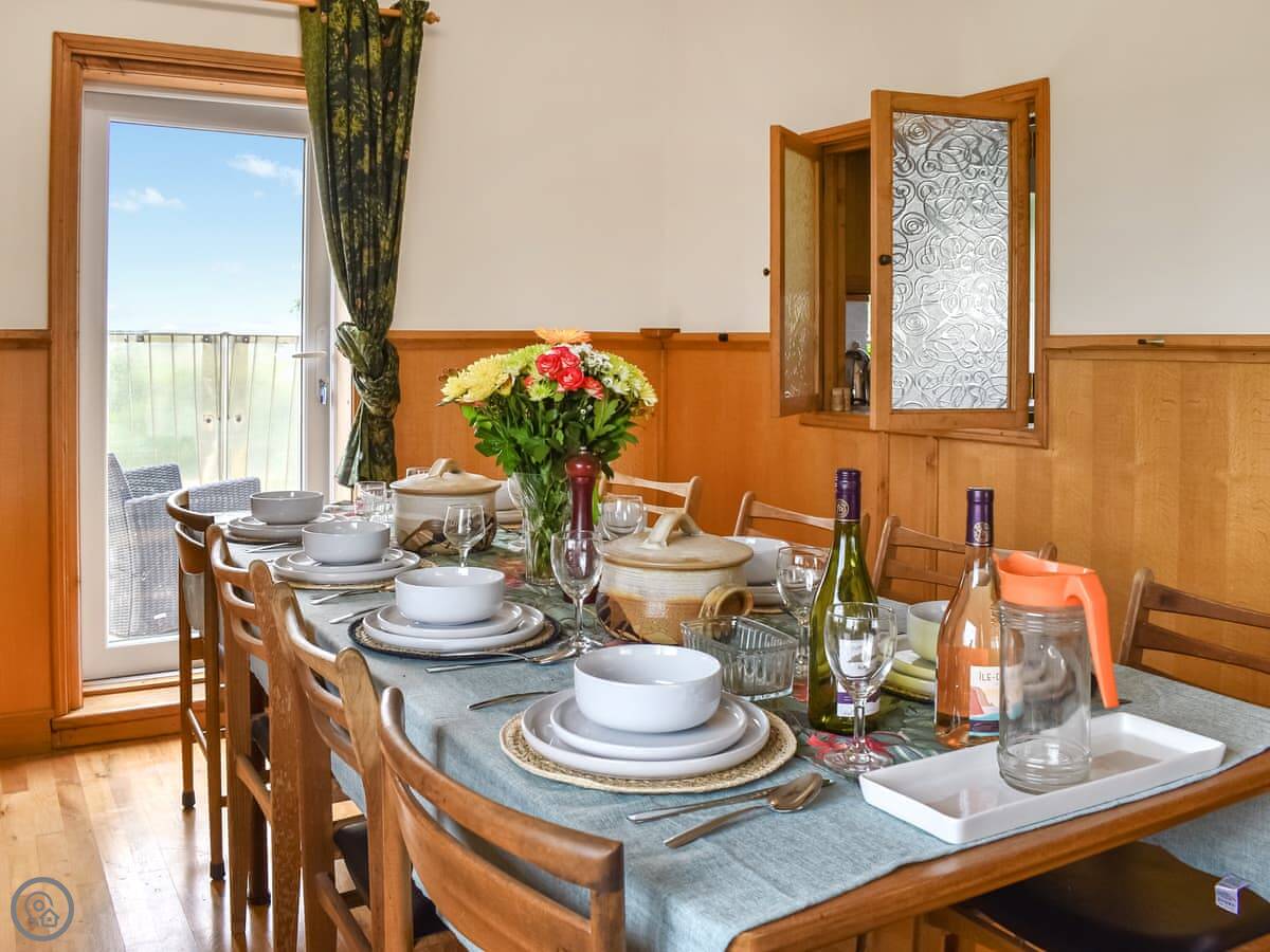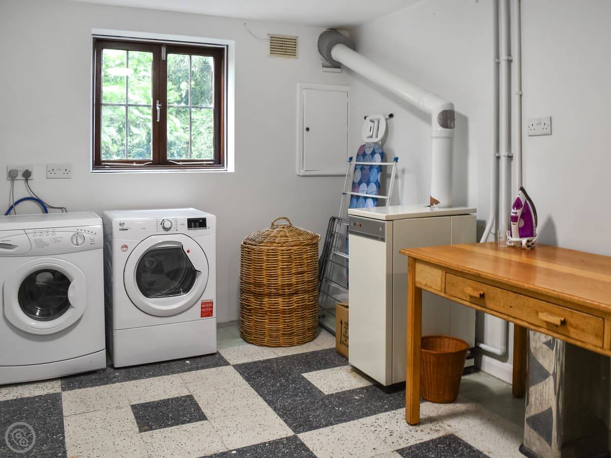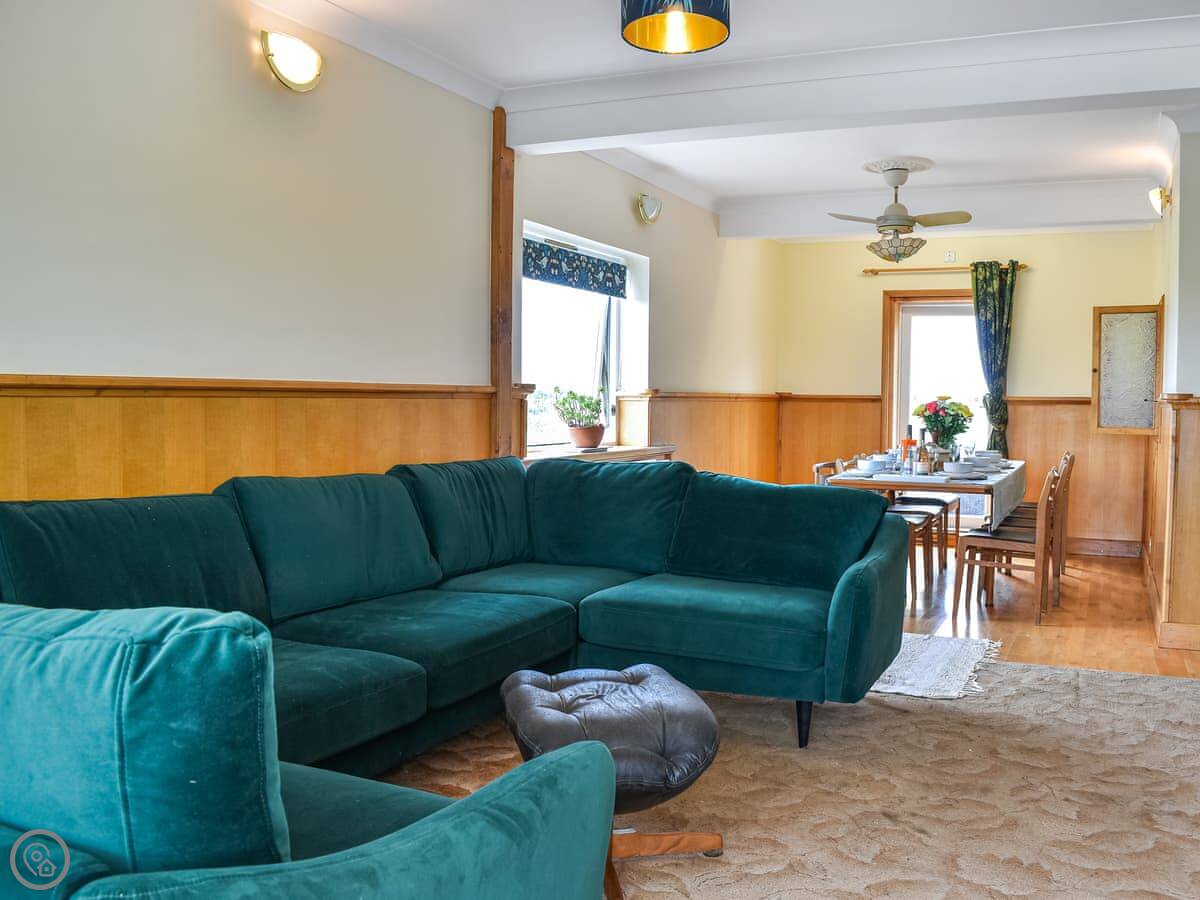 Downstairs is a utility room with a washing machine and tumble dryer, and a shower room. There's also a games room with a TV. Up the stairs, the main living area is on the first floor. There's a big sofa and a dining table. The kitchen is modern and has what you need. Off the living room is a sunroom, which is a good spot to sit and watch the river.