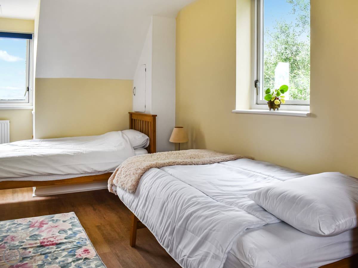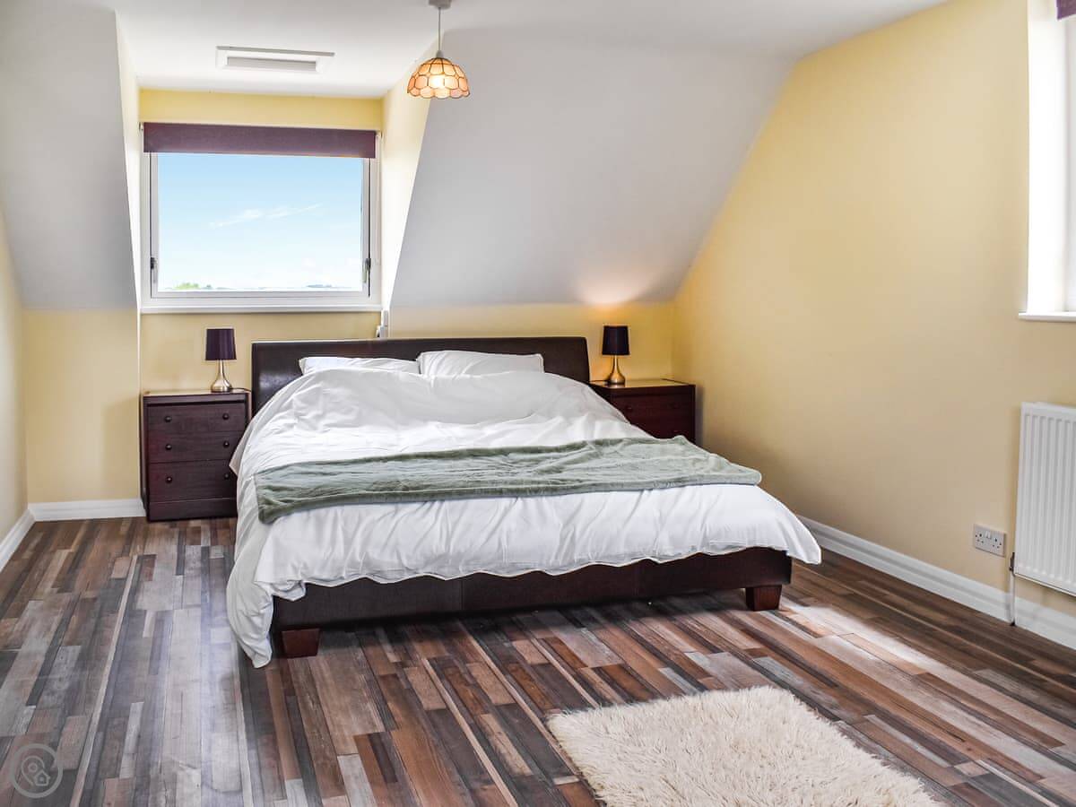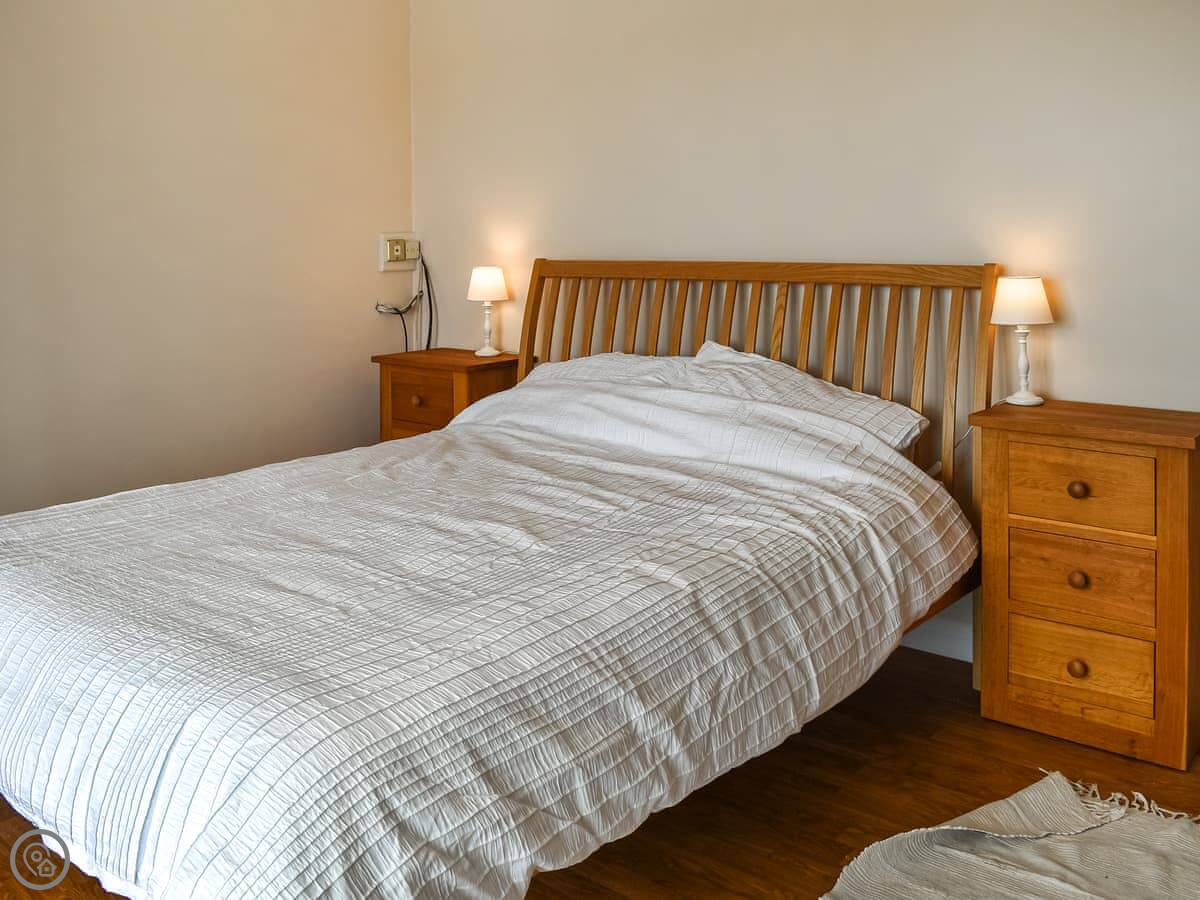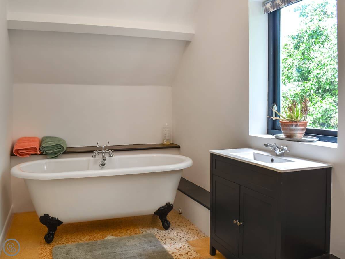 One bedroom with a king-size bed is on this floor. The family bathroom has a roll-top bath. Up another flight of stairs are the other two bedrooms. One has a super king bed and an ensuite shower. The other has two double beds that can be made into singles if you prefer.