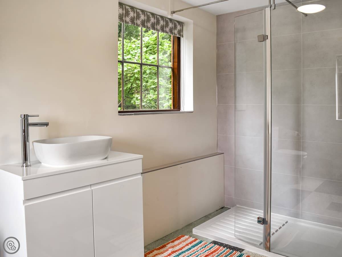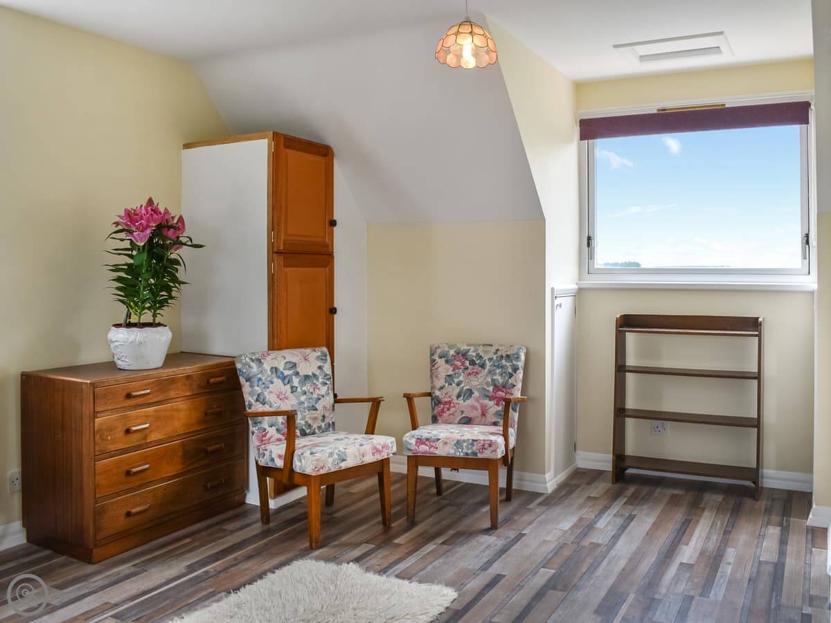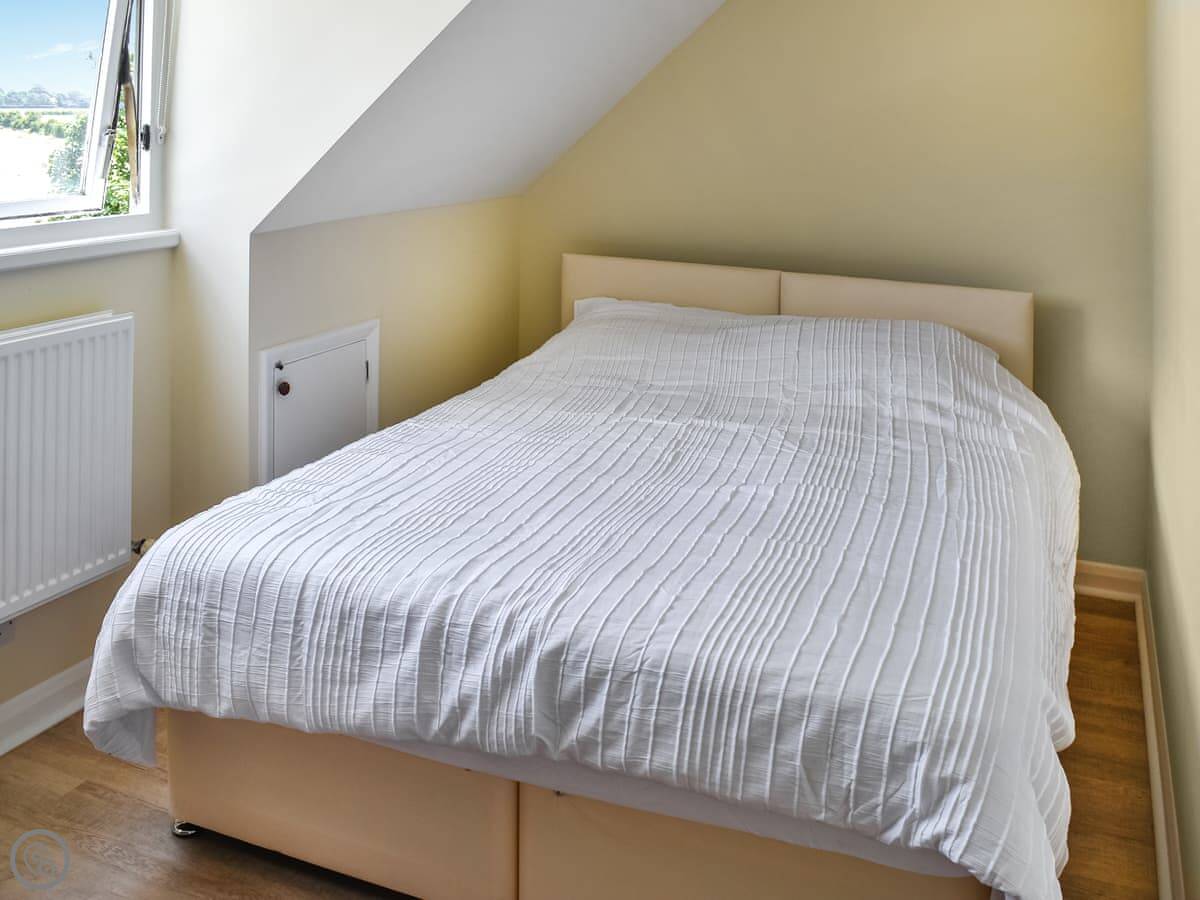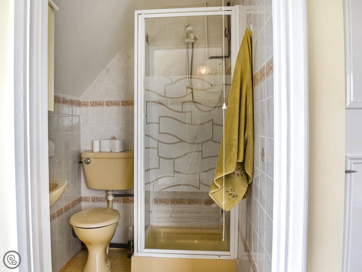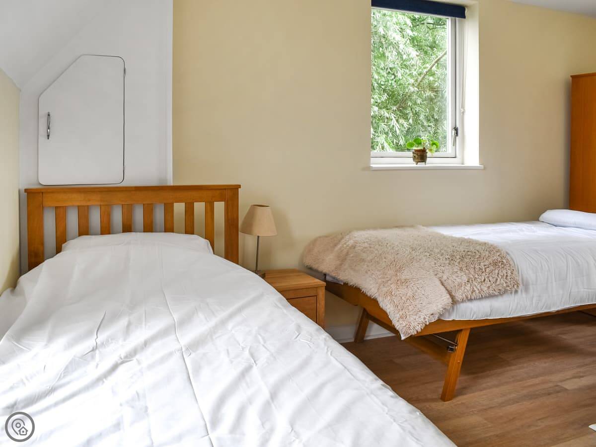 One bedroom with a king-size bed is on this floor. The family bathroom has a roll-top bath. Up another flight of stairs are the other two bedrooms. One has a super king bed and an ensuite shower. The other has two double beds that can be made into singles if you prefer.