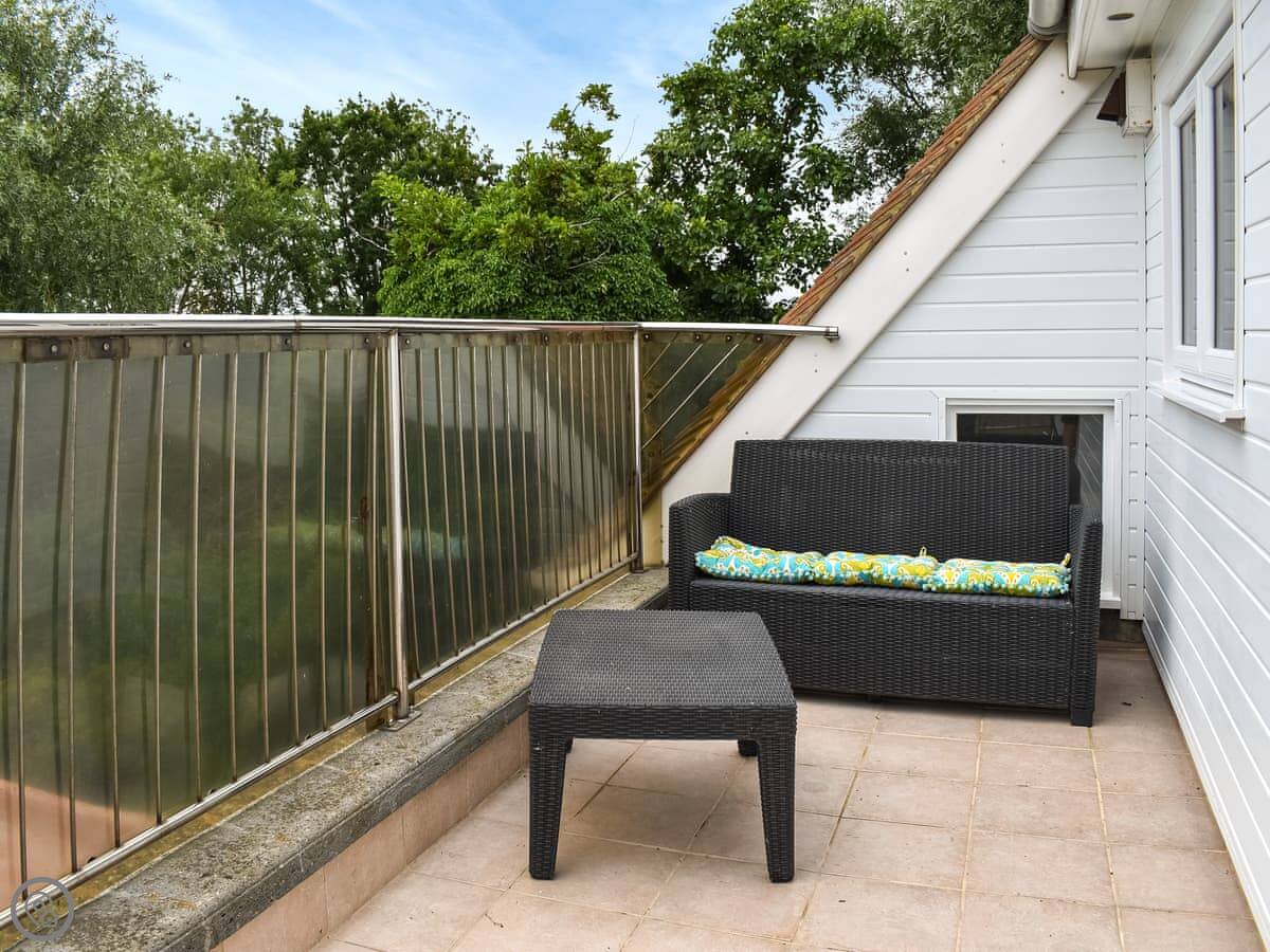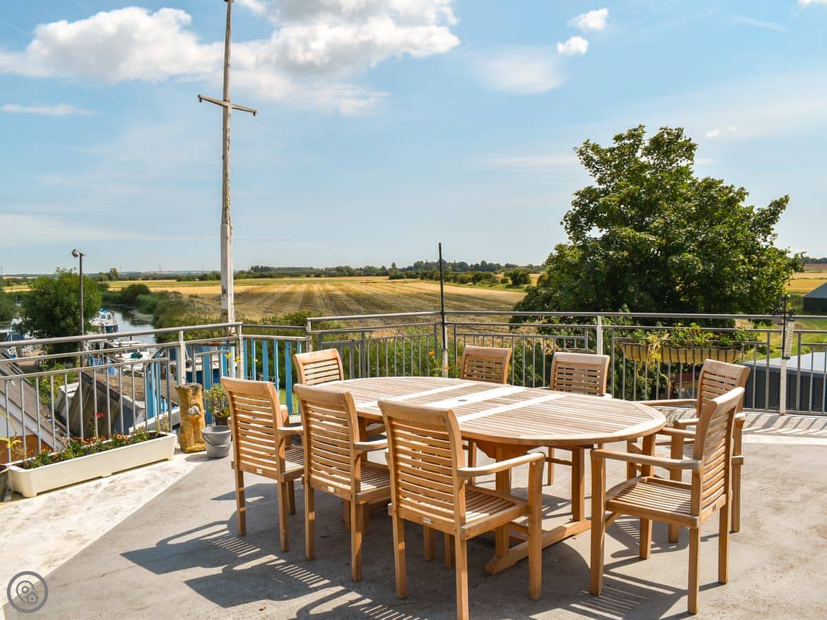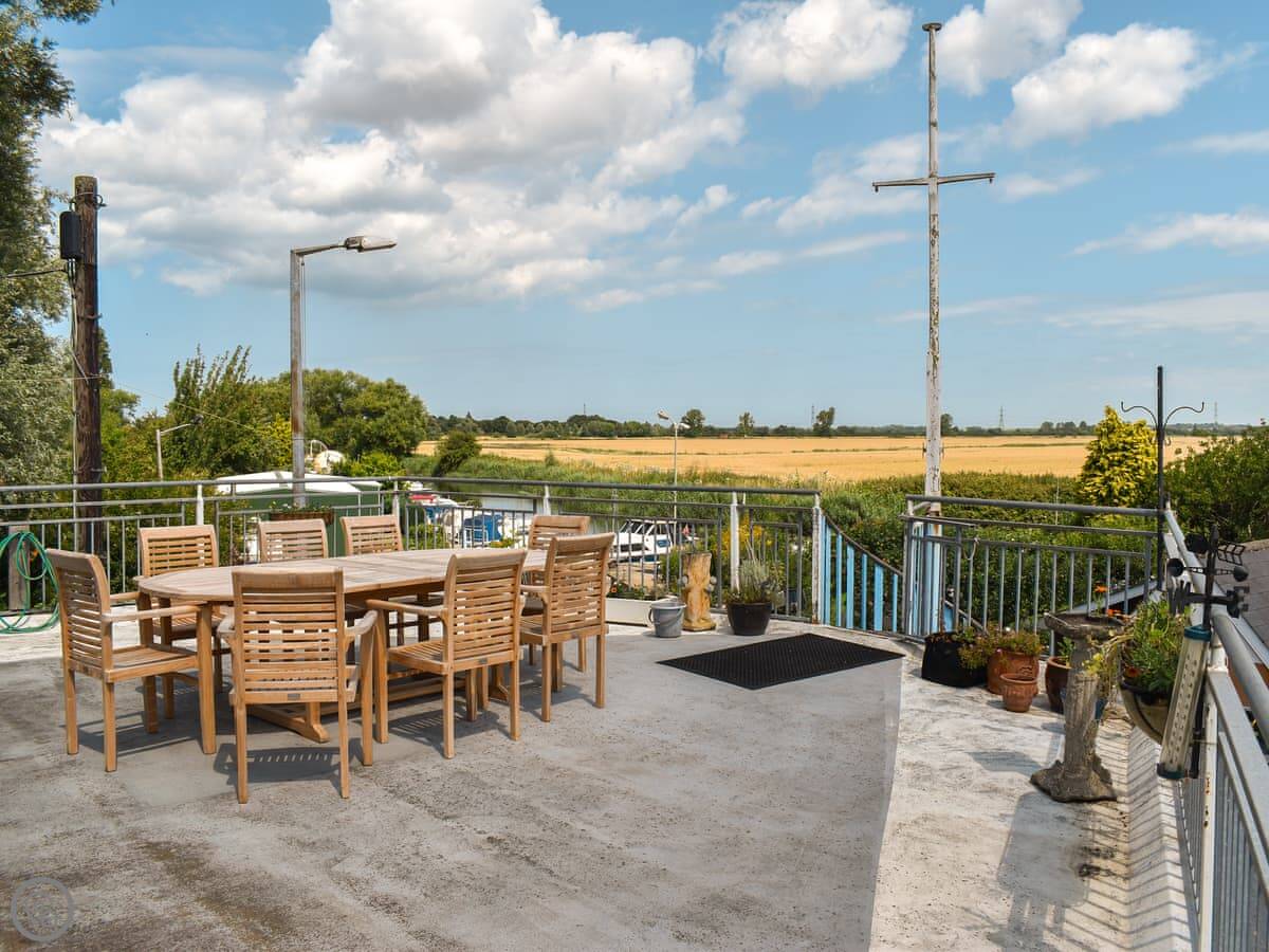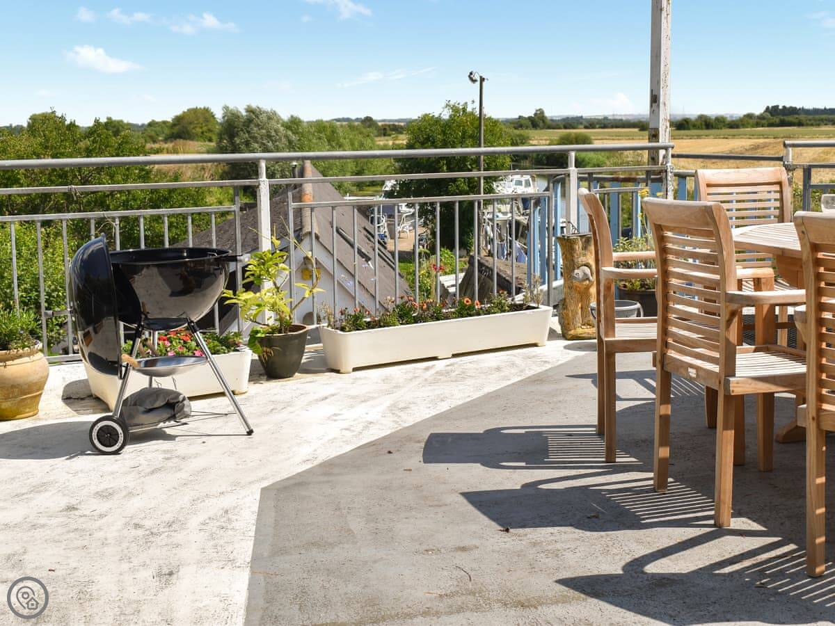 Outside, there's a large terrace at the back with a table and a big barbecue. You look right over the boatyard from there. There's also a small front balcony.