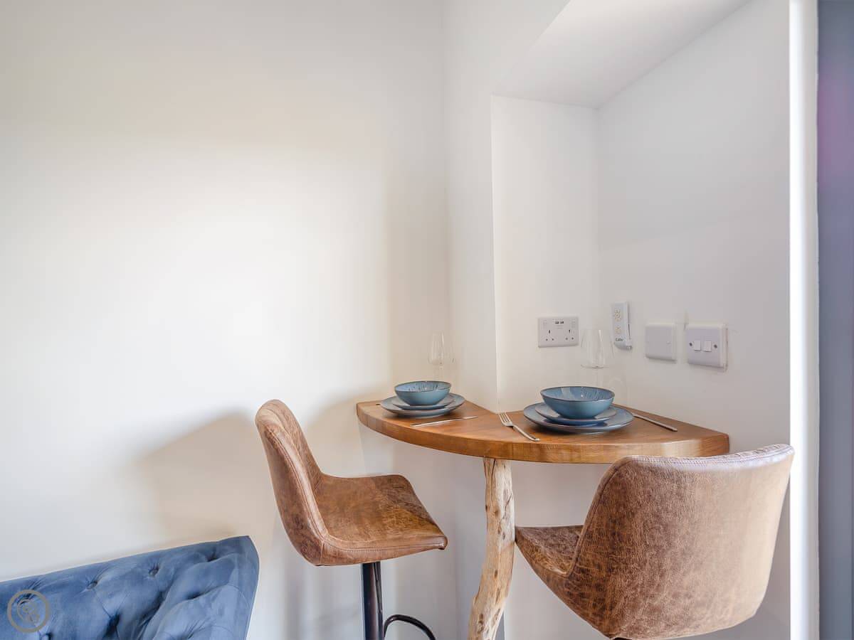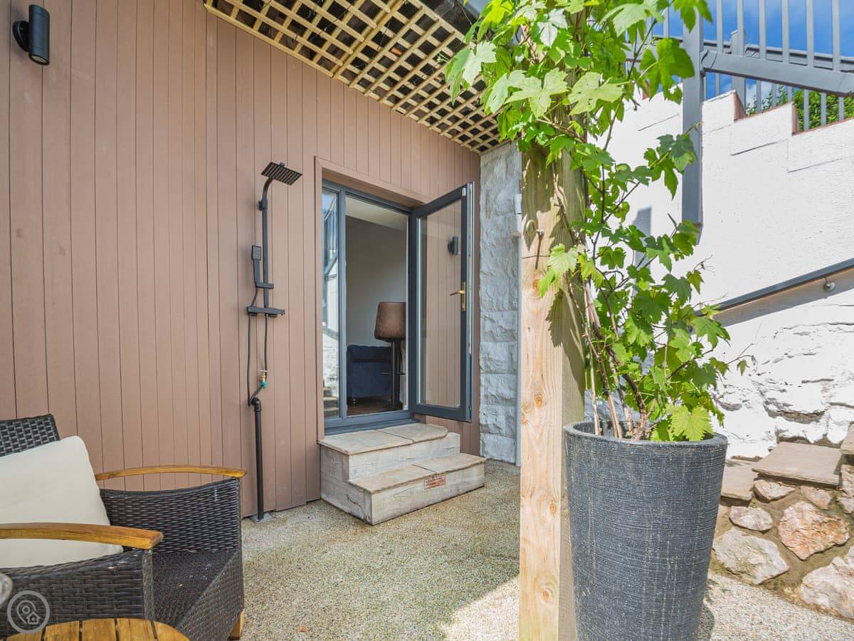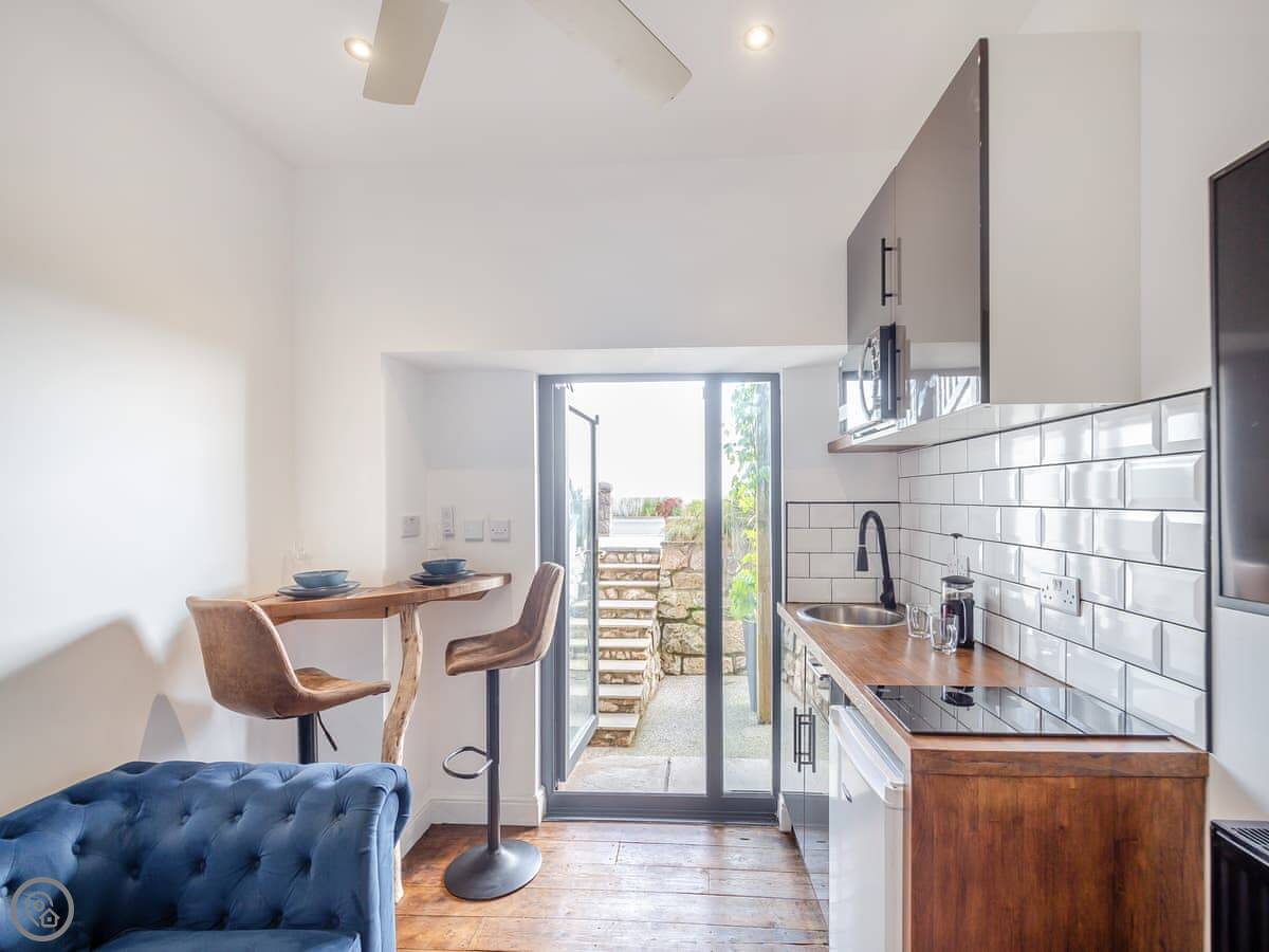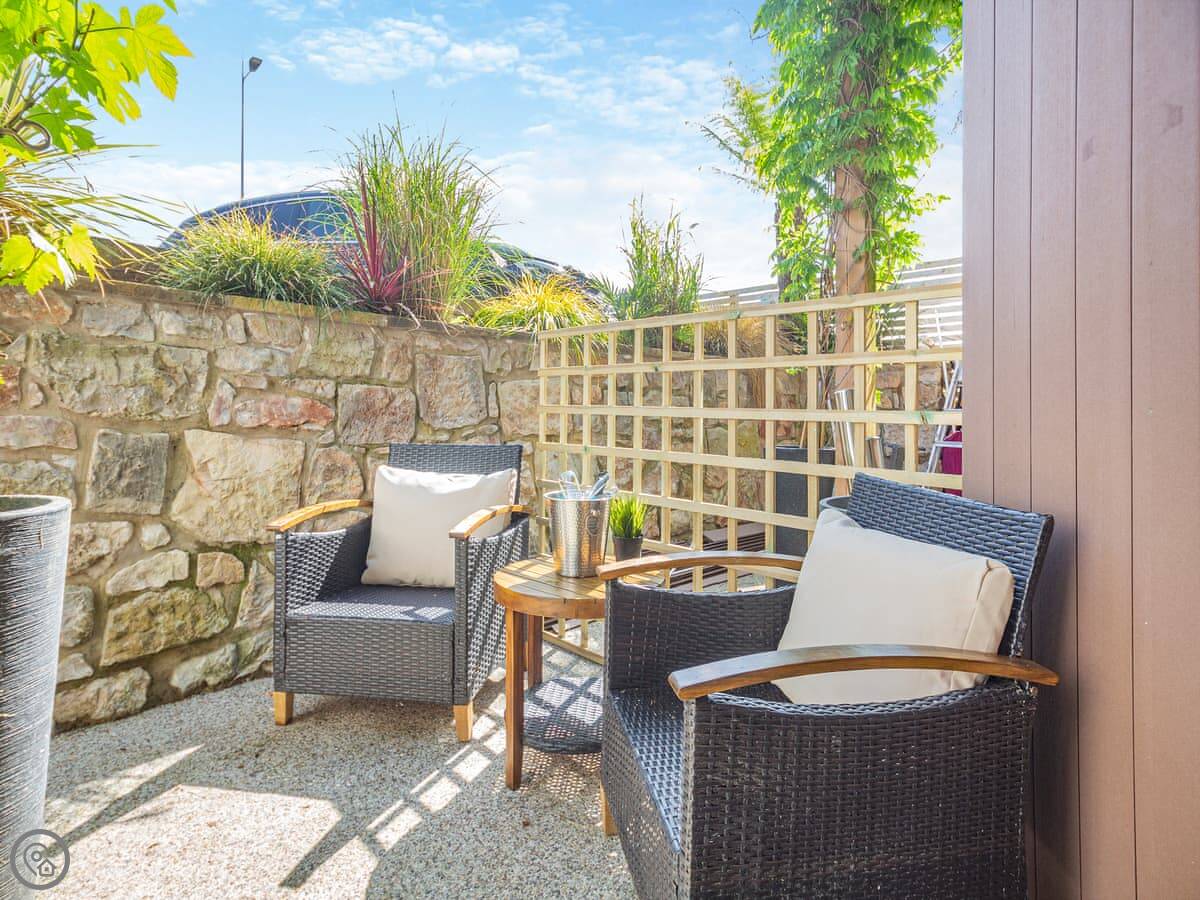 It’s a five star rating place, so it’s been done up nicely. Kingsize bed, en-suite shower. The living room and kitchen are open plan. There's a small patio area with table and chairs.