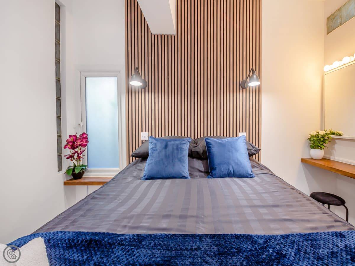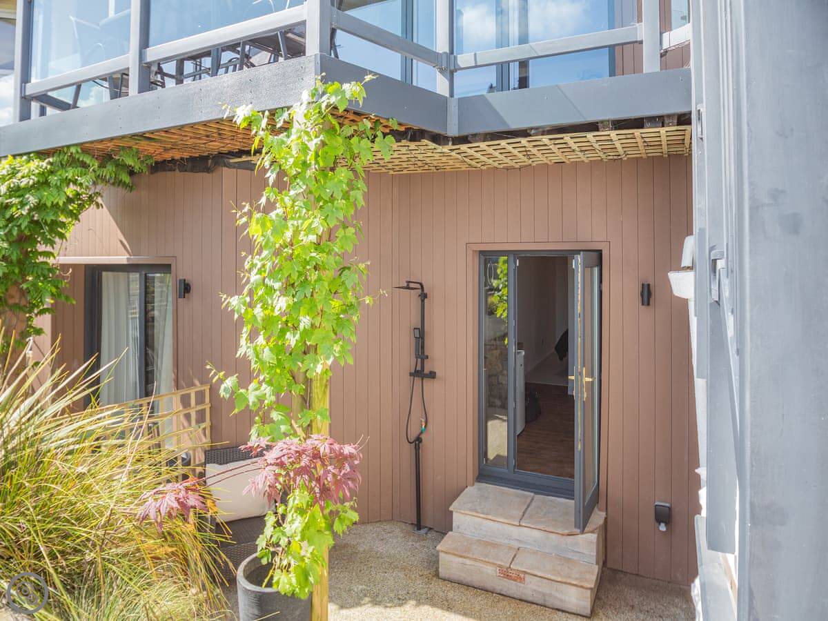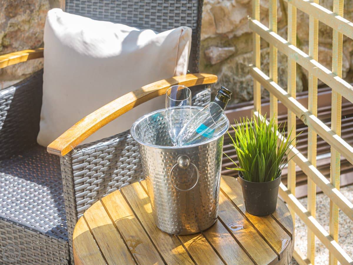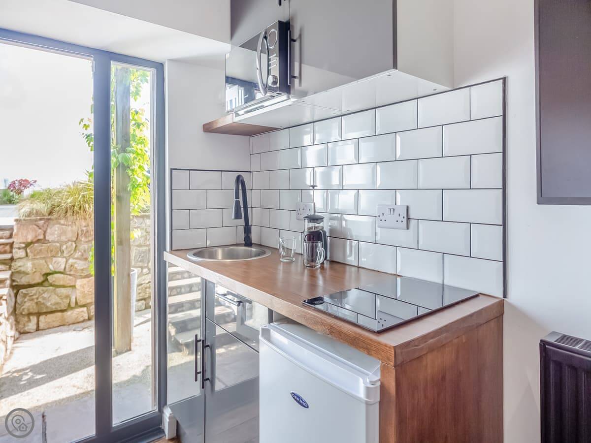 It’s a five star rating place, so it’s been done up nicely. Kingsize bed, en-suite shower. The living room and kitchen are open plan. There's a small patio area with table and chairs.