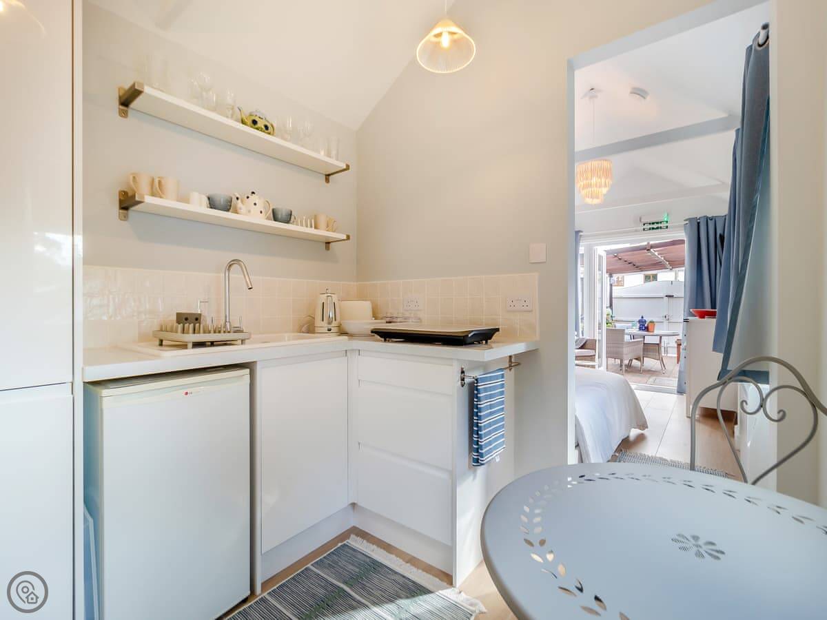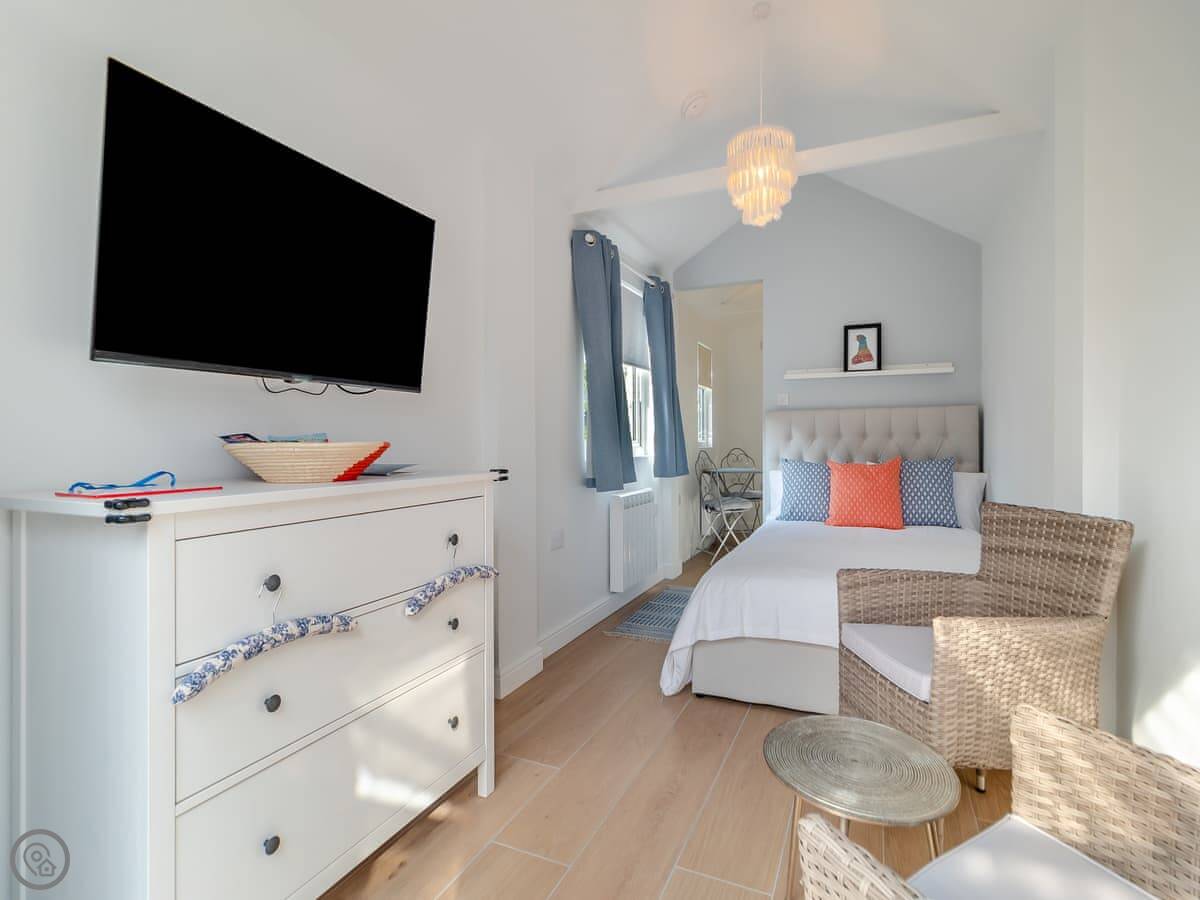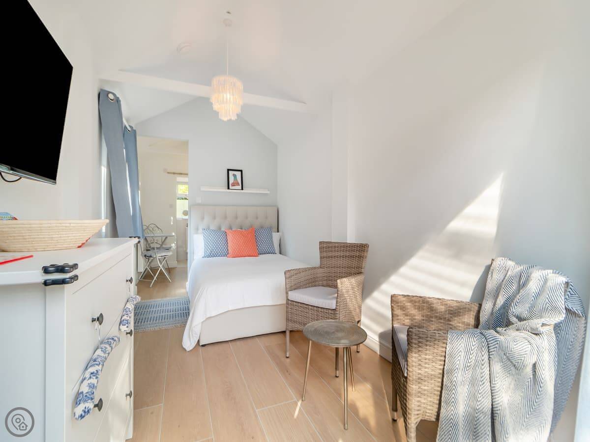 It's a four star place for two people. One bedroom and one bathroom. The main room is open plan. There's a day bed in the living area if a friend comes along. There's parking right outside.