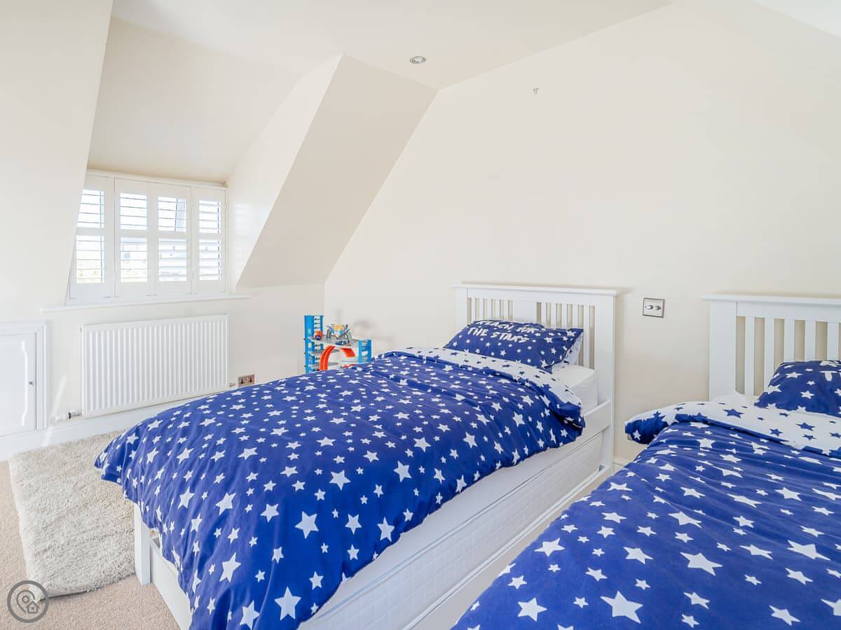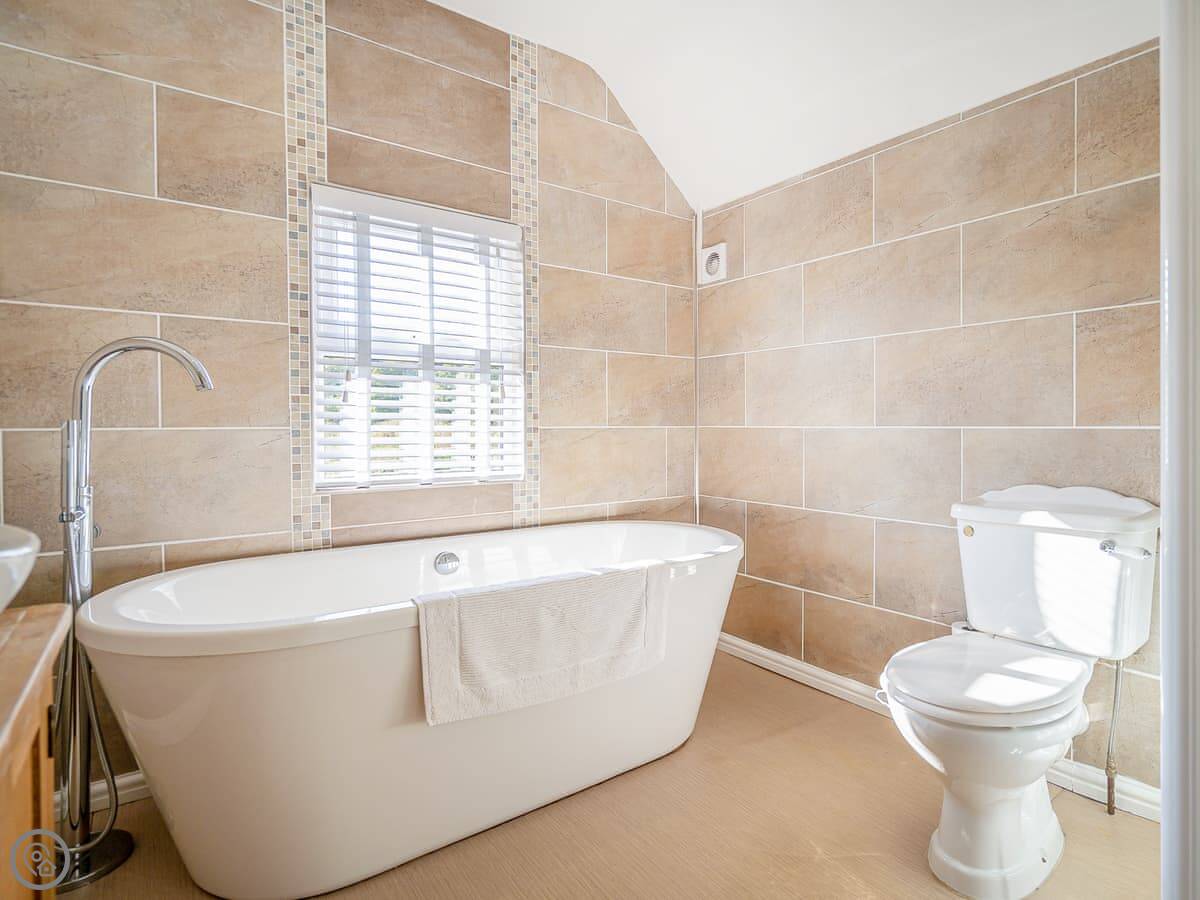 It sleeps six. Three floors: two bedrooms on the first floor and a twin room up on the second. There's one bathroom, which has a roll-top bath with a shower attachment. It's a 4 Star place, so it's comfortable and has things like the wood burner and WiFi. The stairs to the top floor are a bit steeper, as you'd expect.