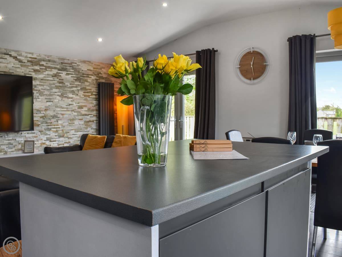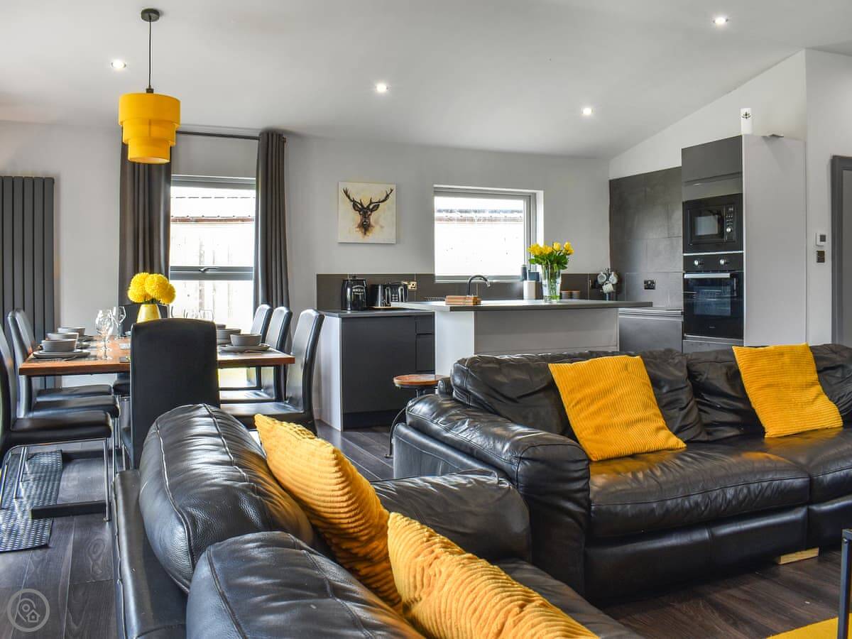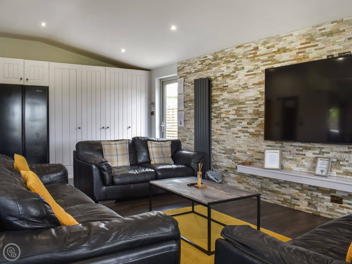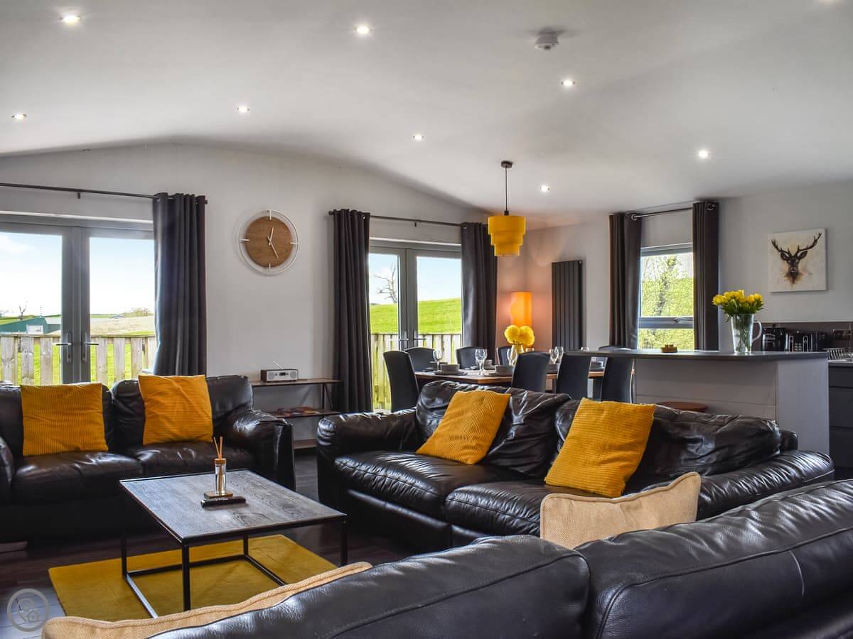 Downstairs is open plan. Big kitchen, a dining table that seats ten, and leather sofas facing the patio doors. The view is over fields, west-facing, so you get the sunsets. Outside there's a patio with a firepit and a private hot tub.