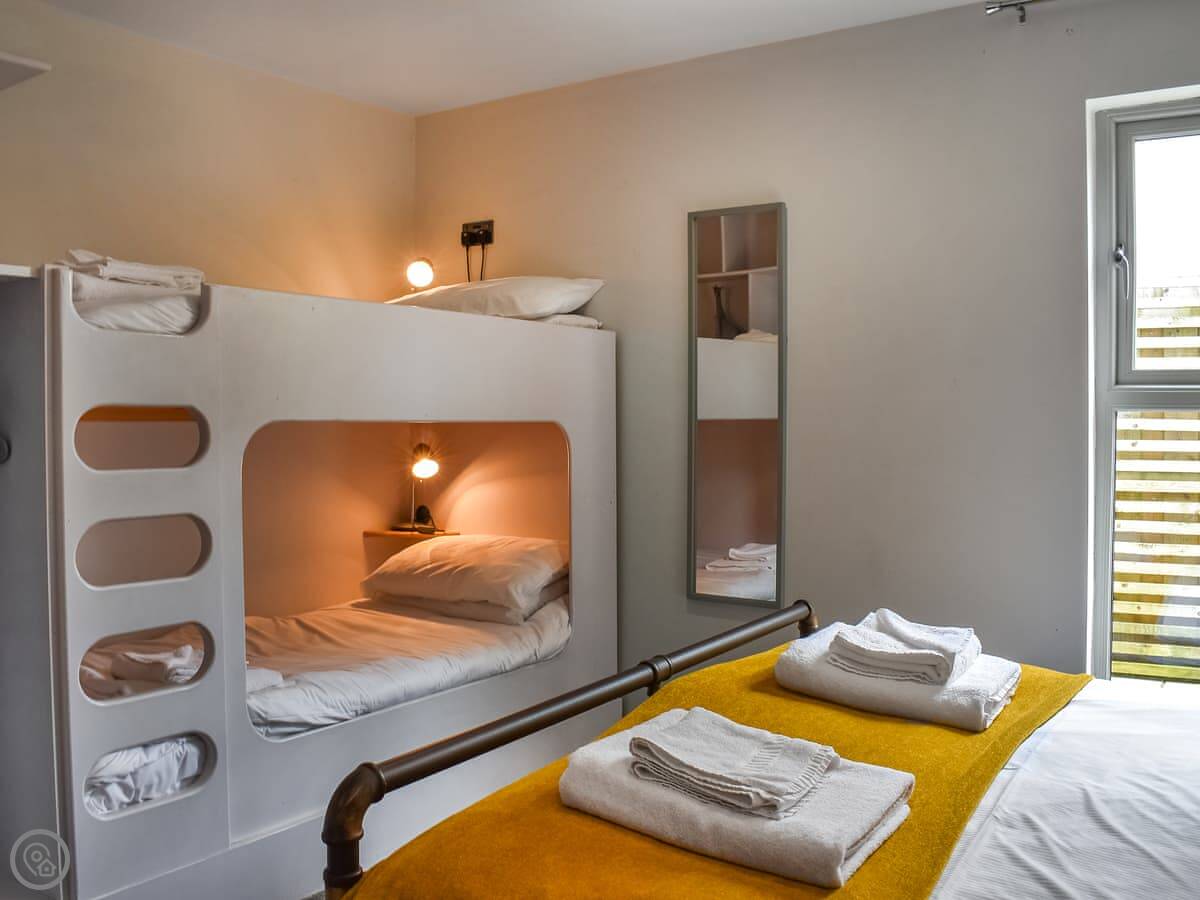 You've got four bedrooms. Two of them are kingsize with their own shower rooms. There's a family room with those little cabin-style beds for kids, and a twin room. All the rooms have TVs. There are three bathrooms in total. The main one has a bath and a shower.