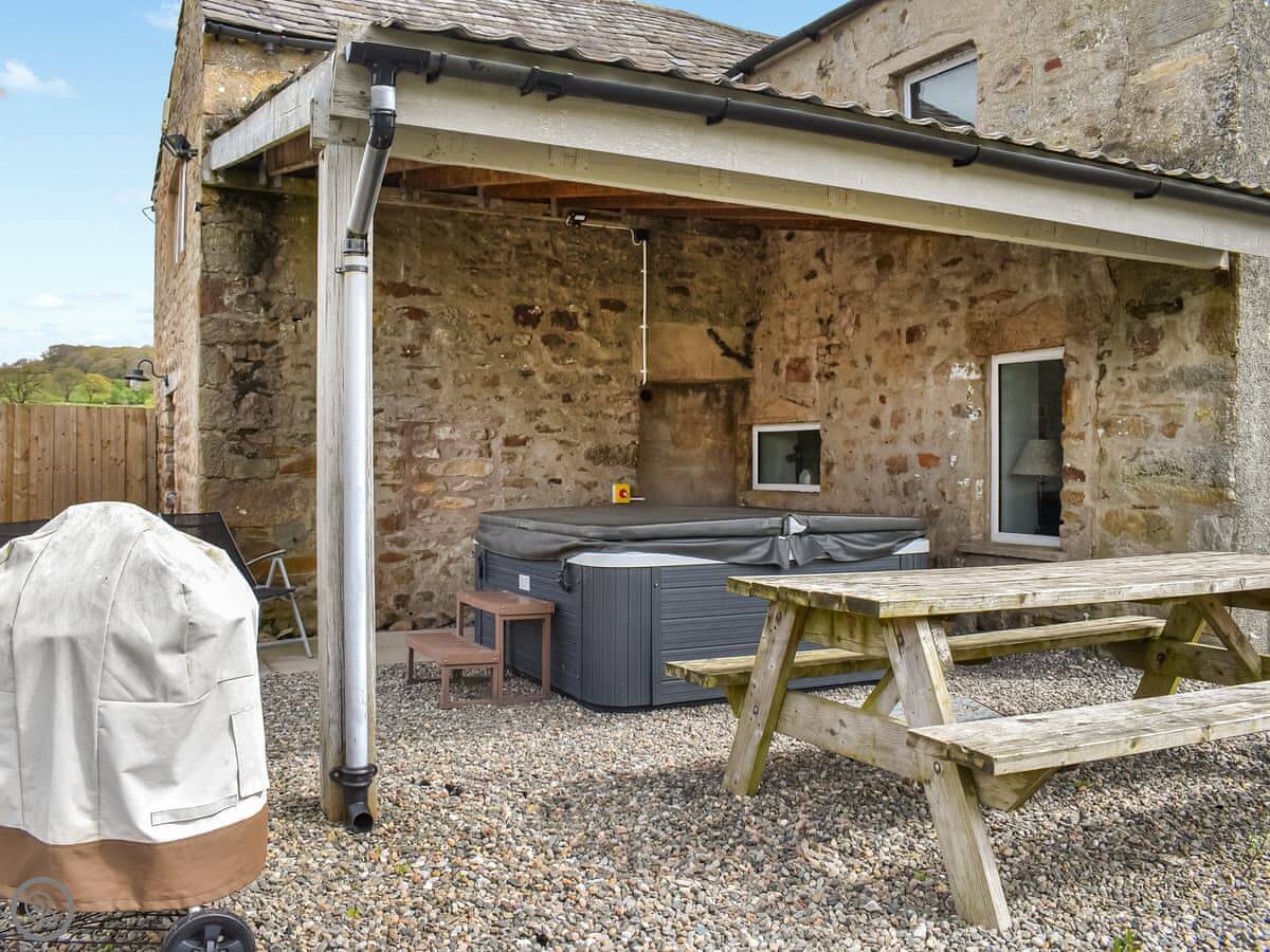 Outside there's a patio with a seating area, a fire pit, and a charcoal barbecue. There's a covered hot tub as well. The garden is enclosed.