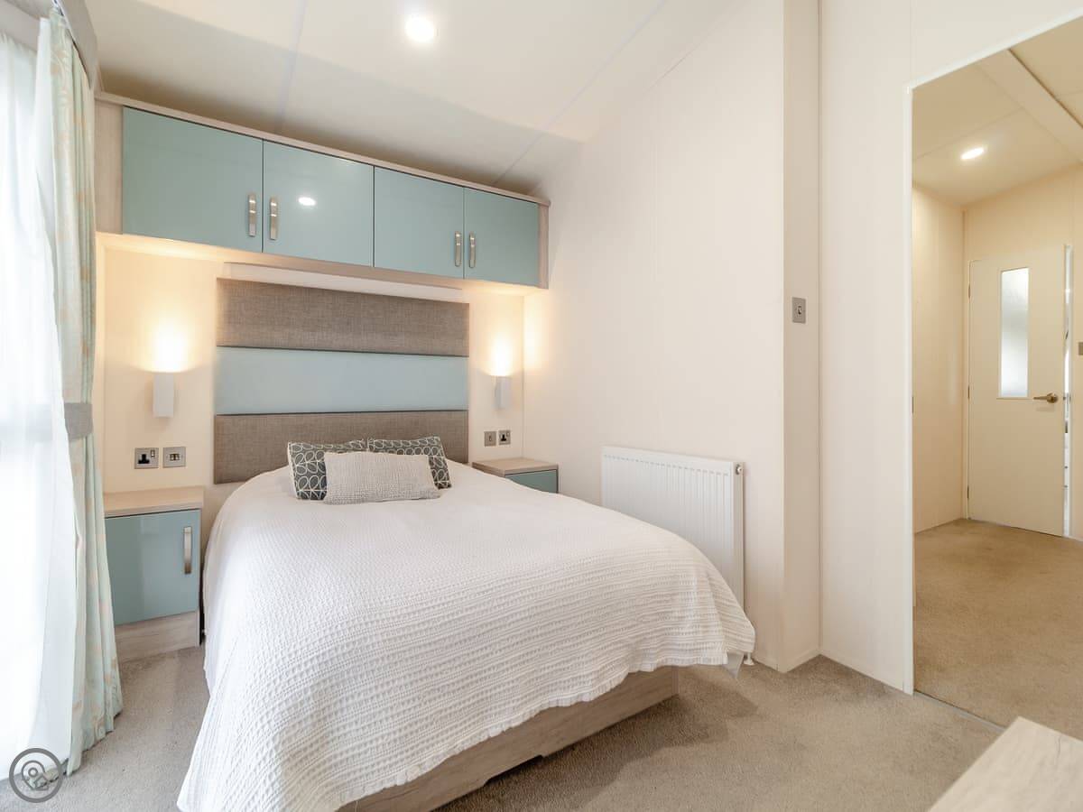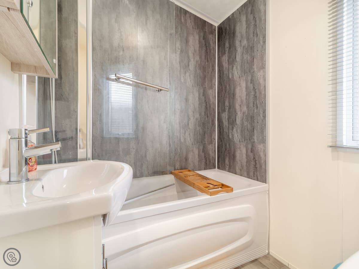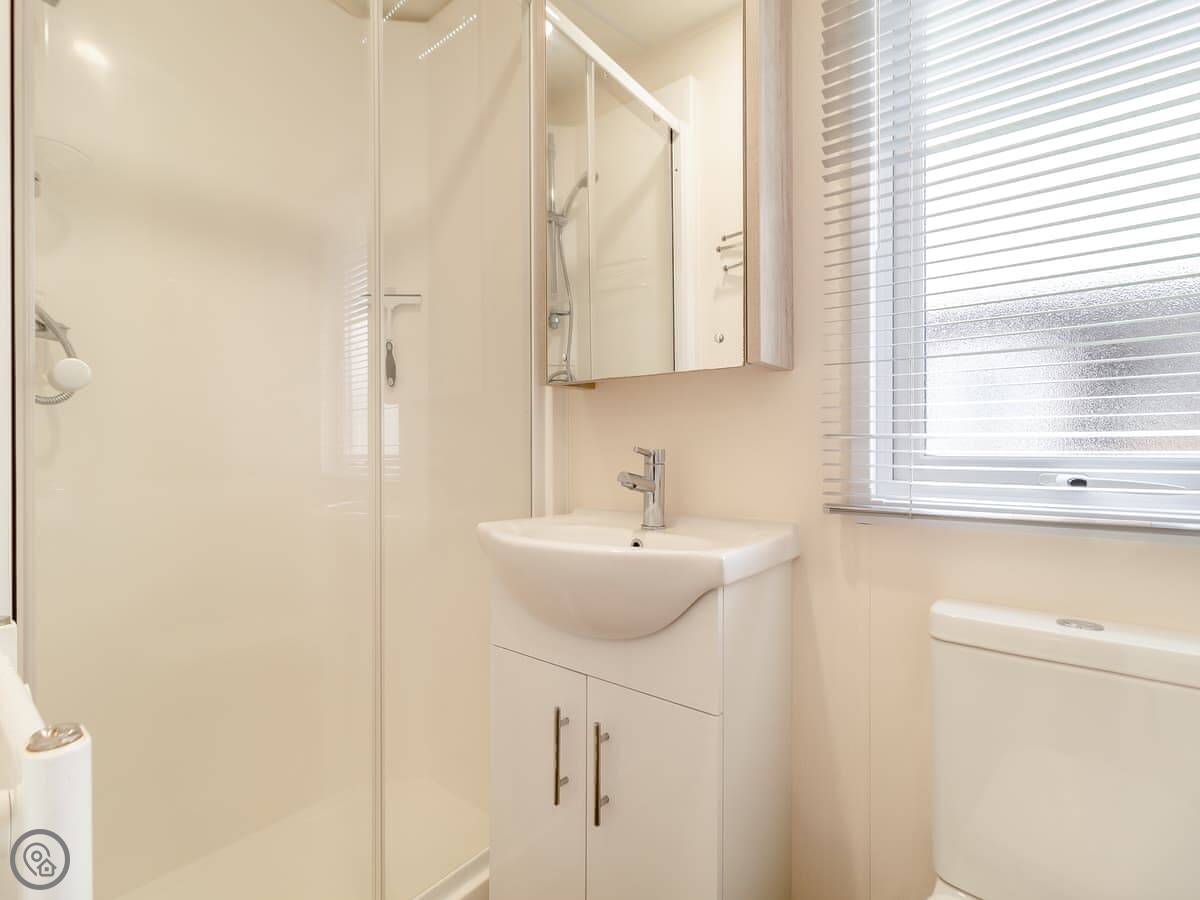 The lodge sleeps six. There are two proper bedrooms, then a sofabed in the living area. Two bathrooms, one with a shower and one with a bath. It's got a 4 Star rating. Everything's clean and tidy and there's Wi-Fi.