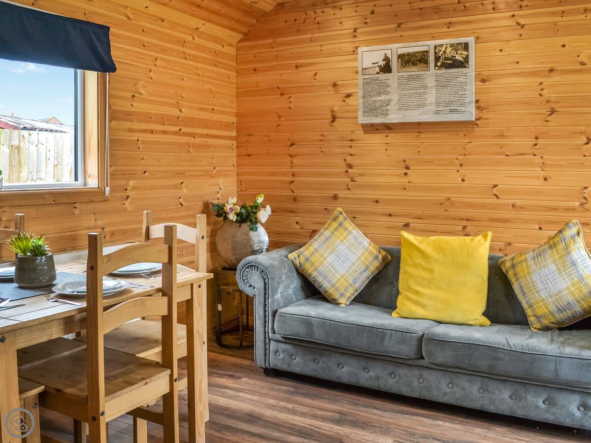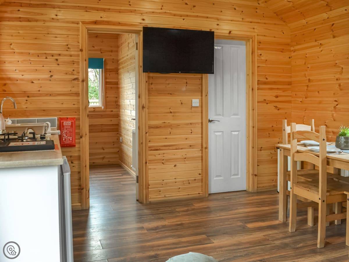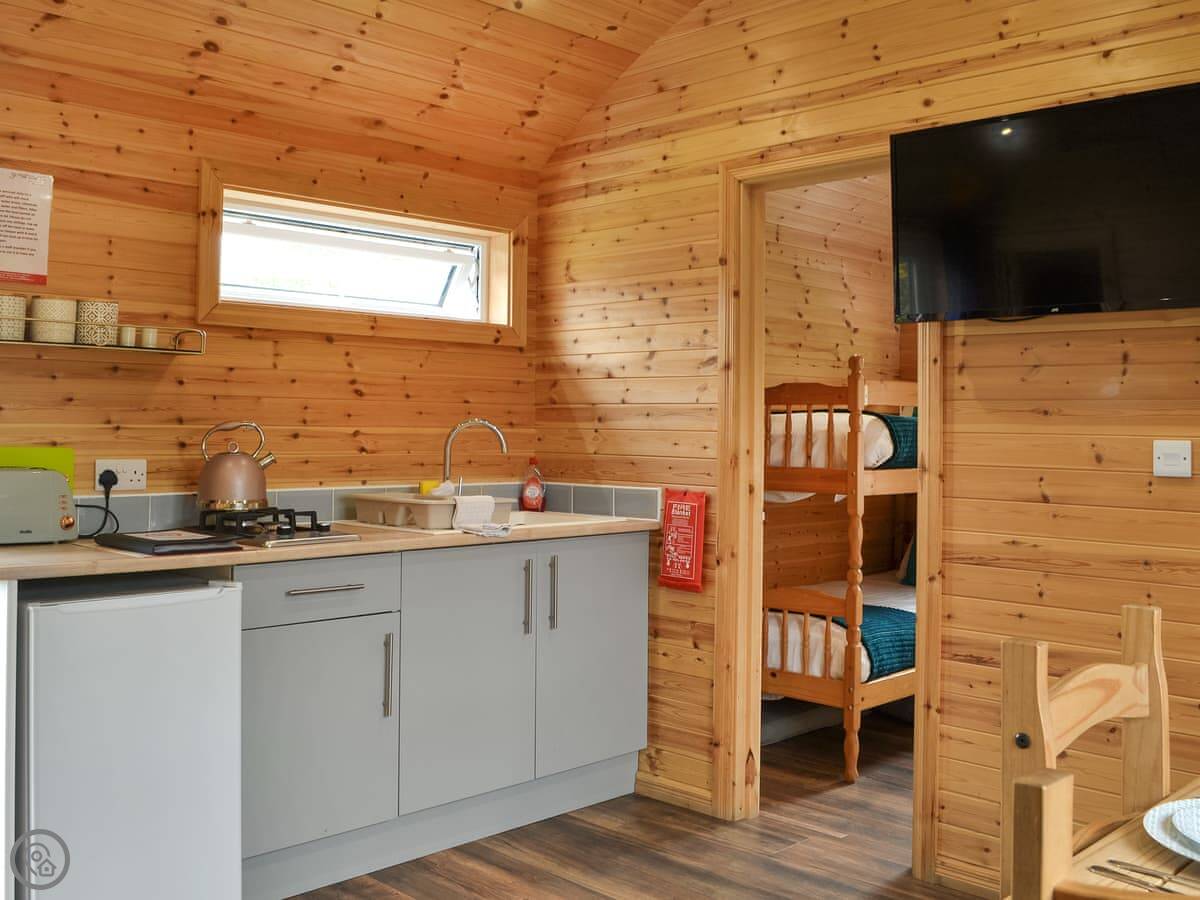It sleeps four. There's a kingsize bed and a set of bunk beds. One shower room. Everything's open plan inside. It's got a small kitchen area with a gas hob and a fridge. There's a table to eat at, but most people just go to the pub. It's about ten steps from your door to theirs.
