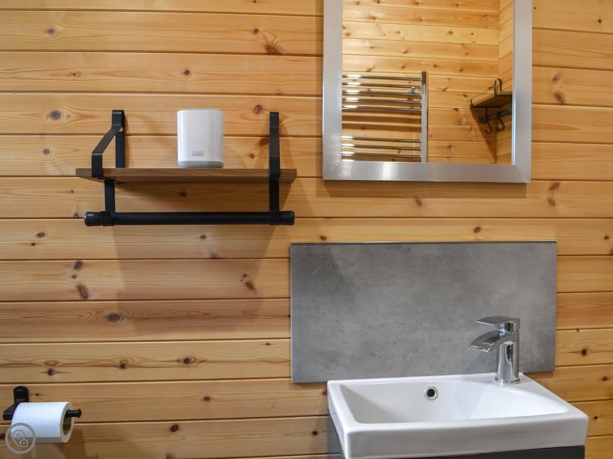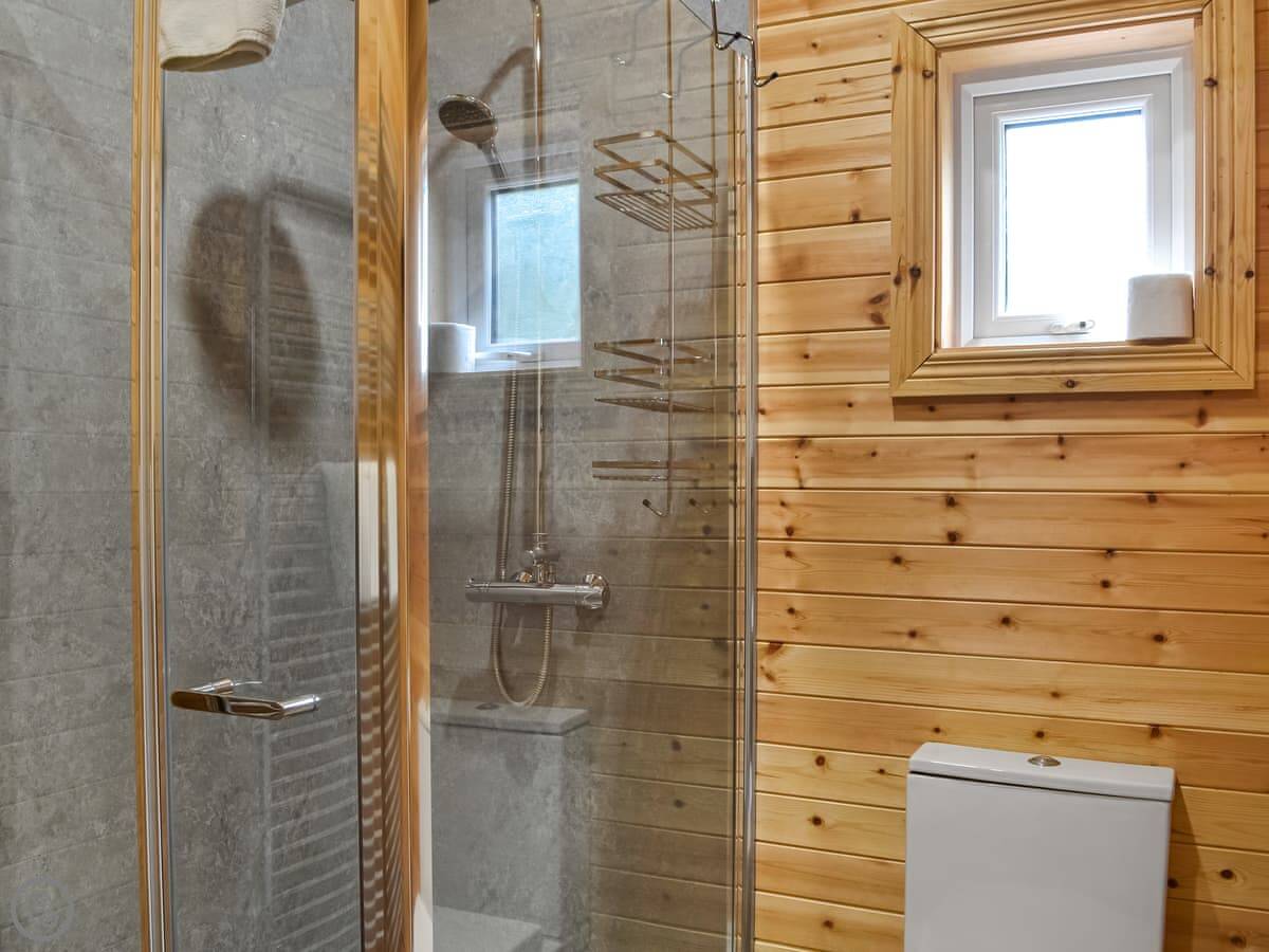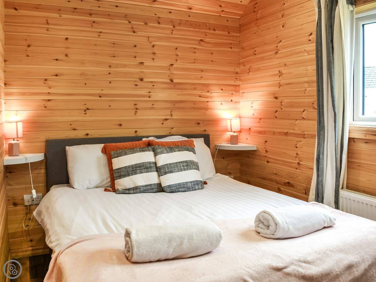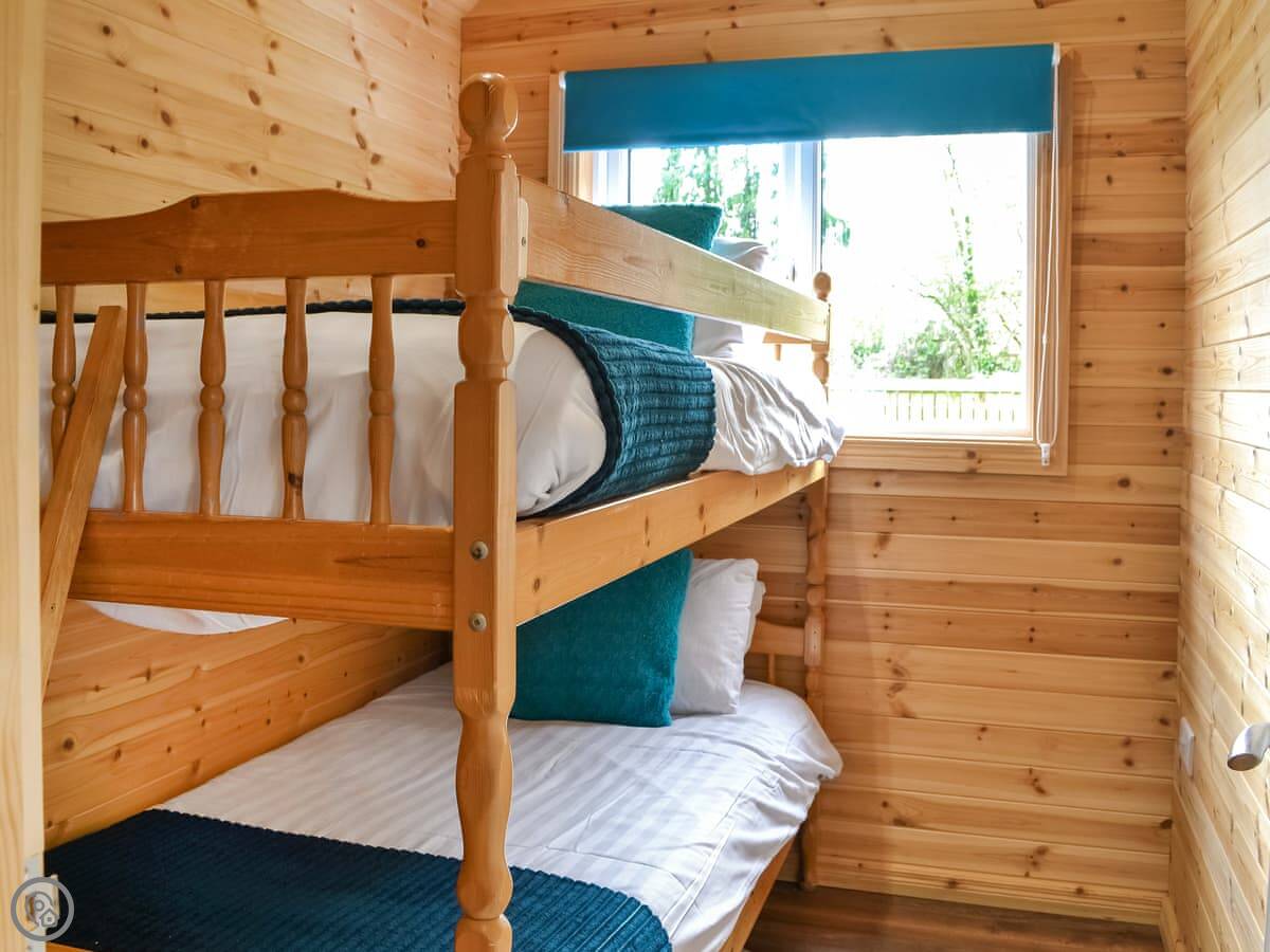 It sleeps four. There's a kingsize bed and a set of bunk beds. One shower room. Everything's open plan inside. It's got a small kitchen area with a gas hob and a fridge. There's a table to eat at, but most people just go to the pub. It's about ten steps from your door to theirs.