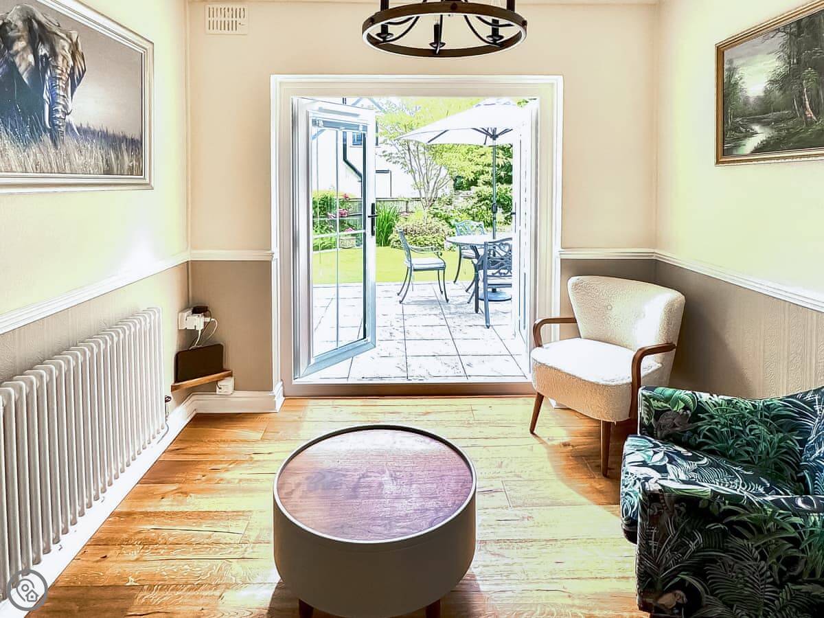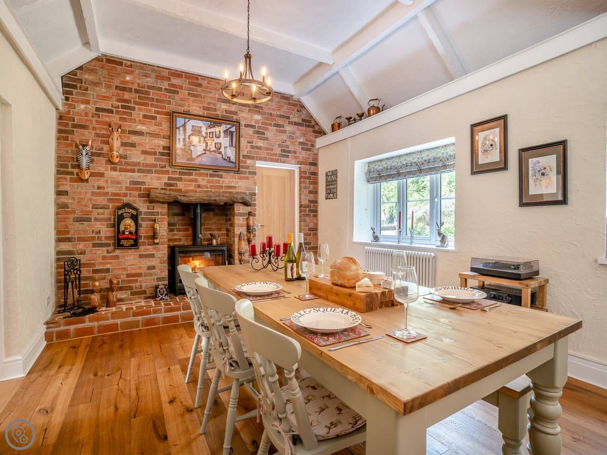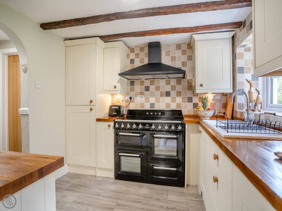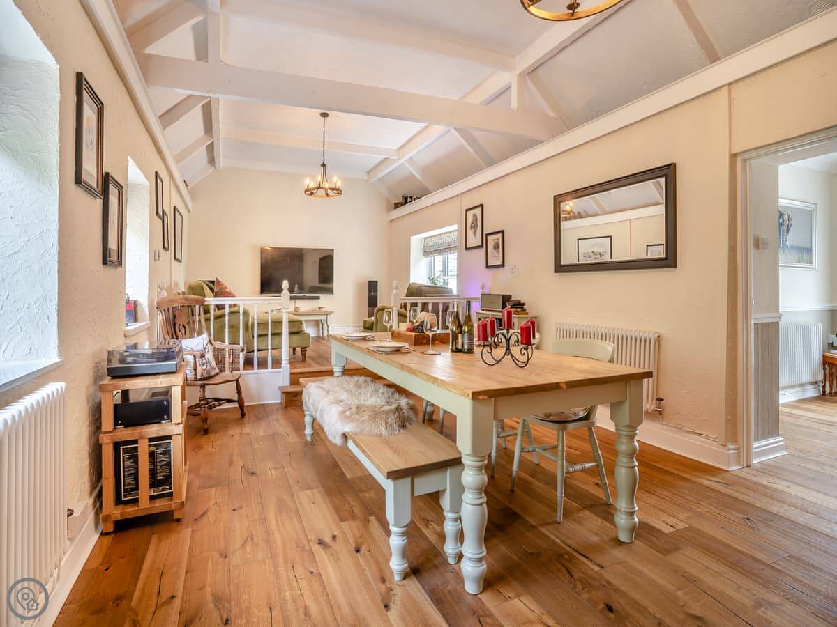 Inside, it's open plan downstairs. There's a wood burner. The kitchen is separate from the living area. The ceilings have exposed beams and the floors are solid oak, so it's quite a traditional feel. It has WiFi and a washing machine. Bedding and towels are included. There's a cot if you need one. You can bring up to two dogs.