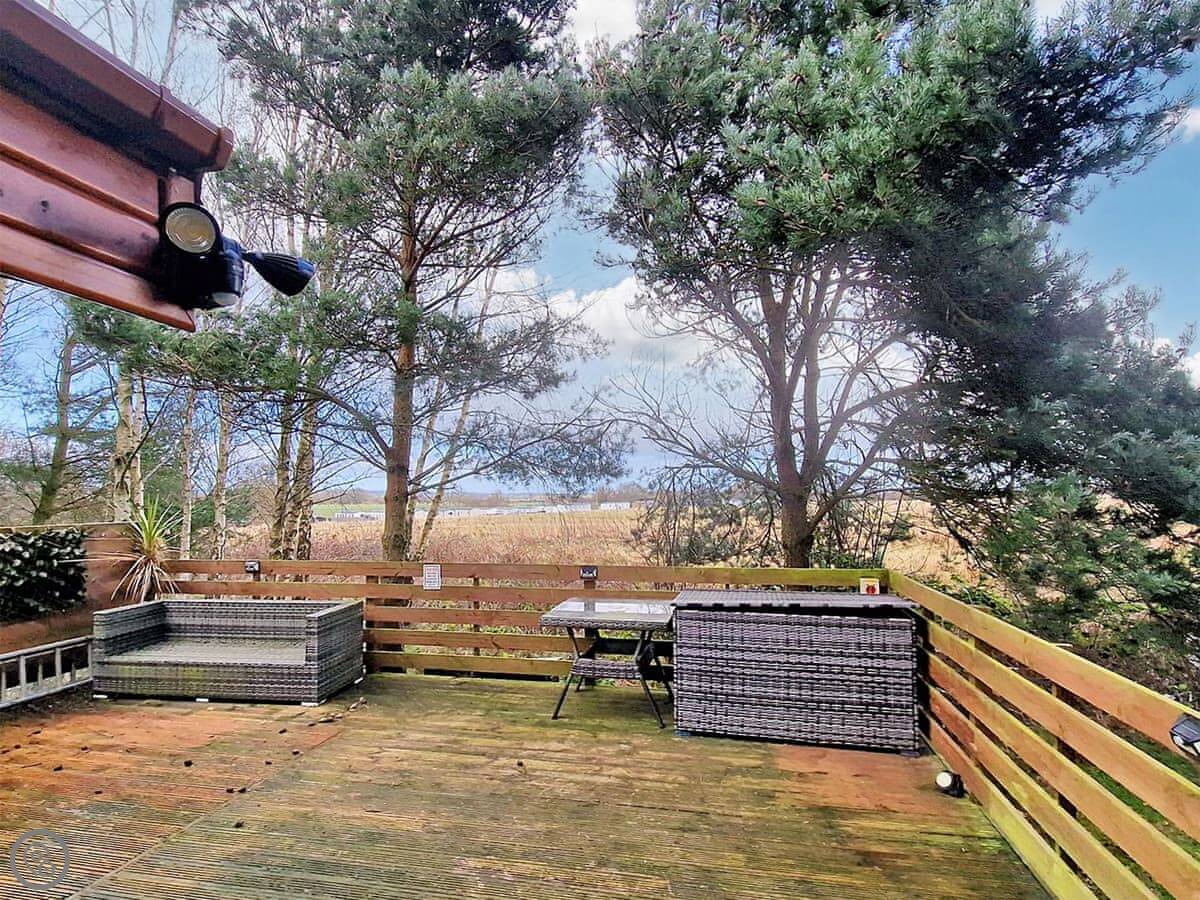 The main thing is the decks. There's one at the front and one at the back. The back one looks out over fields and gets the sun in the evening. There's a hot tub on one of them. Inside, it's open plan. There's a Smart TV with Netflix, a washing machine, and a dishwasher. It's got a 4 Star rating, so it's comfortable and well-equipped.
