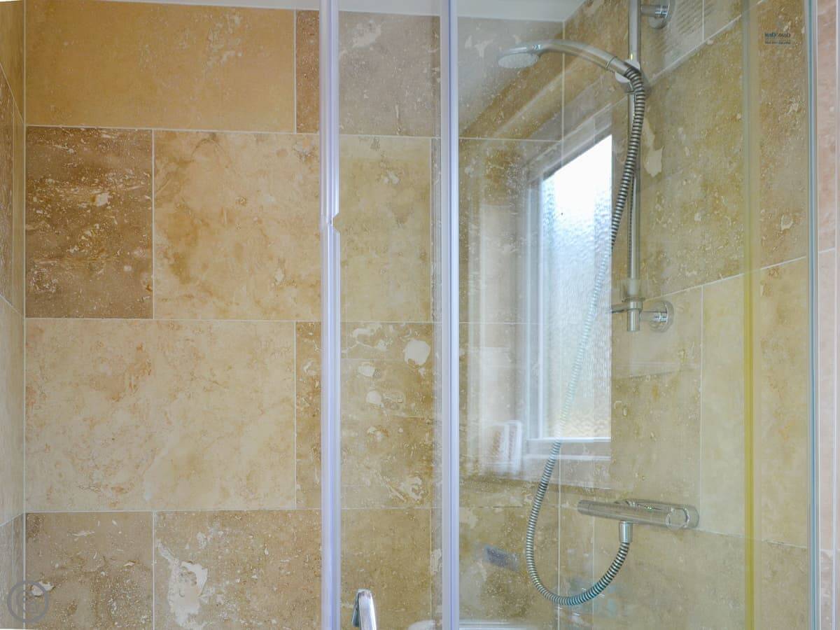 The rating is 3 Star. It's clean and everything works, but it's not high-end. The shower is a walk-in one. The living area is all open-plan, with a kitchen at one end. There's a washing machine and bedding is included.