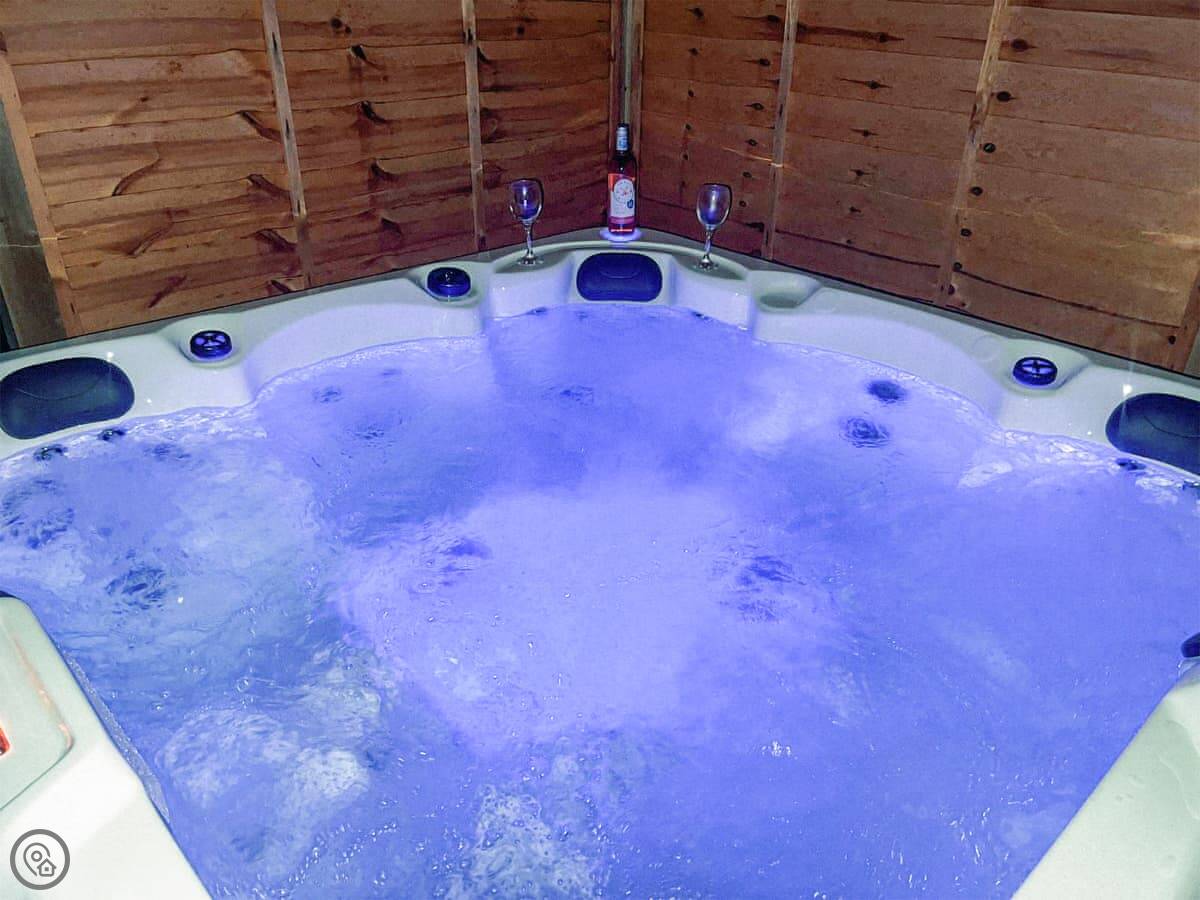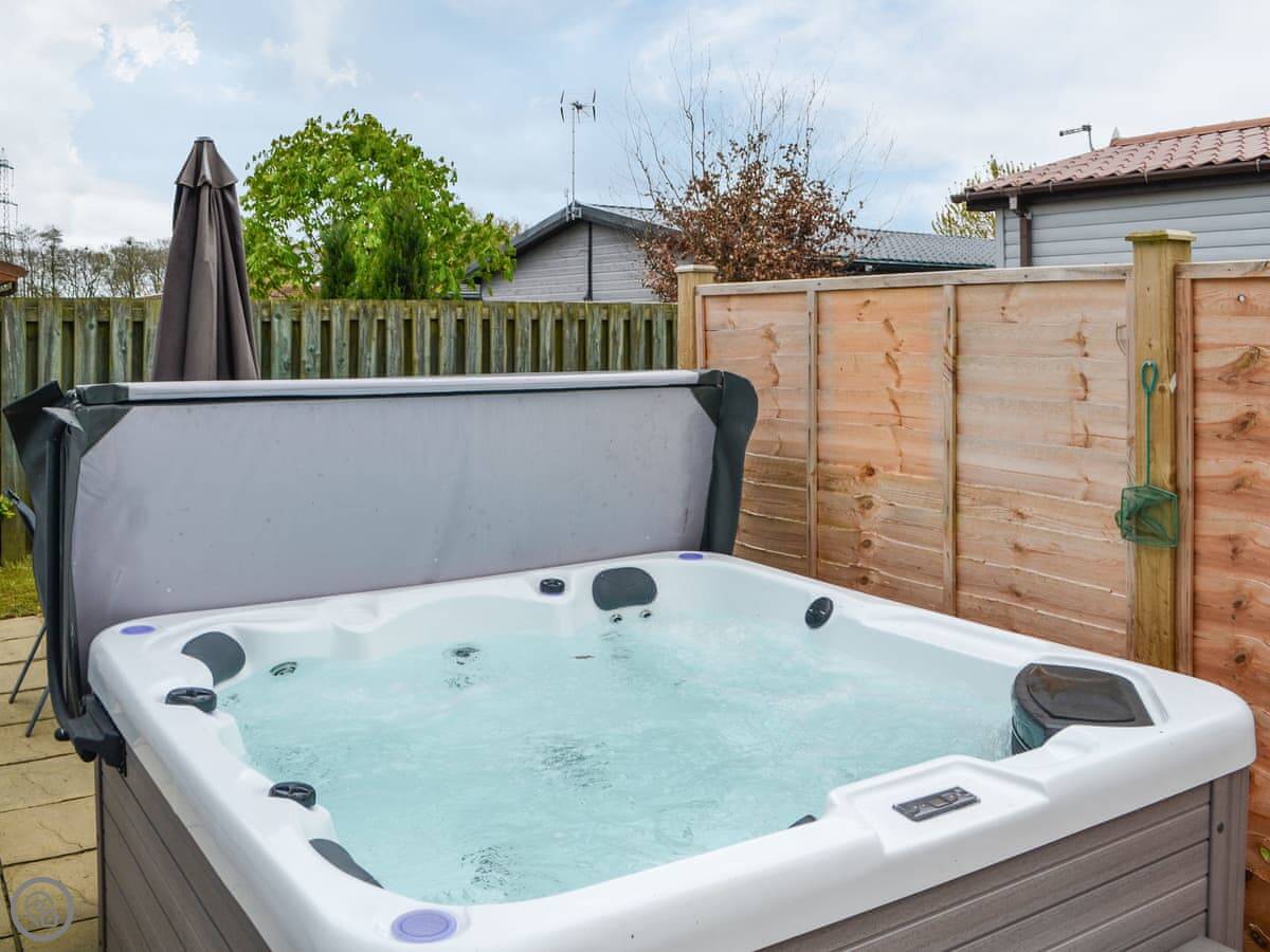 Outside, there's a small patio area and a private hot tub. You can park right outside.