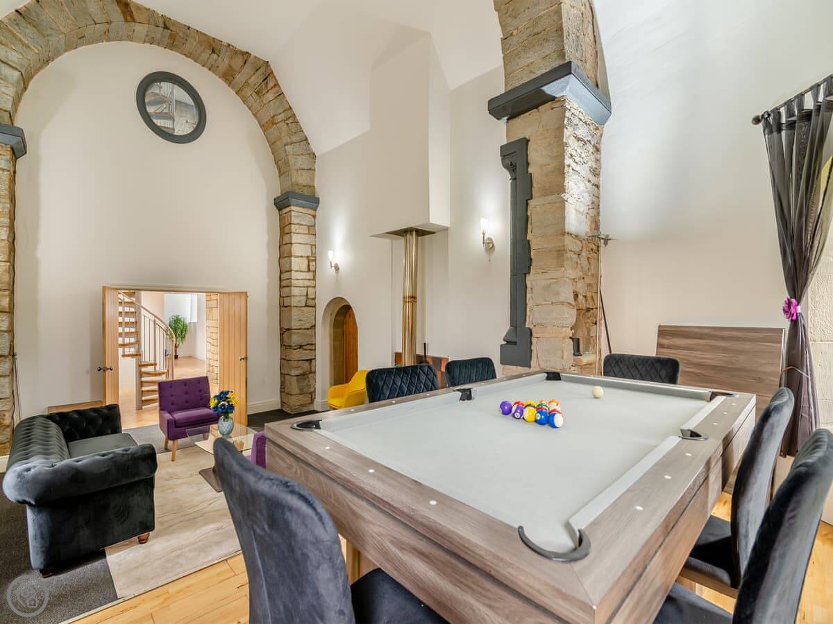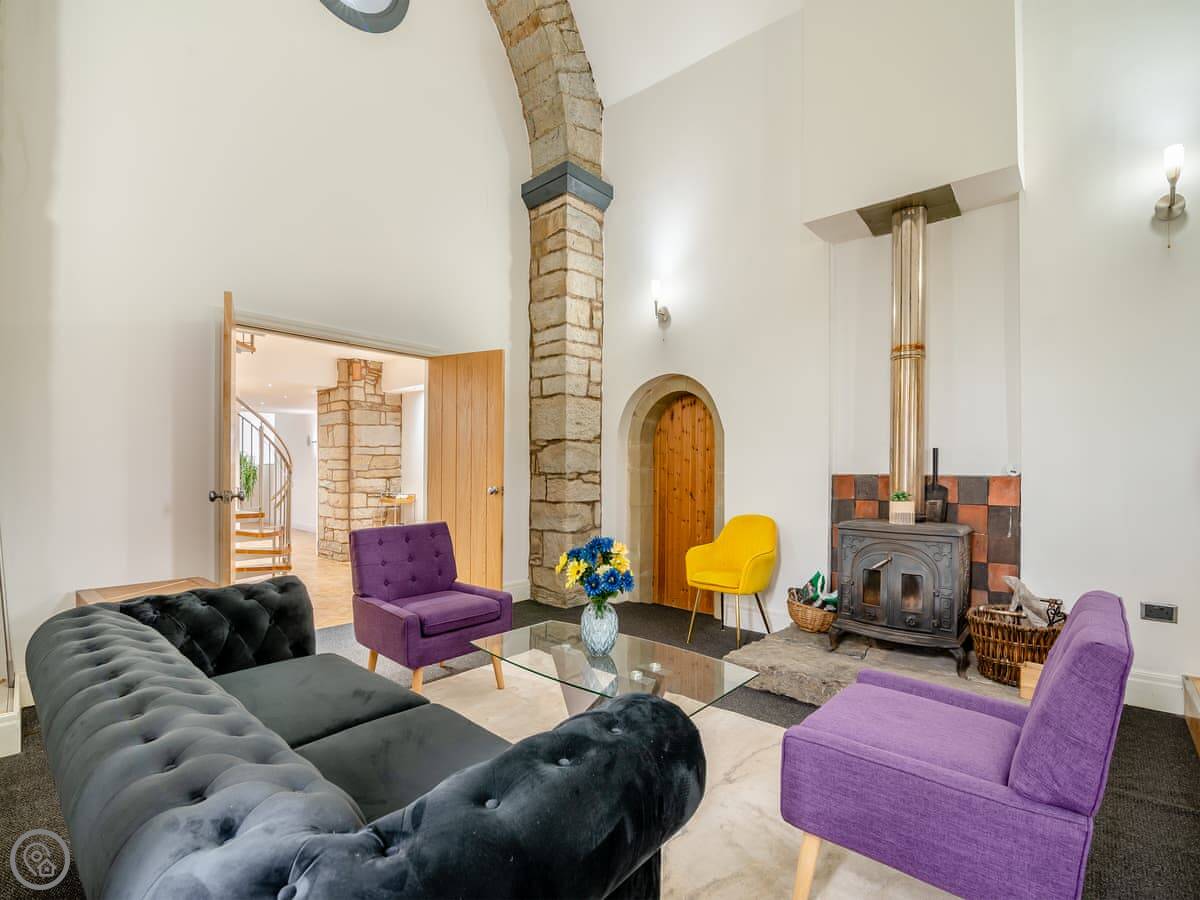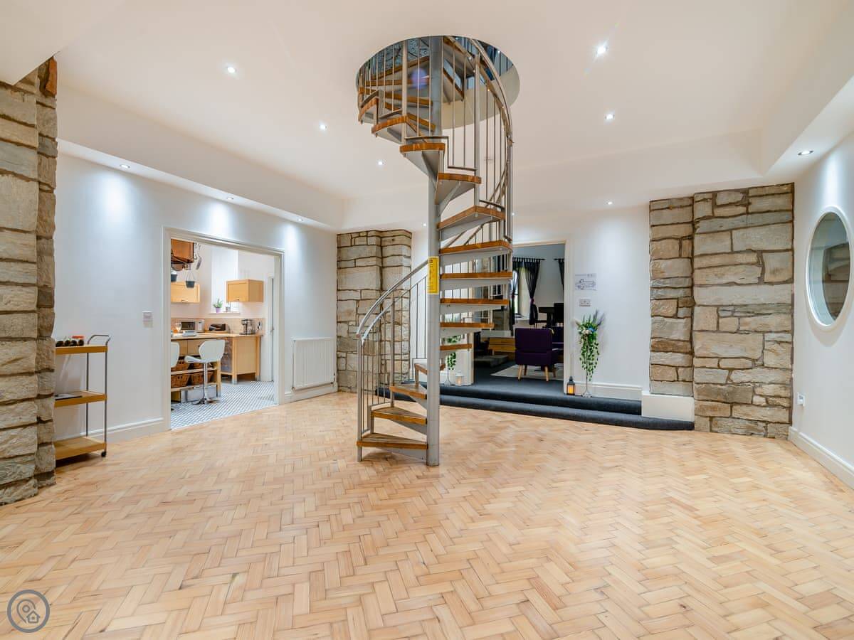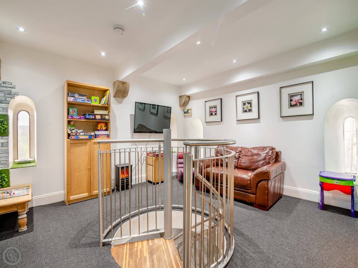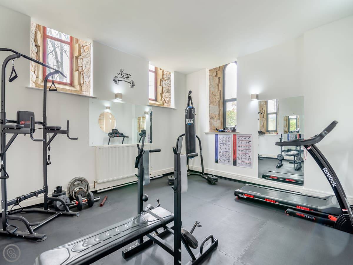 It's a unique place. The main living area is open plan with a wood burner. The original spiral staircase goes up to a room in the tower, which they've set up as a star-gazing room. You should know the stairs are steep and spiral. There's also a private gym and a cinema room with a big TV.