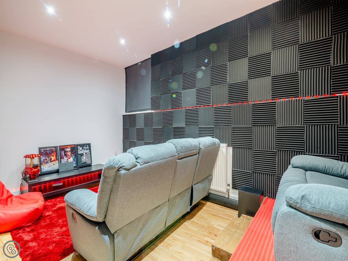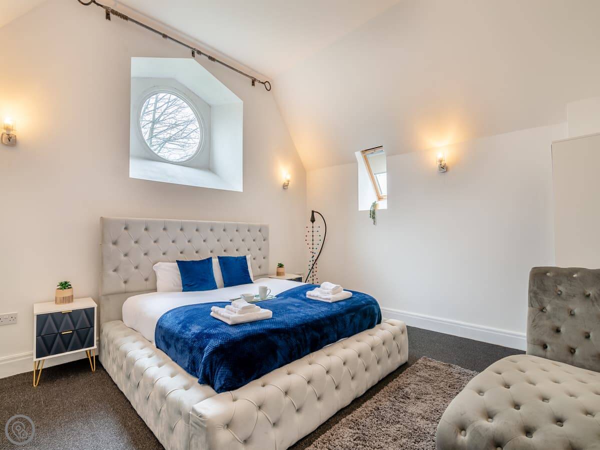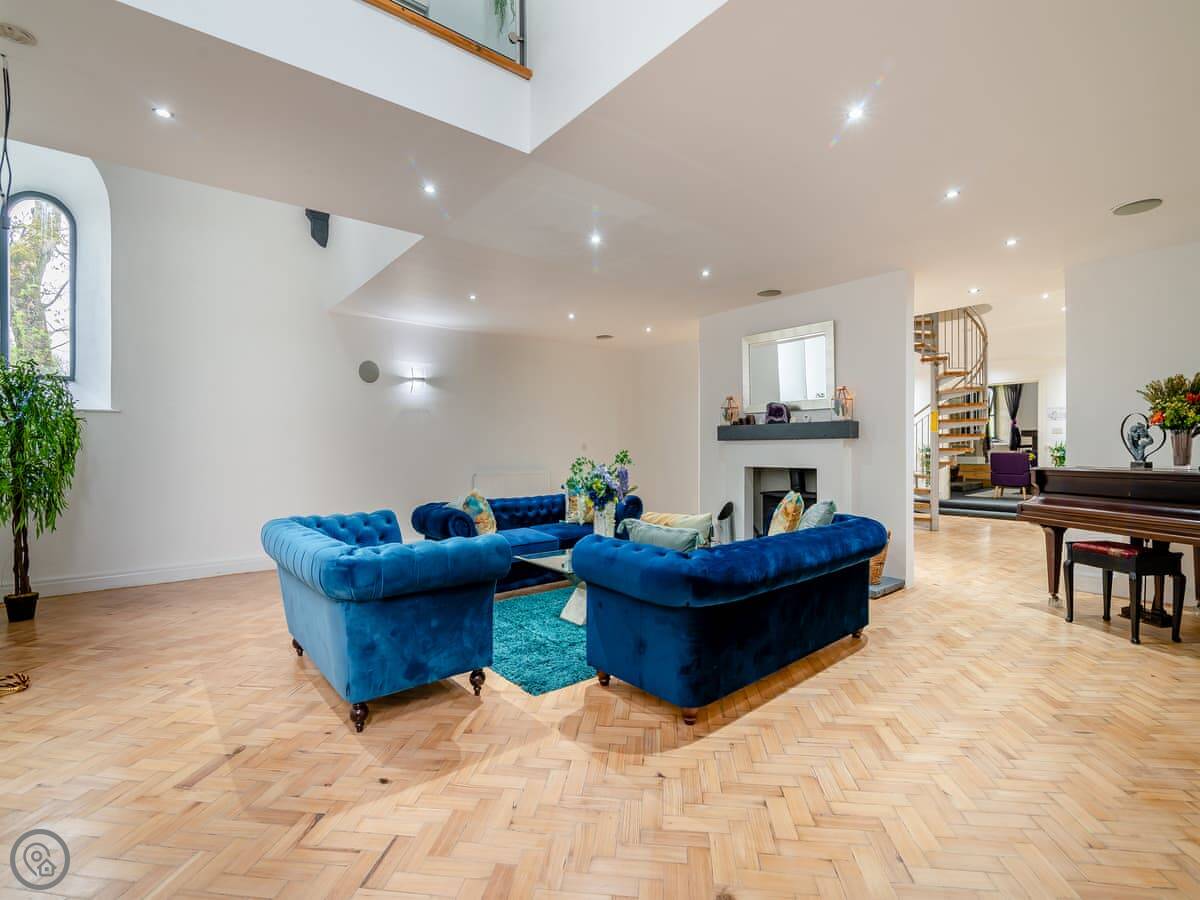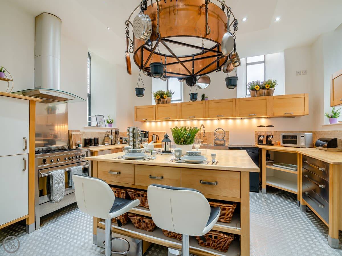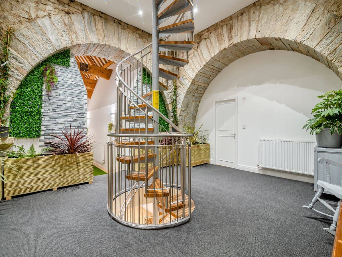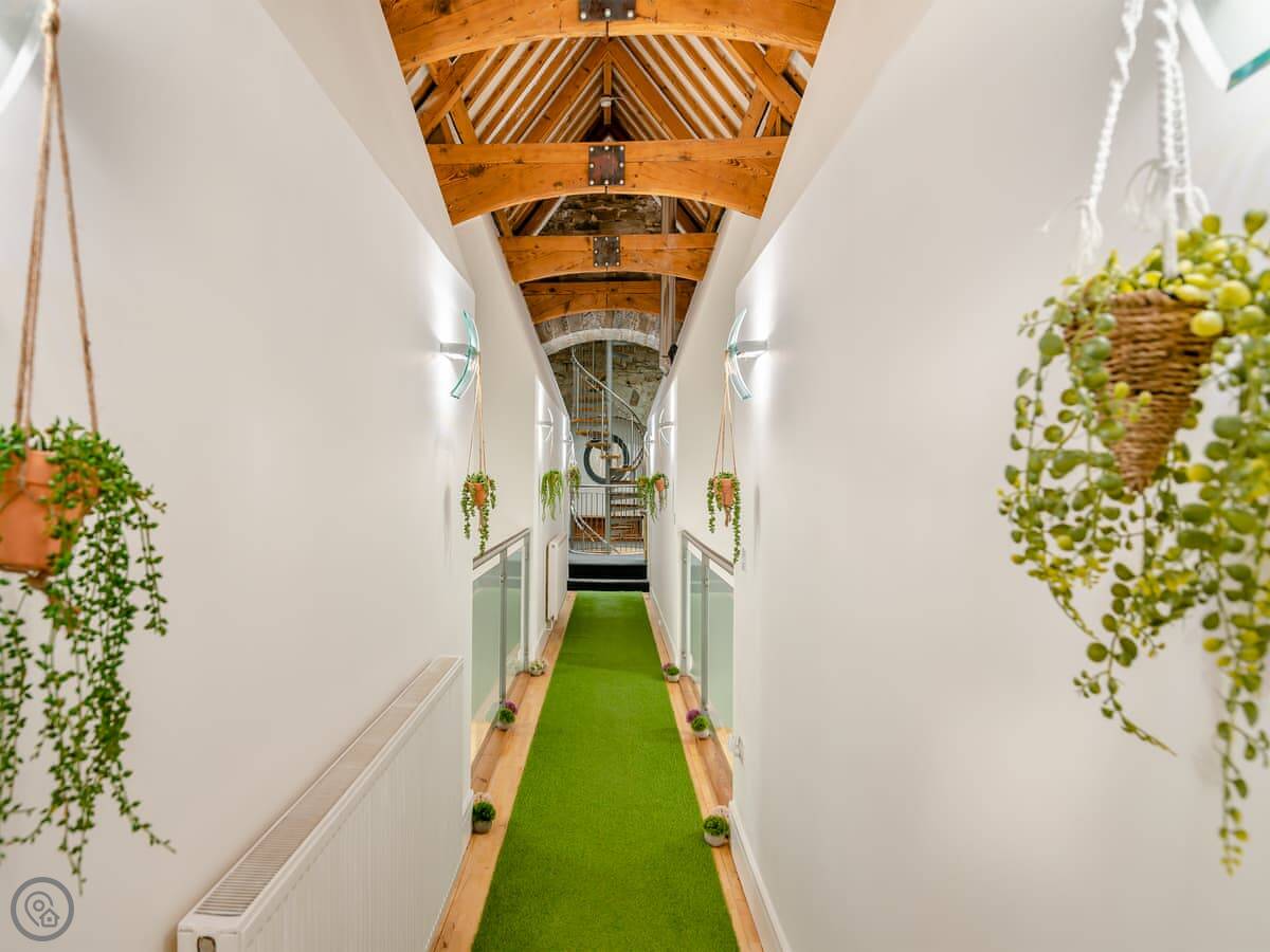 It's a unique place. The main living area is open plan with a wood burner. The original spiral staircase goes up to a room in the tower, which they've set up as a star-gazing room. You should know the stairs are steep and spiral. There's also a private gym and a cinema room with a big TV.