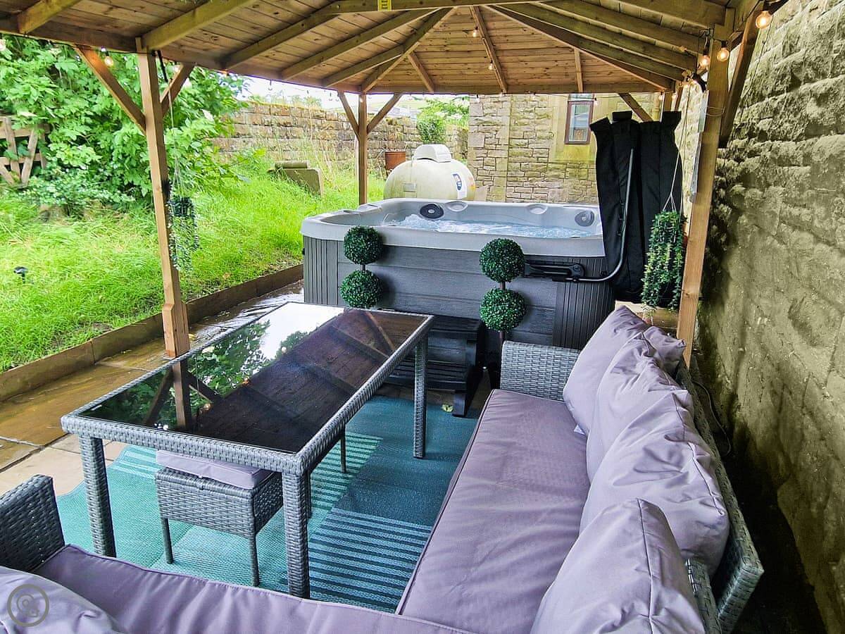 Outside, there's a garden that wraps around the building. The hot tub is out there in a private spot. There's on-site parking.