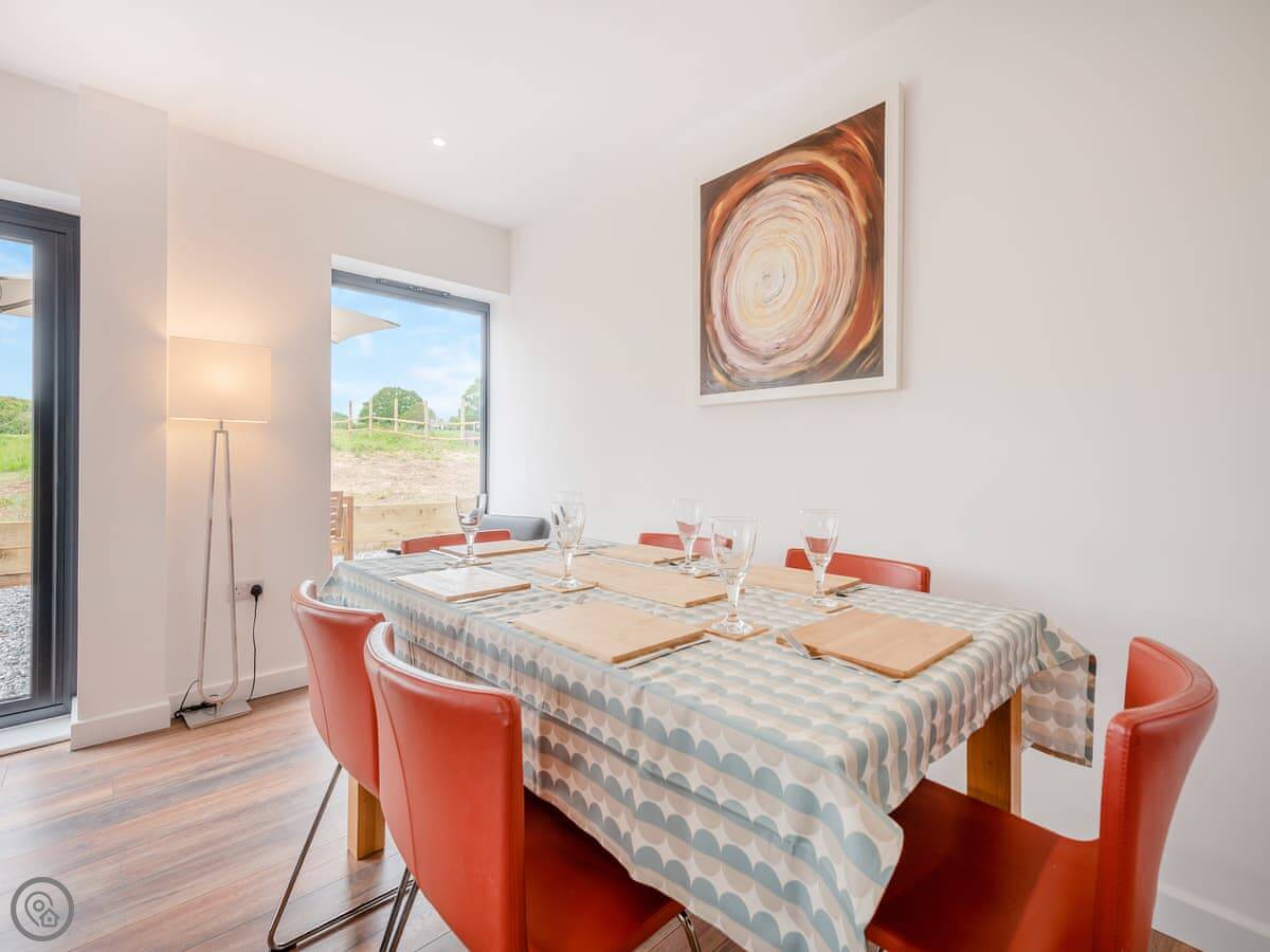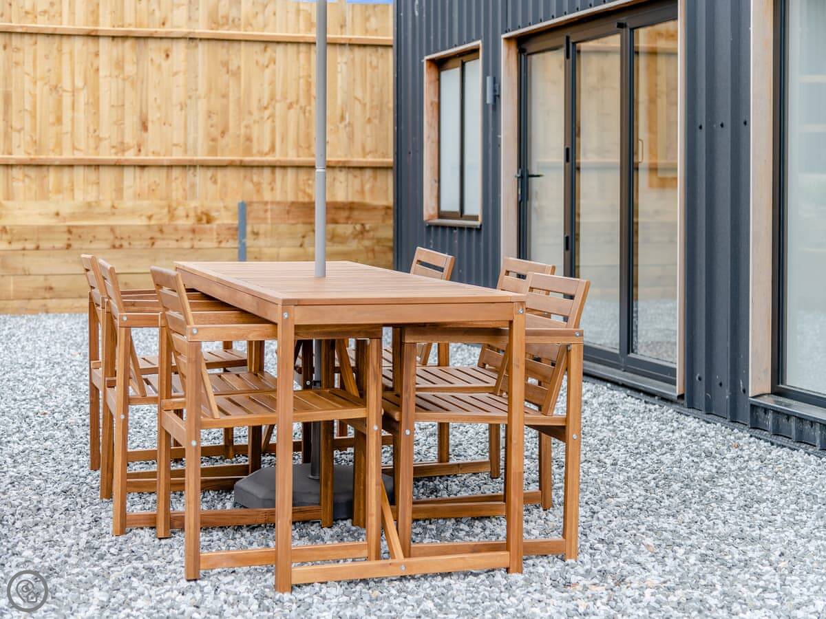 Inside, it's all open plan: living room, dining area, and kitchen together. It's been done to a good standard. There's a patio with garden furniture outside. You often see deer or pheasants in the fields.