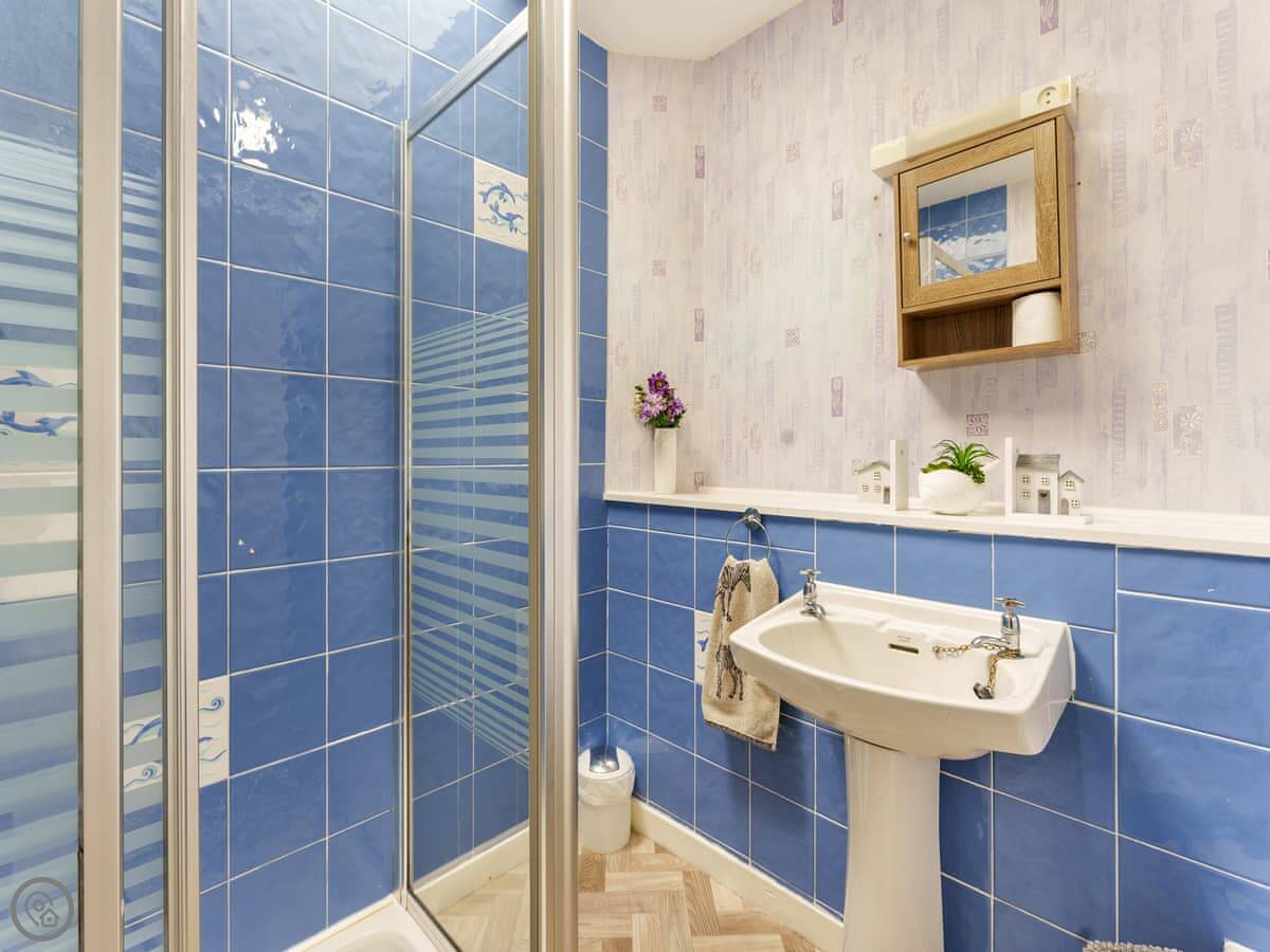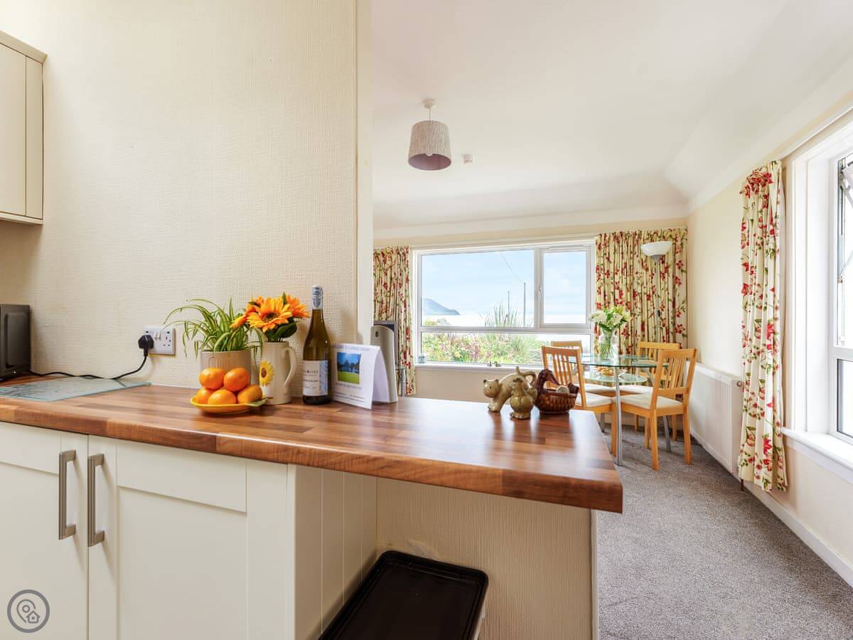 Inside it's open plan, so the kitchen, dining and living area are all one room. There's a washing machine. The WiFi works fine. It's a comfortable set up, and you can sit on the sofa and look out at the sea.