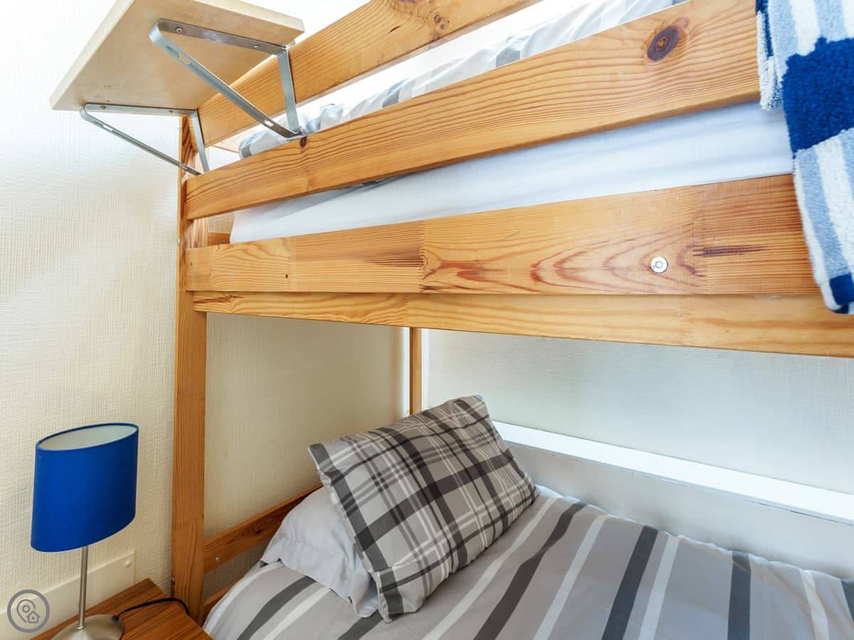 It sleeps four. Two bedrooms, one with a kingsize bed and the other has full-sized bunk beds. The bathroom has a shower, no bath. You'll get bedding and towels.