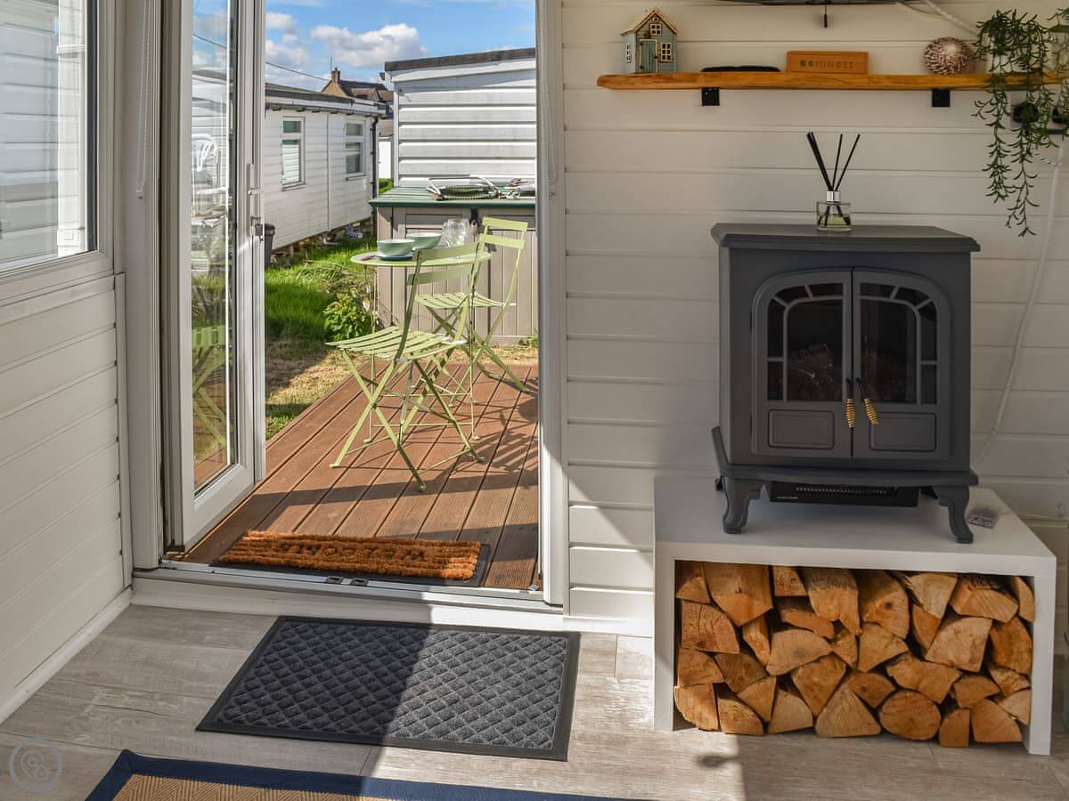 Inside, there's an electric wood-burning stove for atmosphere. French doors open out onto a deck with seating. There's a TV, WiFi, parking, and bedding and towels are included.