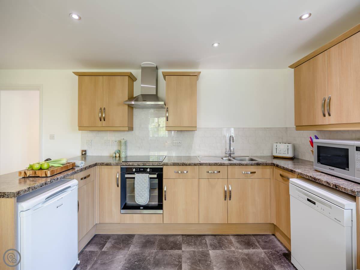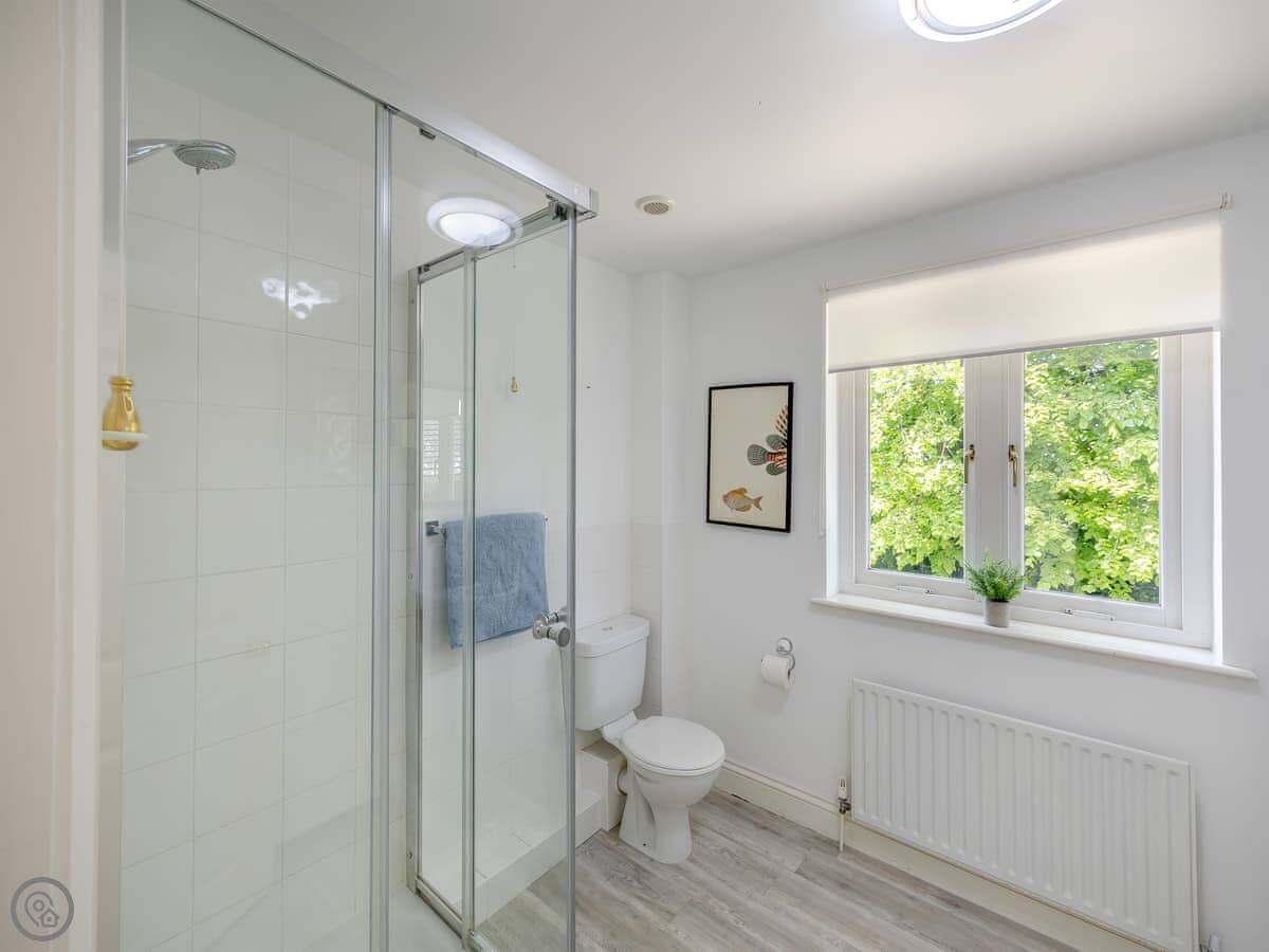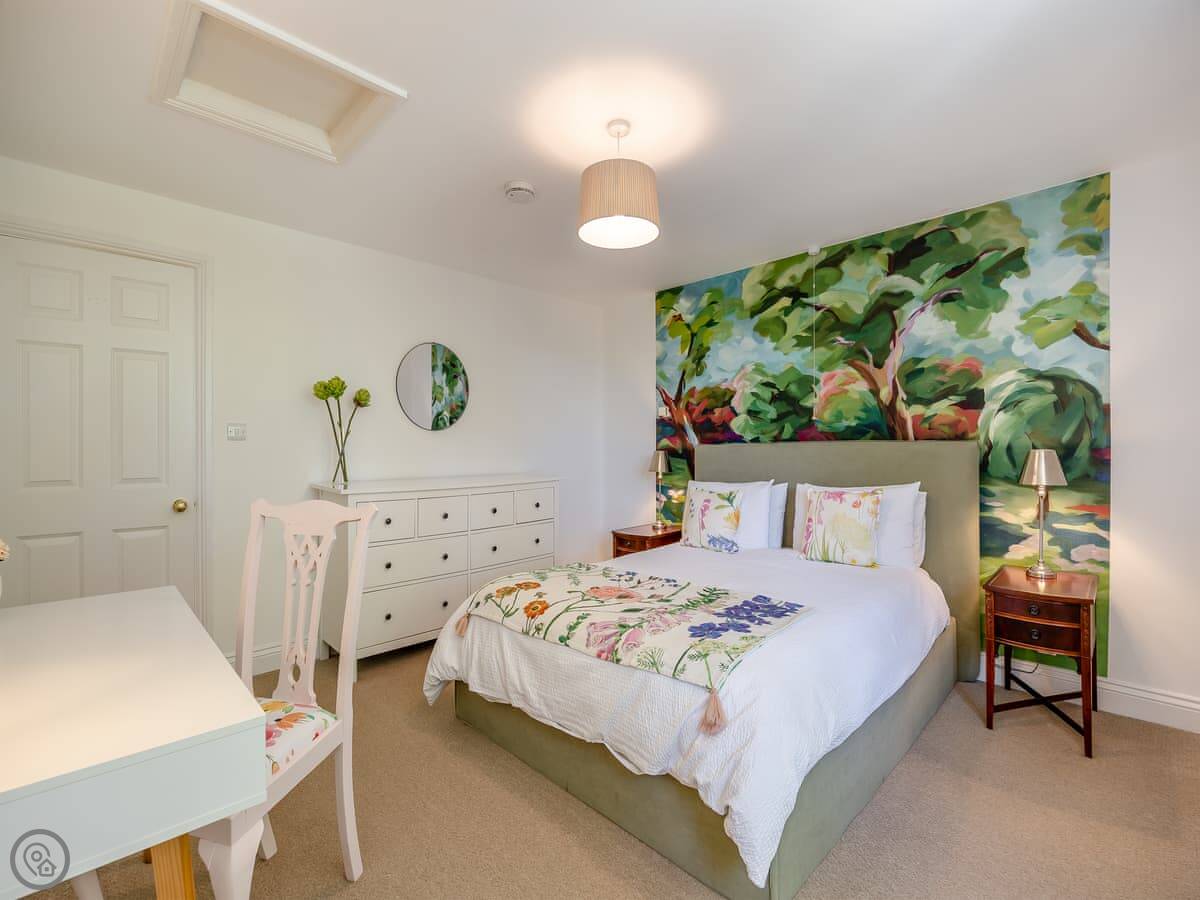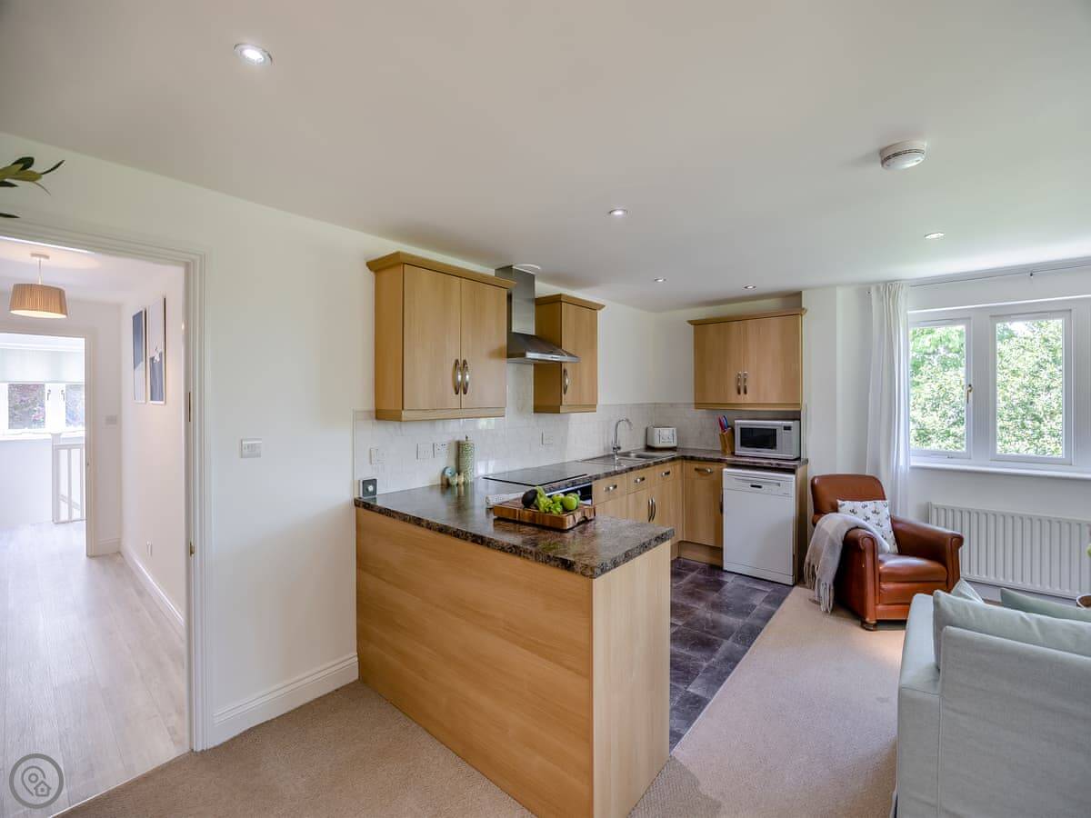 It's a place for two people. One bedroom with a king size bed, one bathroom with a shower. It's got a 4 Star rating, which means it's comfortable and well looked after. The main room is open plan, kitchen and living area together. It looks out over our garden towards the river.