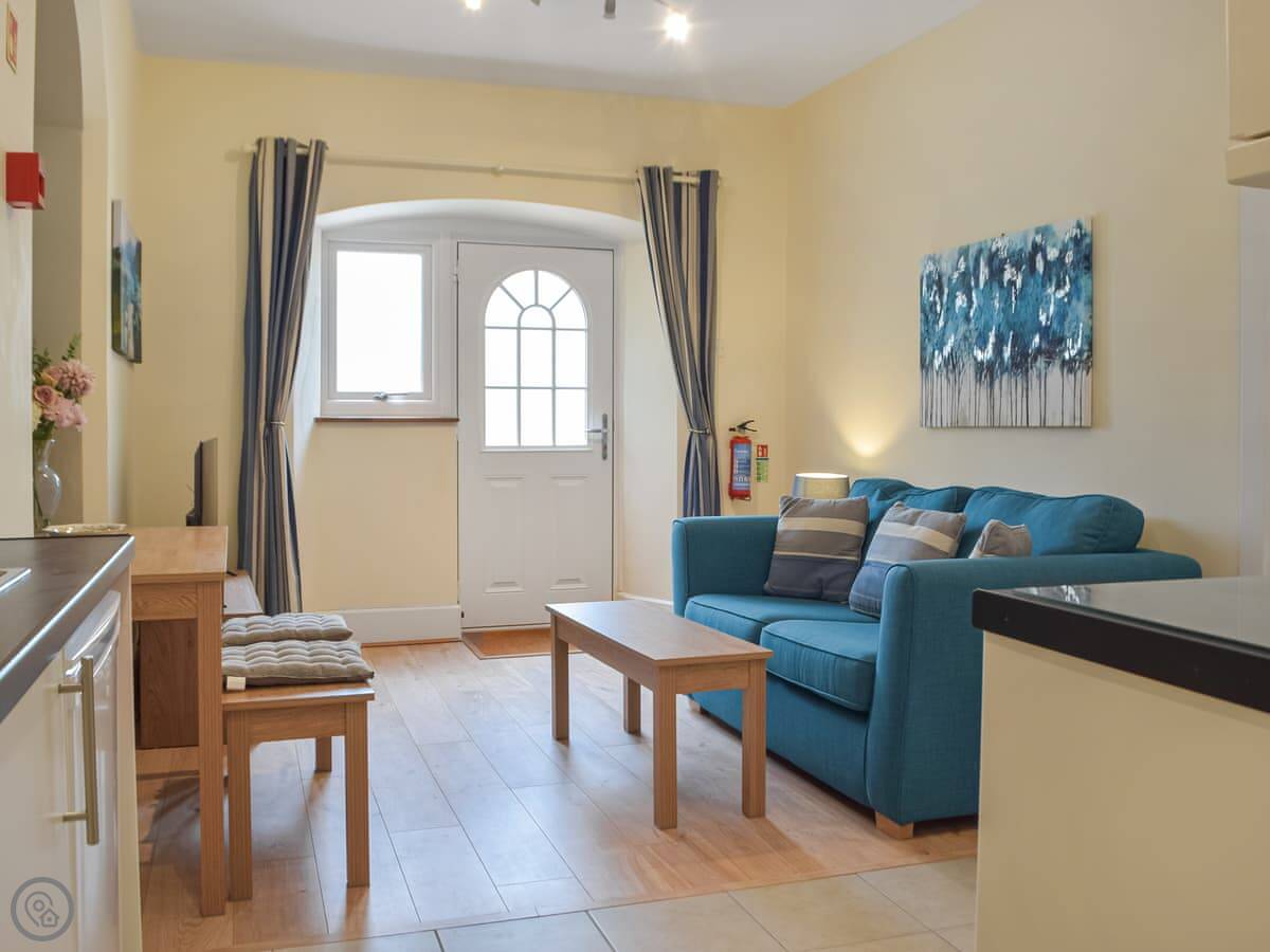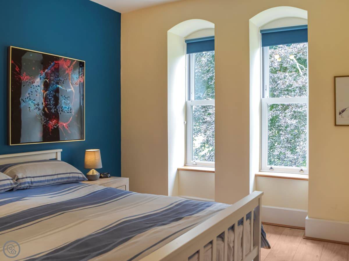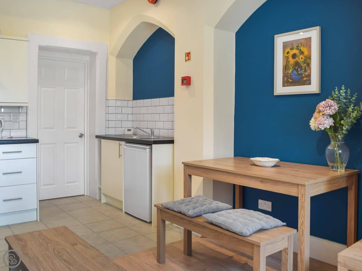 Olive Blossom is one of the apartments inside the old vicarage here in Llanfynydd. It's a first-floor flat, so you have stairs to get up to it. The building's Victorian, so the ceilings are high and the rooms feel quite spacious. You get your own patio area outside.